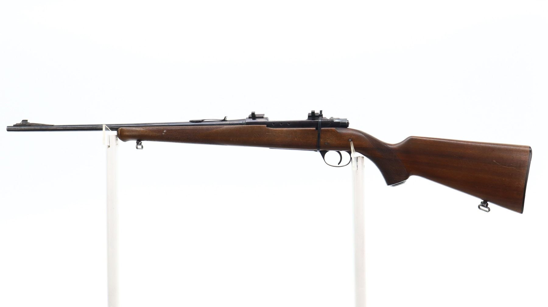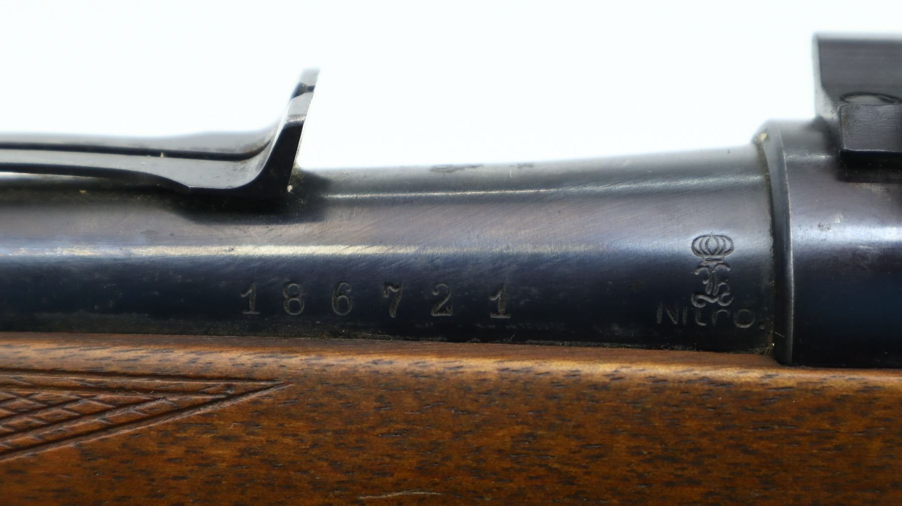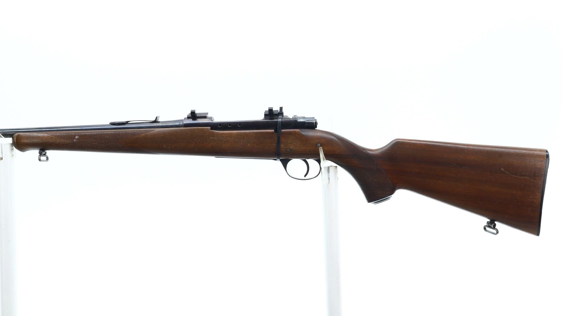 4/10, HUSQVARNA, MODEL: 1640, CALIBER:30-06 SPRG, BORE IS GOOD, SLIGHT WEAR. BLADE FRONT SIGHT WITH RAMP, U NOTCHED REAR SIGHT MISSING ELEVATOR, BLUED FINISH, RECEIVER DRILLED AND TAPPED WITH TWO PIECE SCOPE BASES, LEFT RECEIVER WALL DRILLED AND TAPPED FOR UNKNOWN SCOPE BASE, MISSING COMPLETE BOLT STOP ASSEMBLY. ONE PIECE WOOD STOCK, SCHNABEL FOREND TIP, CHECKERED FOREARM AND PISTOL GRIP, STOCK CRACKED AND REPAIRED BEHIND RECEIVER, GROOVED BLACK POLYMER BUTT PLATE, GRIP CAP, HINGED FLOOR PLATE MISSING LATCH ASSEMBLY, SLING SWIVELS. METAL FINISH SHOWS SCRATCHES, HANDLING MARKS AND WEAR. STOCK SHOWS MARKS, SCRATCHES AND WEAR. , ACTION: BOLT ACTION RIFLE, BARREL LENGTH: 20.5", SERIAL # 186721, CONDITION: 4/10, CLASS: CANADIAN NON RESTRICTED