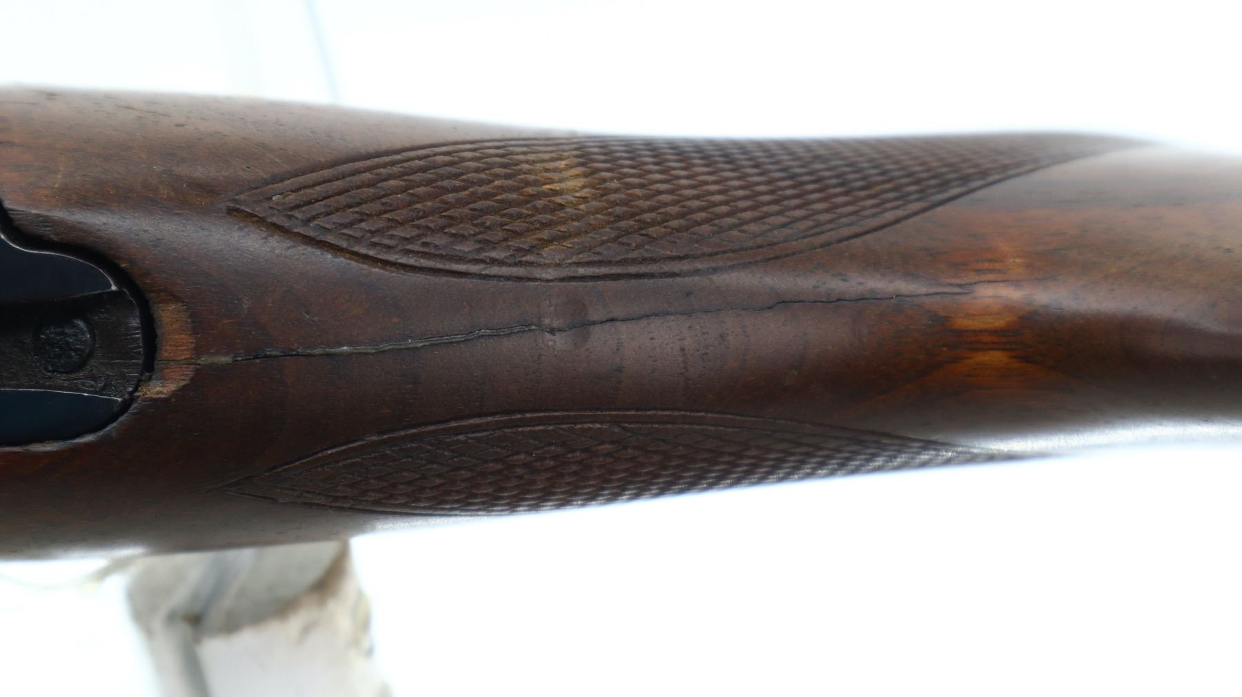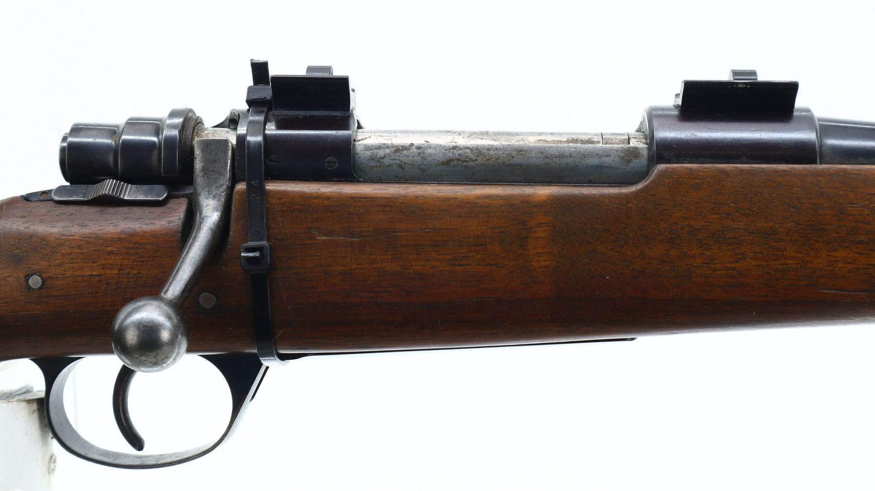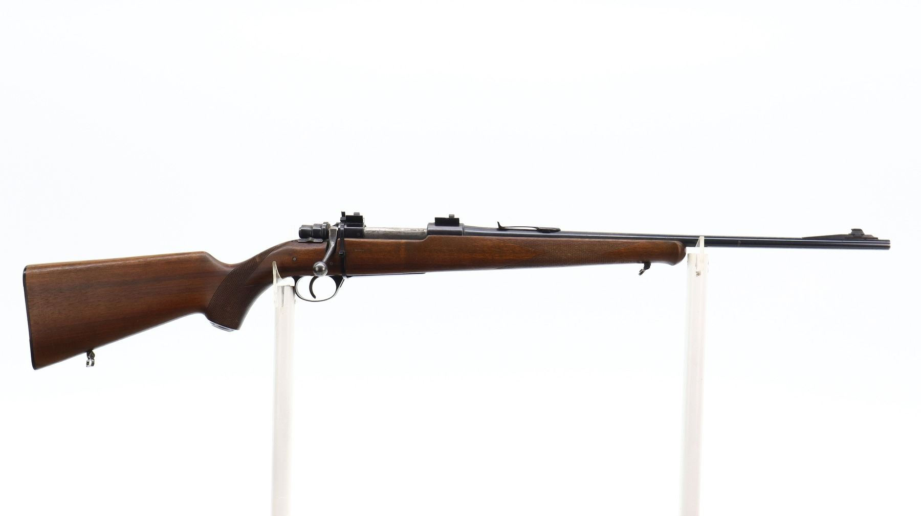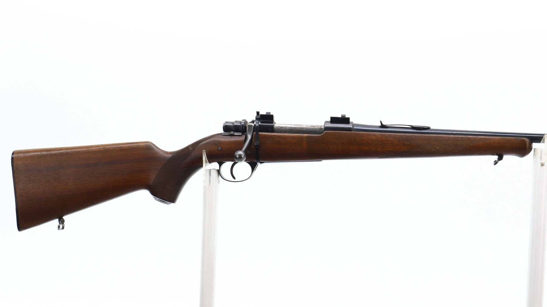 4/10, HUSQVARNA, MODEL: 1640, CALIBER:30-06 SPRG, BORE IS GOOD, SLIGHT WEAR. BLADE FRONT SIGHT WITH RAMP, U NOTCHED REAR SIGHT MISSING ELEVATOR, BLUED FINISH, RECEIVER DRILLED AND TAPPED WITH TWO PIECE SCOPE BASES, LEFT RECEIVER WALL DRILLED AND TAPPED FOR UNKNOWN SCOPE BASE, MISSING COMPLETE BOLT STOP ASSEMBLY. ONE PIECE WOOD STOCK, SCHNABEL FOREND TIP, CHECKERED FOREARM AND PISTOL GRIP, STOCK CRACKED AND REPAIRED BEHIND RECEIVER, GROOVED BLACK POLYMER BUTT PLATE, GRIP CAP, HINGED FLOOR PLATE MISSING LATCH ASSEMBLY, SLING SWIVELS. METAL FINISH SHOWS SCRATCHES, HANDLING MARKS AND WEAR. STOCK SHOWS MARKS, SCRATCHES AND WEAR. , ACTION: BOLT ACTION RIFLE, BARREL LENGTH: 20.5", SERIAL # 186721, CONDITION: 4/10, CLASS: CANADIAN NON RESTRICTED