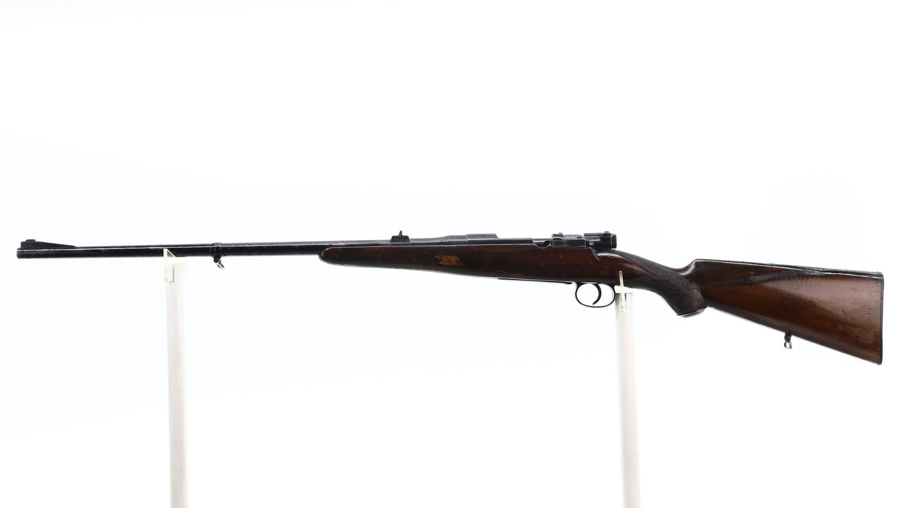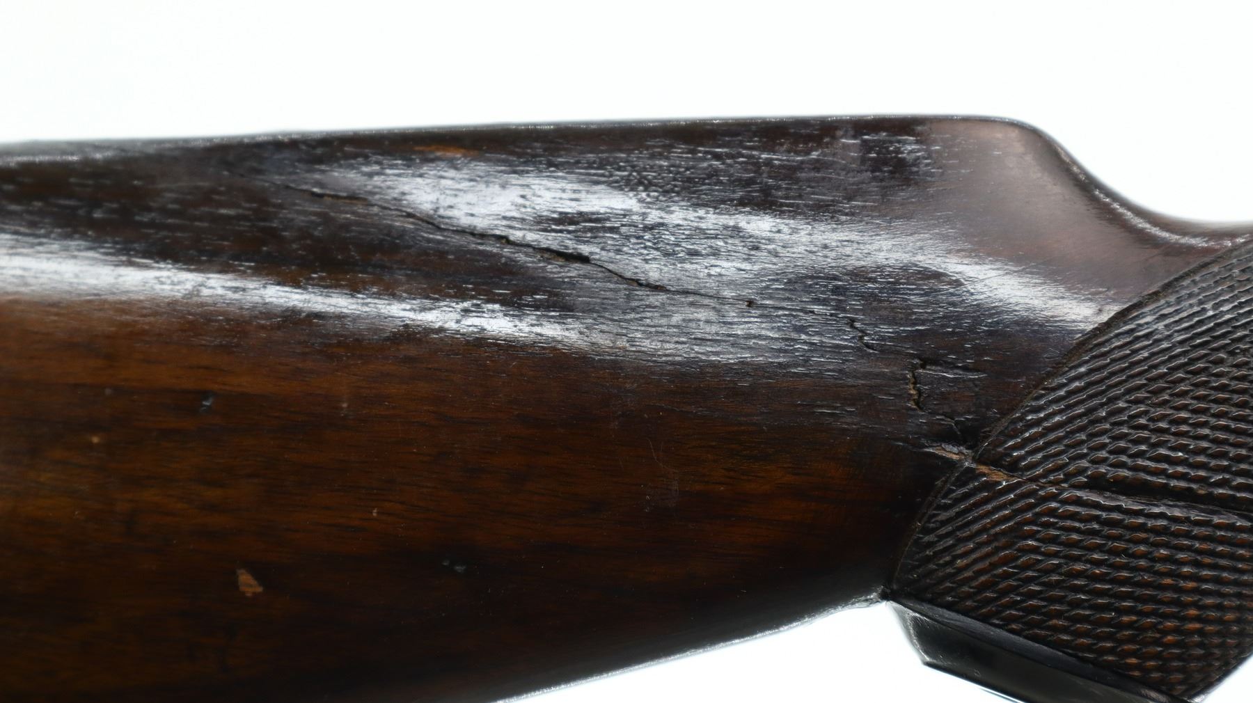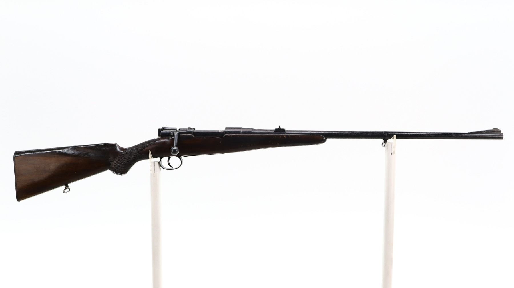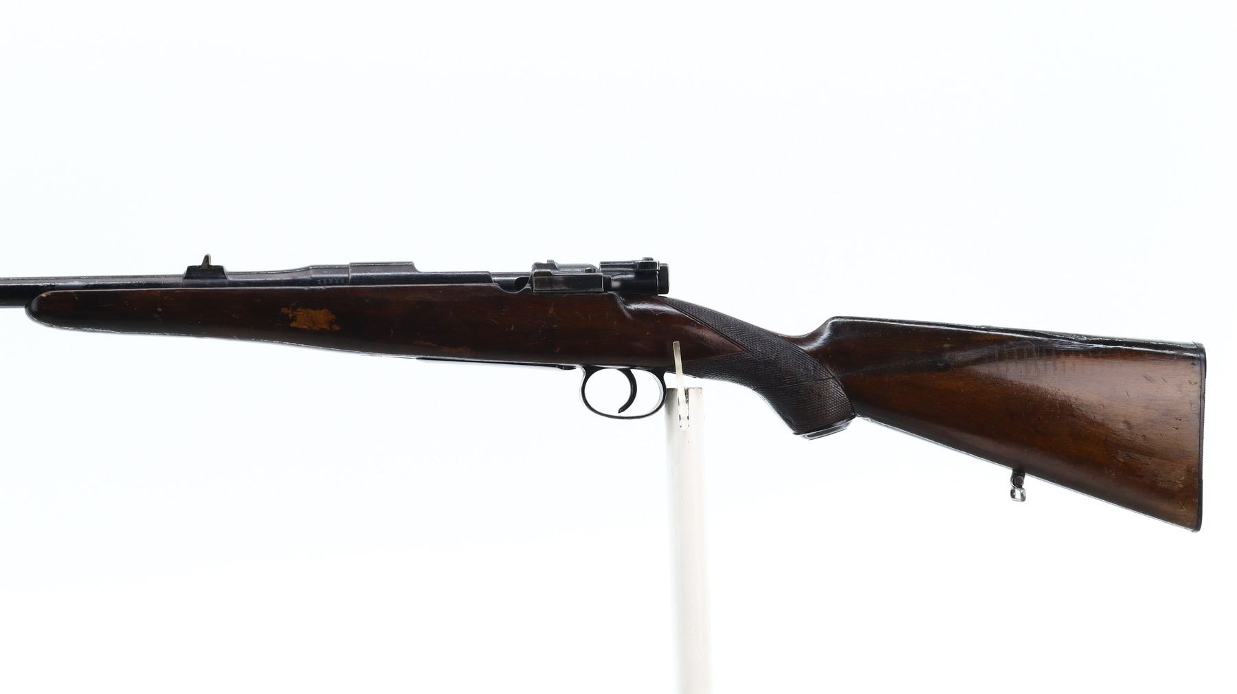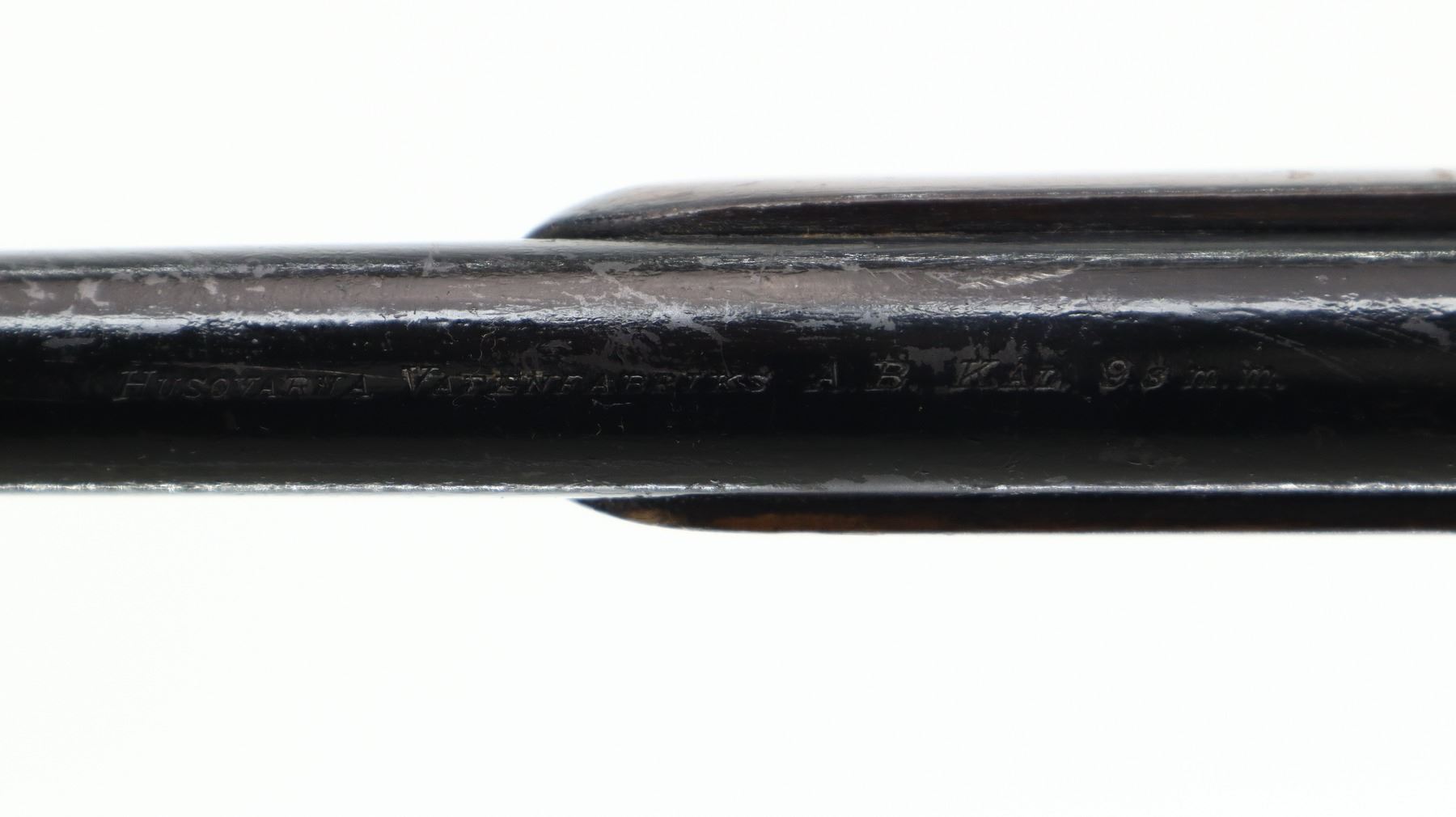3/10, HUSQVARNA, MODEL: SMALL RING SPORTER, CALIBER:9.3 X 57, BORE IS FAIR, WORN, LIGHT PITTING. BLADE FRONT SIGHT WITH RAMP, U NOTCHED REAR SIGHT, METAL PAINTED BLACK, TURNED DOWN BOLT HANDLE. ONE PIECE WOOD STOCK, CHECKERED PISTOL GRIP, STOCK CRACKED AND REPAIRED THROUGH WRIST, GROOVED BLACK POLYMER BUTT PLATE, GRIP CAP, SLING SWIVELS. METAL FINISH SHOWS SOME SCRATCHES, HANDLING MARKS AND WEAR. STOCK SHOWS SOME MARKS, SCRATCHES AND WEAR. , ACTION: BOLT ACTION RIFLE, BARREL LENGTH: 24.25", SERIAL # 13239, CONDITION: 3/10, CLASS: CANADIAN NON RESTRICTED