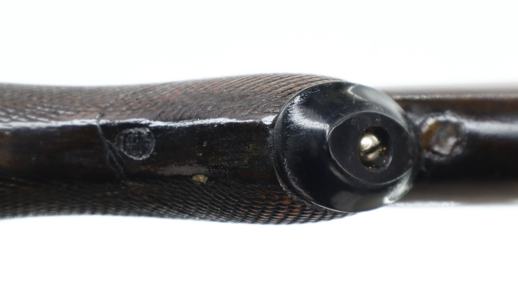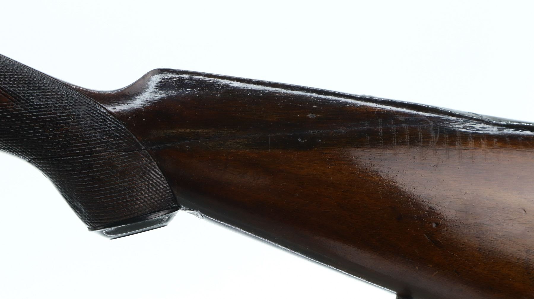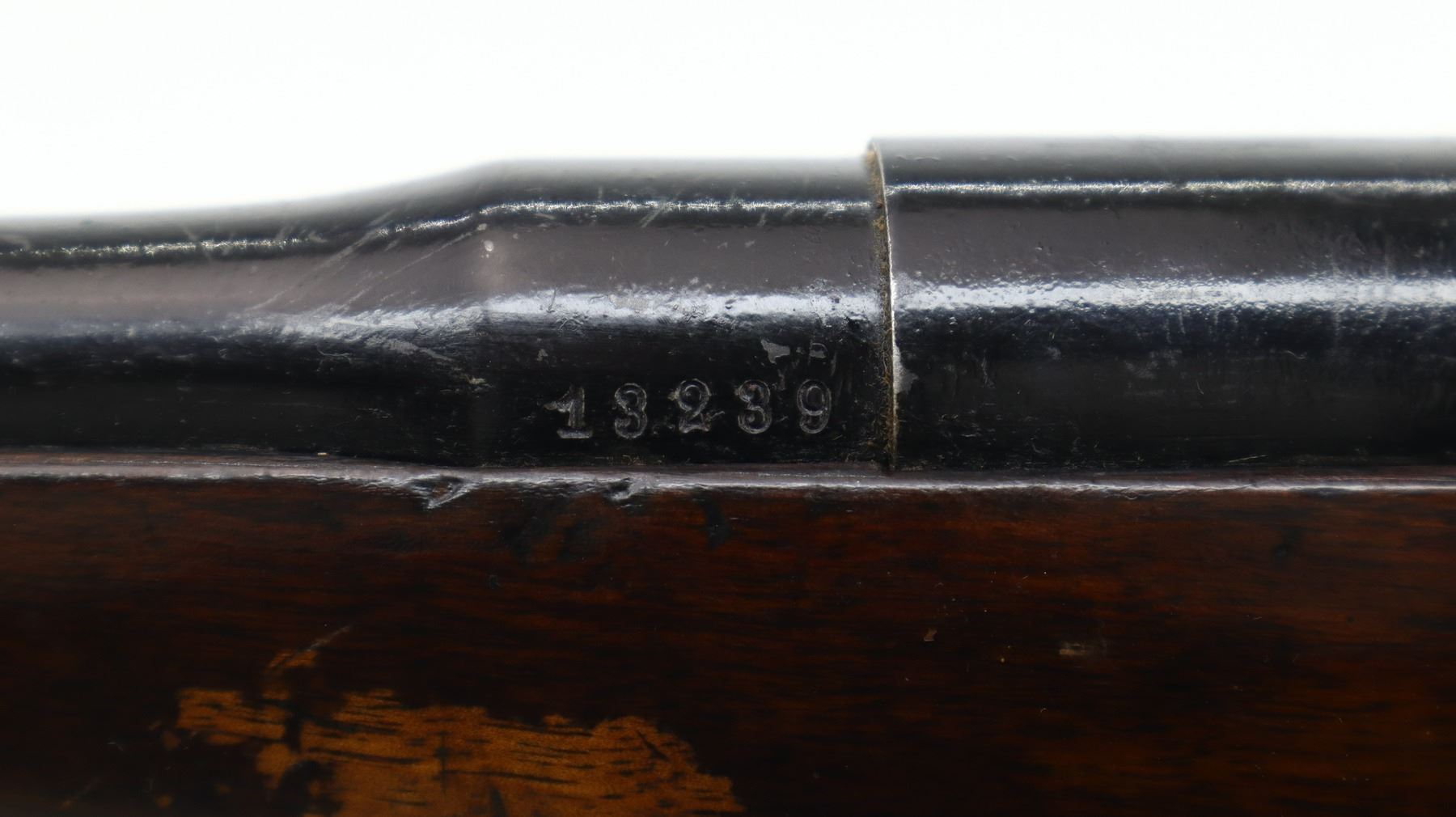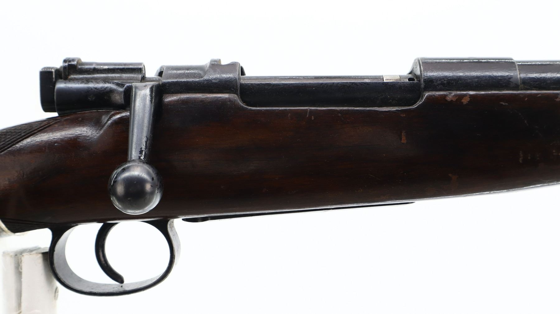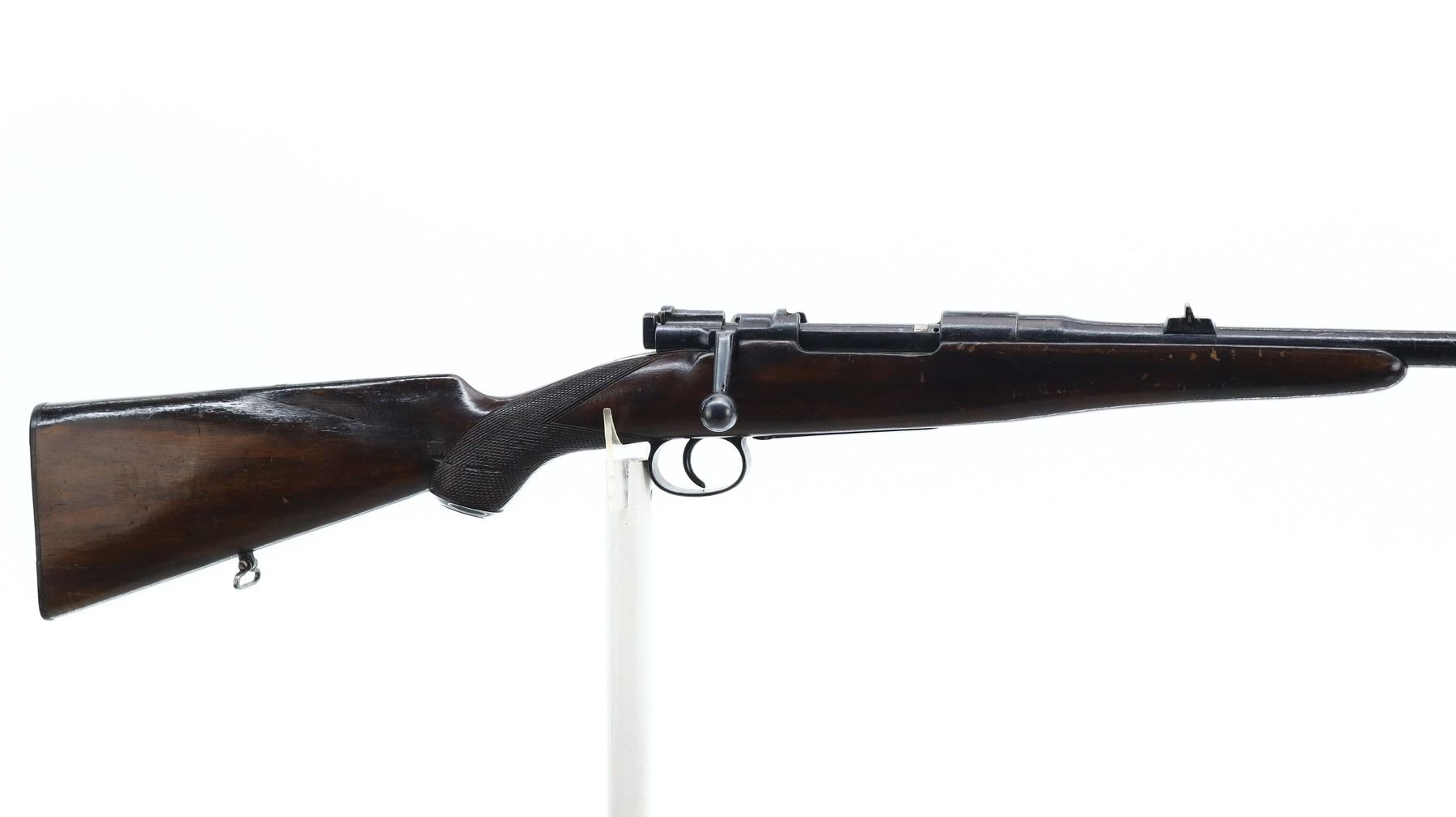 3/10, HUSQVARNA, MODEL: SMALL RING SPORTER, CALIBER:9.3 X 57, BORE IS FAIR, WORN, LIGHT PITTING. BLADE FRONT SIGHT WITH RAMP, U NOTCHED REAR SIGHT, METAL PAINTED BLACK, TURNED DOWN BOLT HANDLE. ONE PIECE WOOD STOCK, CHECKERED PISTOL GRIP, STOCK CRACKED AND REPAIRED THROUGH WRIST, GROOVED BLACK POLYMER BUTT PLATE, GRIP CAP, SLING SWIVELS. METAL FINISH SHOWS SOME SCRATCHES, HANDLING MARKS AND WEAR. STOCK SHOWS SOME MARKS, SCRATCHES AND WEAR. , ACTION: BOLT ACTION RIFLE, BARREL LENGTH: 24.25", SERIAL # 13239, CONDITION: 3/10, CLASS: CANADIAN NON RESTRICTED