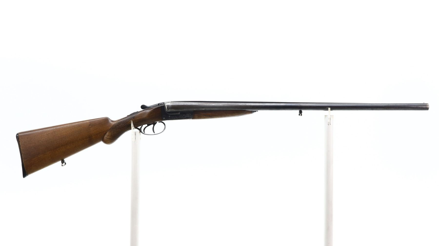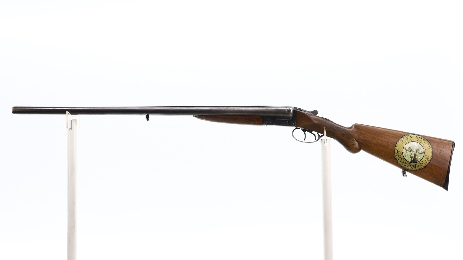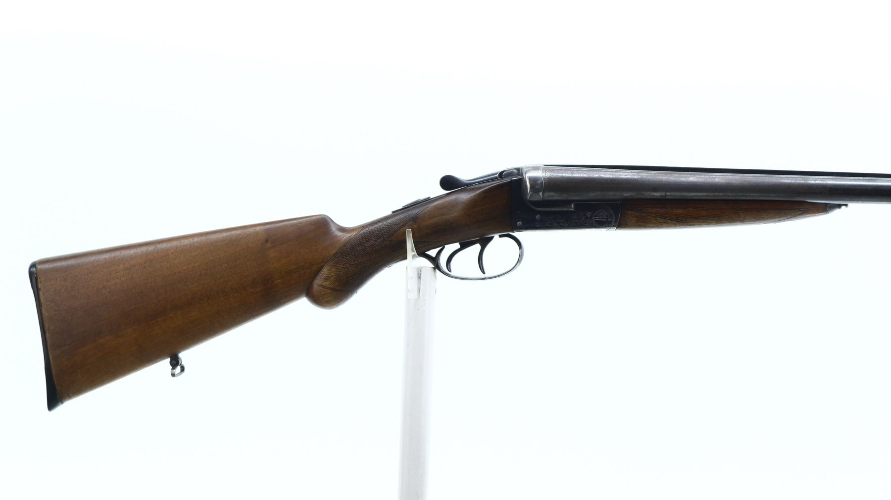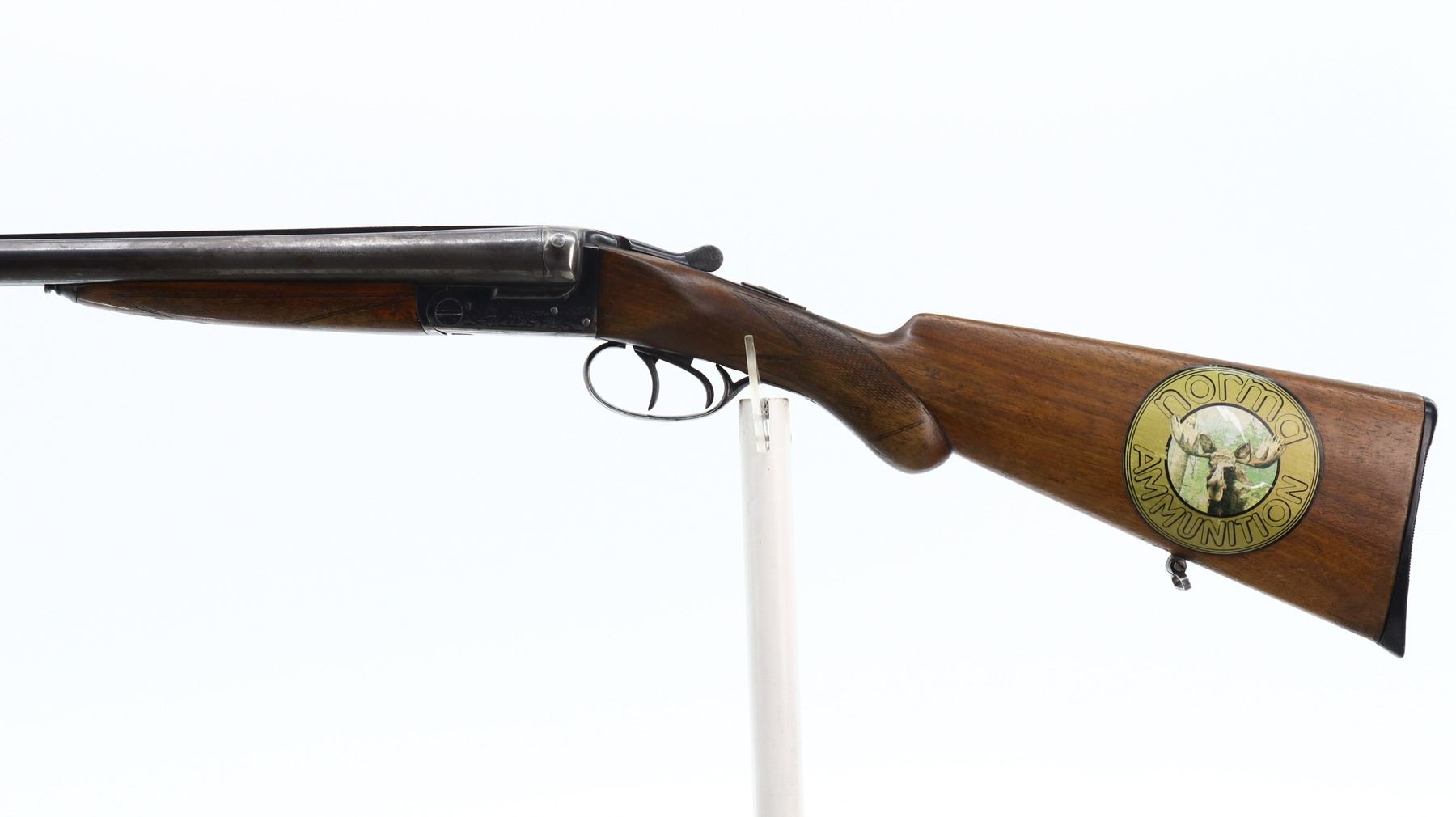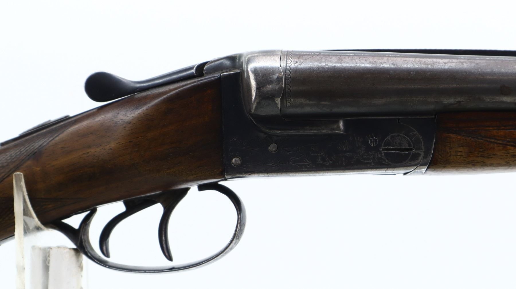 4/10, F DUMOULIN, MODEL: SIDE BY SIDE HAMMERLESS, CALIBER:12 G X 2 3/4", BORES ARE GOOD, LIGHT PITTING. FIXED FULL CHOKES. BRASS BEAD, BLUED FINISH, RAISED RIB, GAME SCENE ENGRAVED RECEIVER, AUTOMATIC SAFETY, EXTRACTOR, DOUBLE TRIGGERS, OPENING LEVER DOES NOT CLOSE PROPERLY ACTION DOES NOT FUNCTION REQUIRES REPAIR. TWO PIECE WOOD STOCKS, CHECKERED FOREARM AND PISTOL GRIP, GROOVED BLACK POLYMER BUTT PLATE, LEFT SIDE OF STOCK HAS NORMA AMMUNITION STICKER, SLING SWIVELS. METAL FINISH SHOWS SOME LIGHT RUST SPECKLES, SCRATCHES, HANDLING MARKS AND WEAR. STOCKS SHOW SOME MARKS, SCRATCHES AND WEAR. , ACTION: HINGED SIDE BY SIDE SHOTGUN, BARREL LENGTH: 27.5", SERIAL # 90348, CONDITION: 4/10, CLASS: CANADIAN NON RESTRICTED