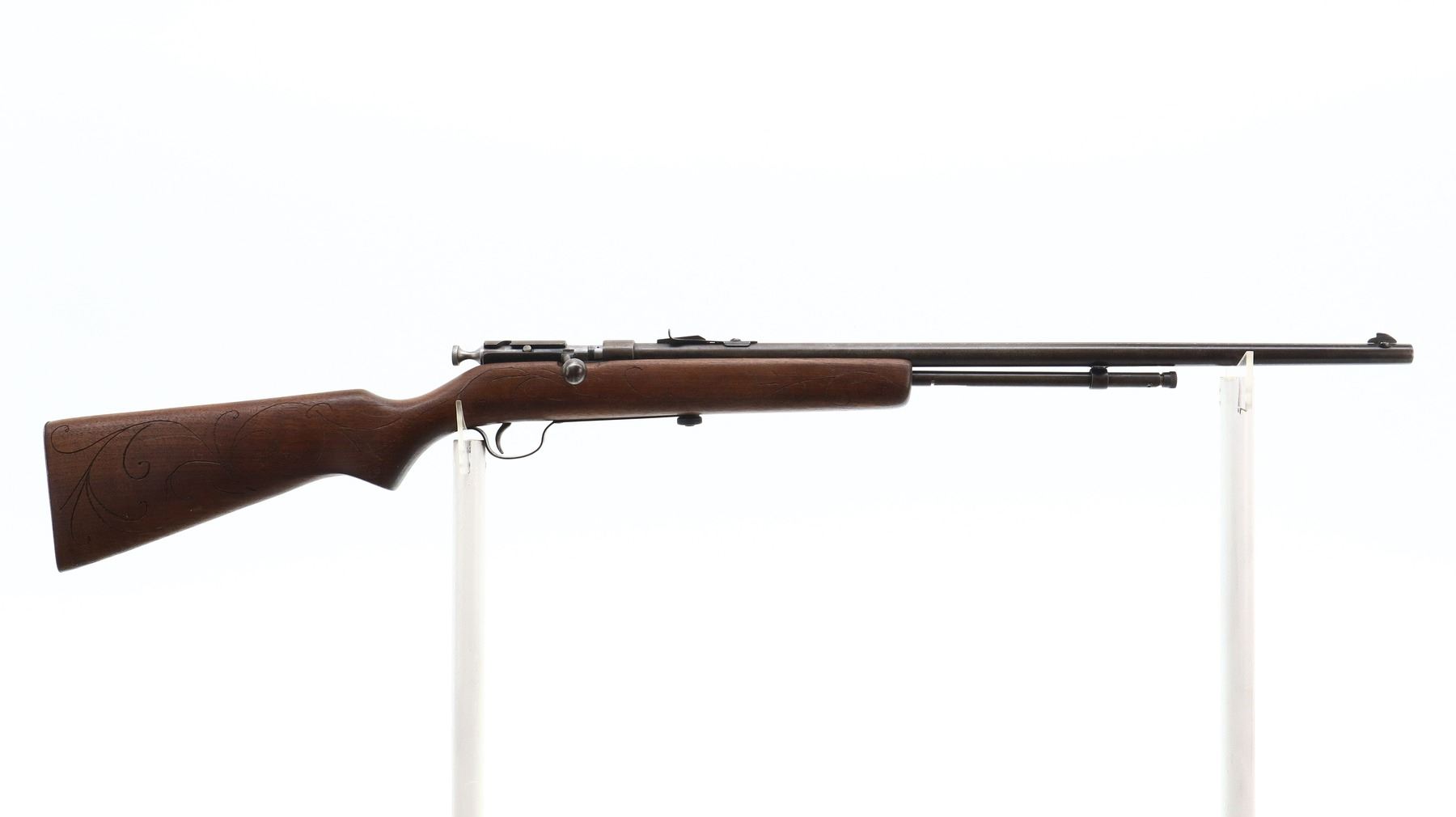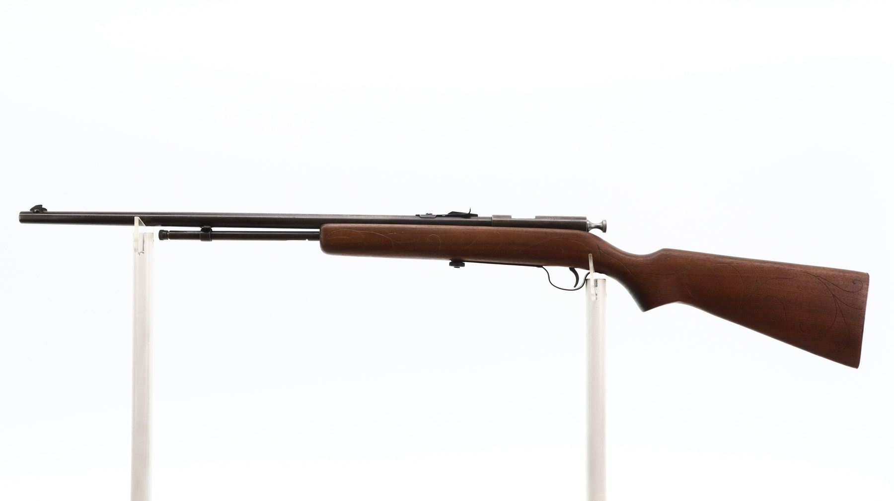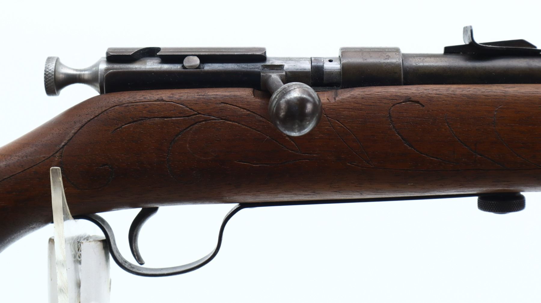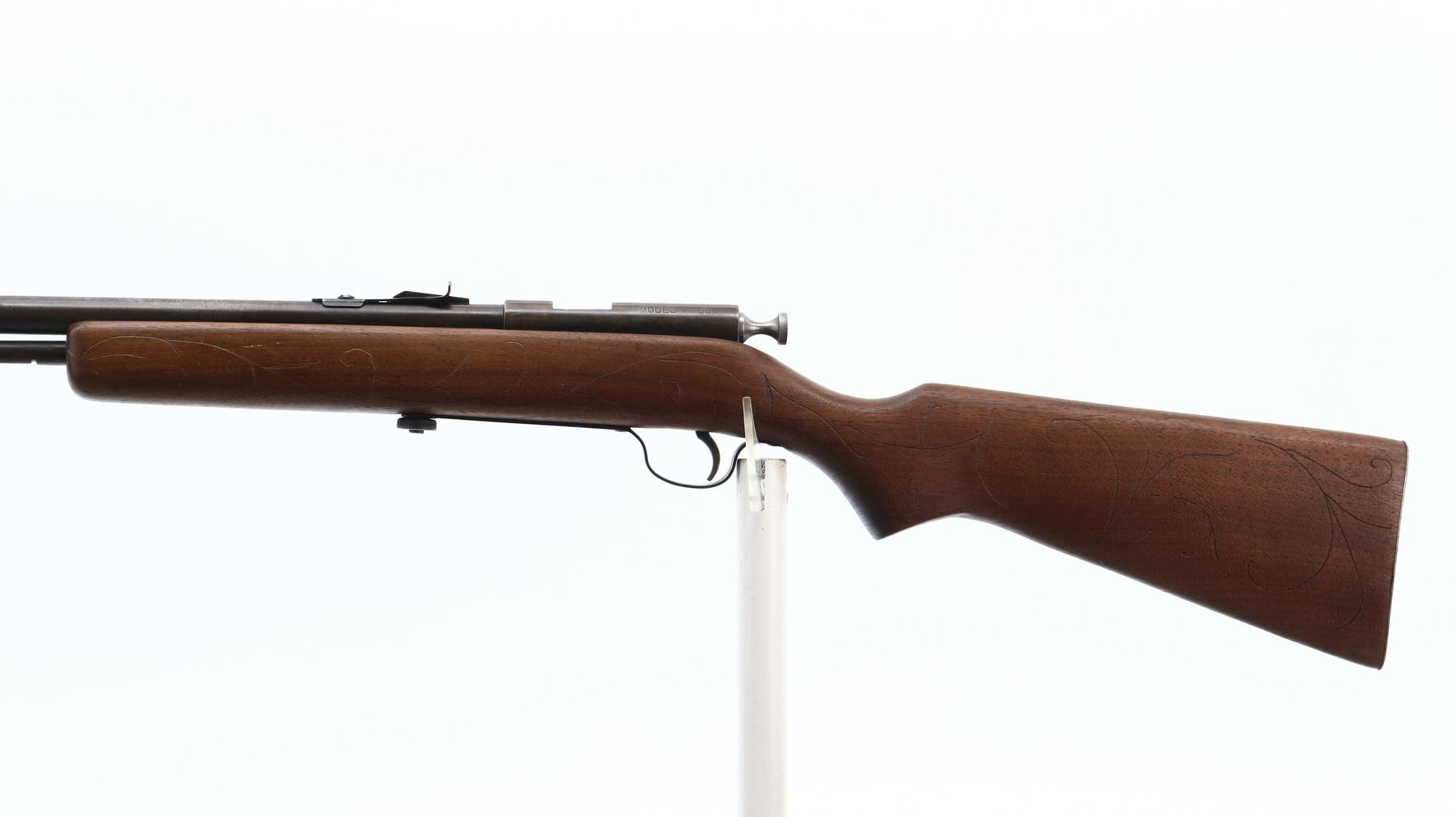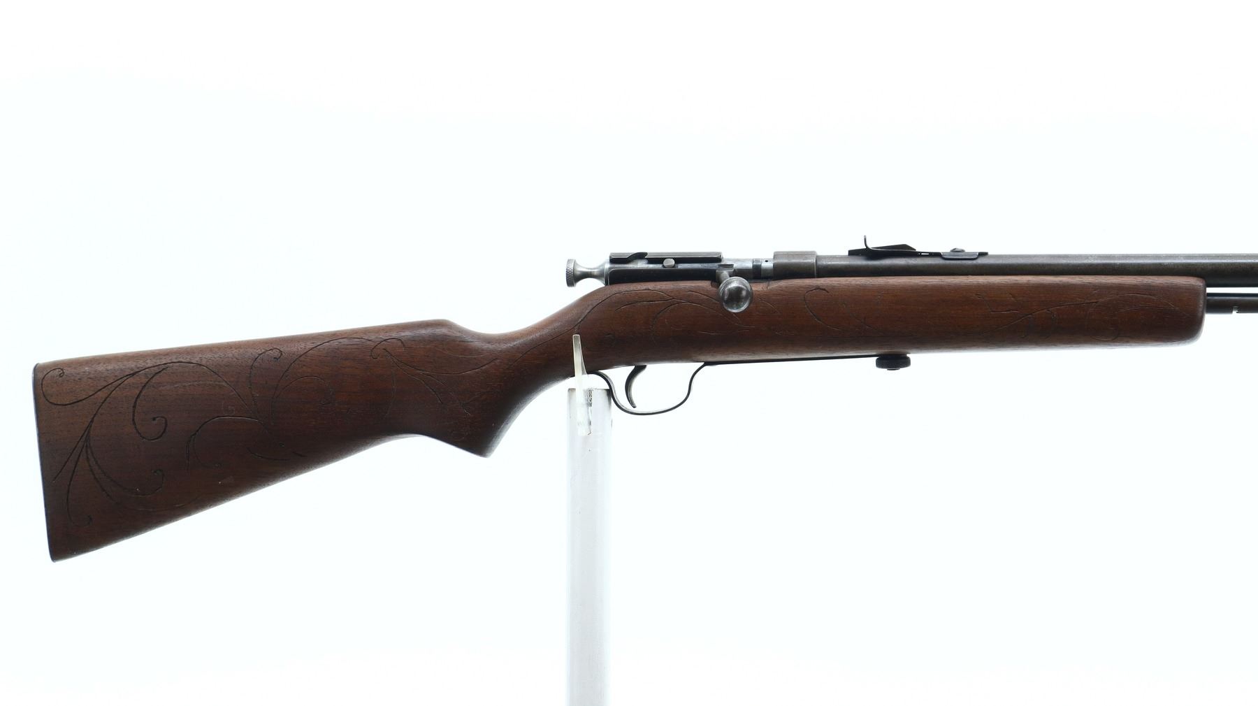 4/10, COOEY, MODEL: 60, CALIBER:22 LR, BORE IS VERY GOOD. BLADE FRONT SIGHT, ADJUSTABLE U NOTCHED REAR SIGHT WITH REPLACED ELEVATOR. ONE PIECE SMOOTH WOOD STOCK, PISTOL GRIP, SMOOTH STEEL BUTT PLATE, STOCK HAS UNIQUE CARVINGS AND 3 /4 LENGTH MAG TUBE. METAL FINISH TURNING BROWN WITH LIGHT RUST SPECKLES, HANDLING MARKS AND WEAR. STOCK SHOWS MARKS, SCRATCHES AND WEAR. , ACTION: BOLT ACTION RIFLE, BARREL LENGTH: 23.75", SERIAL # NA, CONDITION: 4/10, CLASS: CANADIAN NON RESTRICTED
