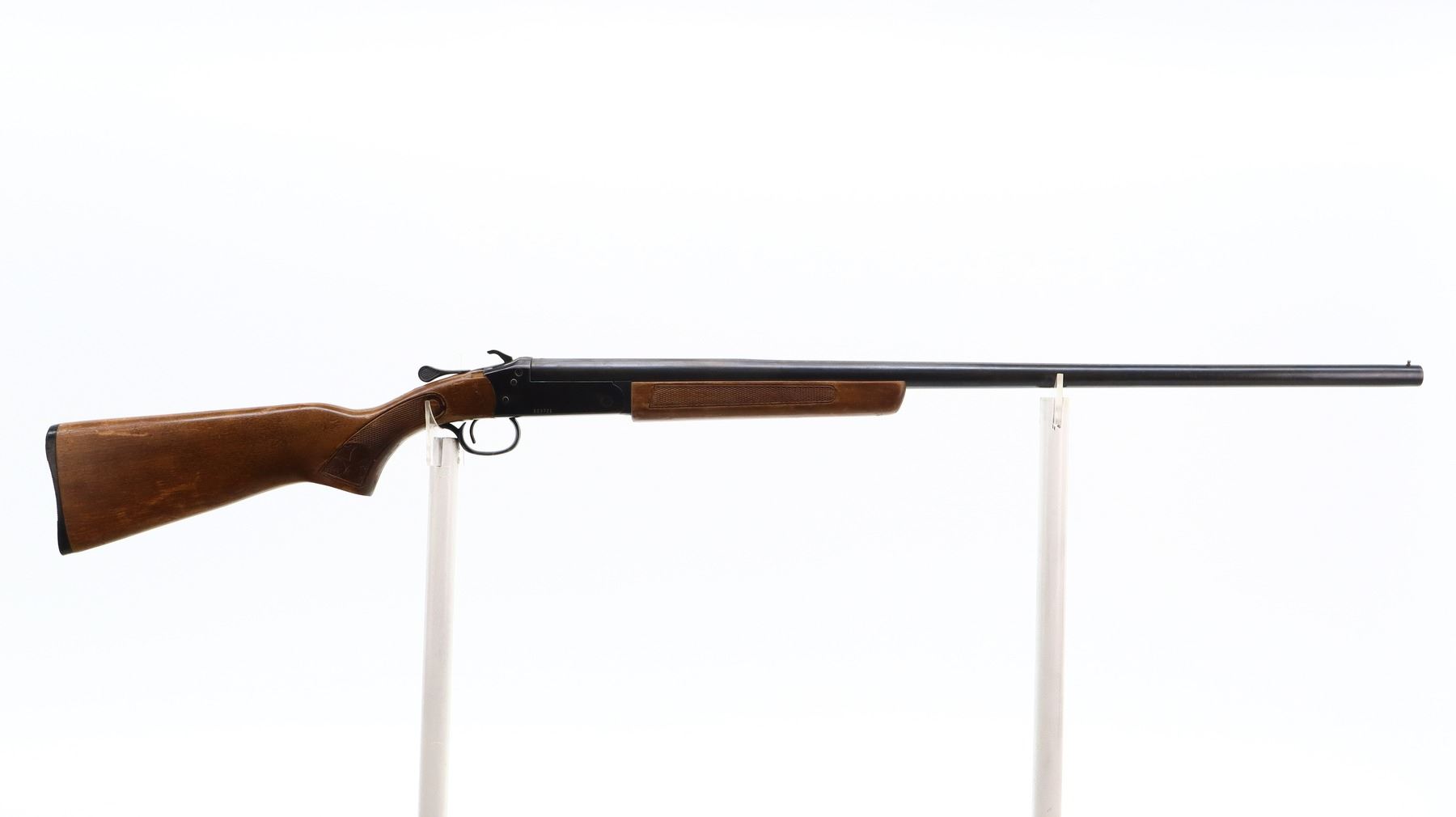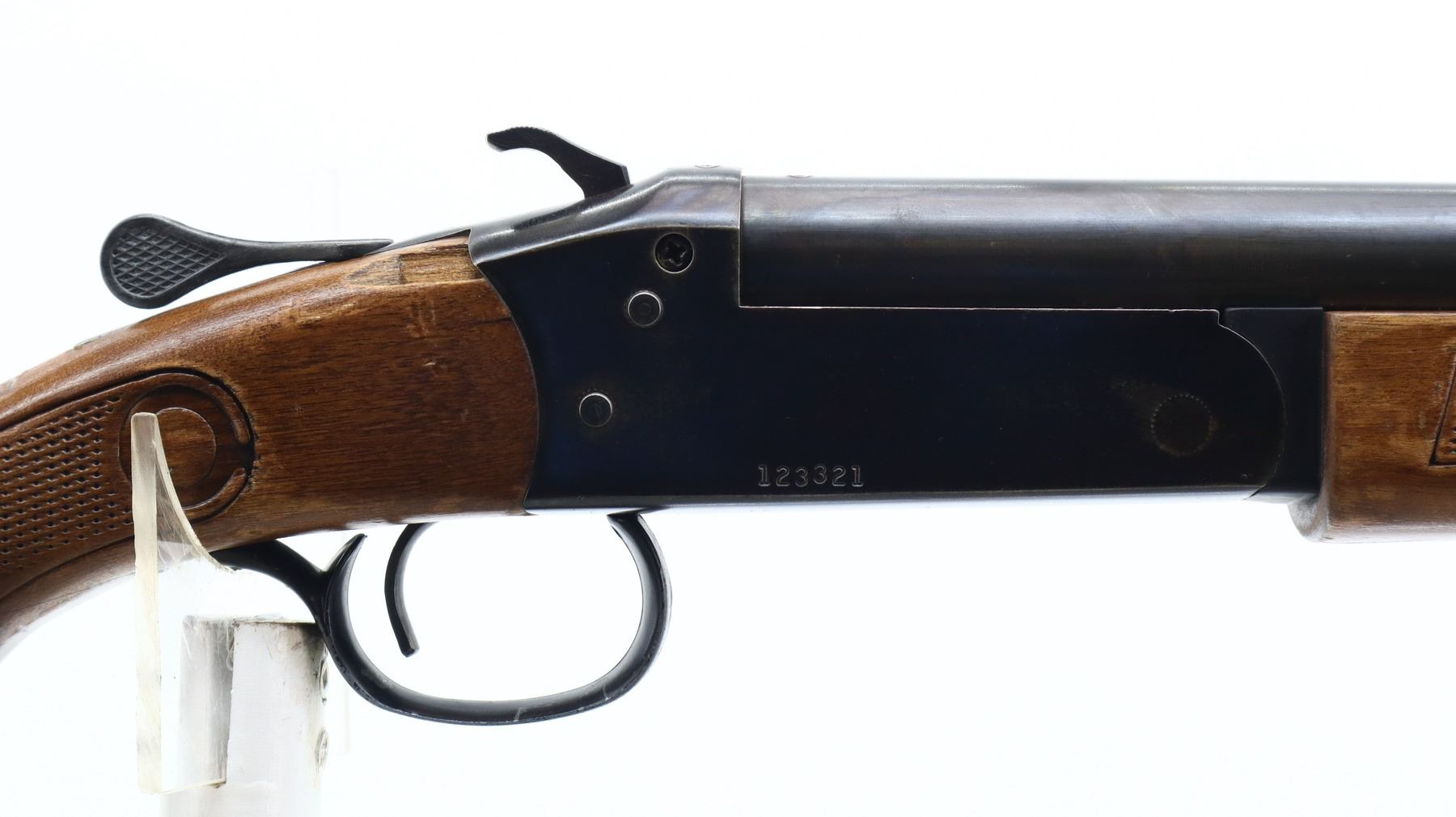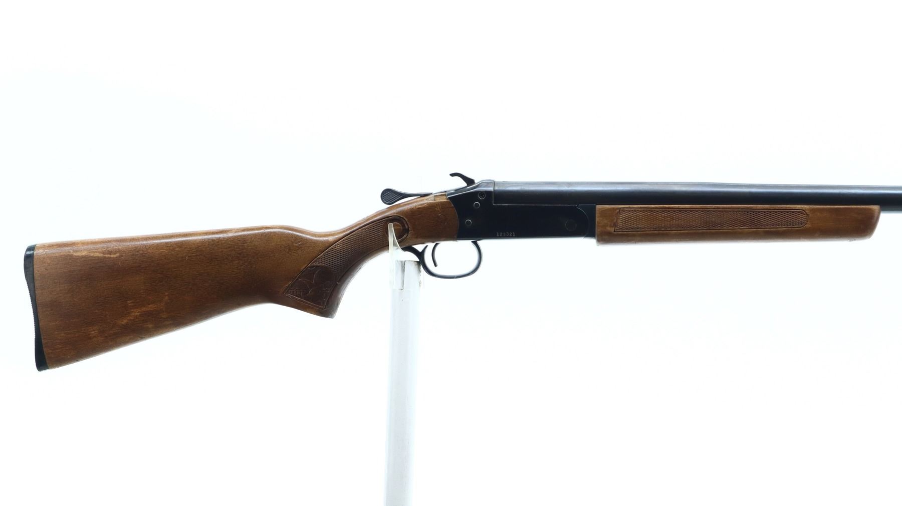 4/10, COOEY/WINCHESTER, MODEL: 840, CALIBER:16 G X 2 3/4", BORE IS GOOD. FIXED FULL CHOKE. BRASS BEAD, ROUND BARREL, GROOVED SPUR HAMMER, EJECTOR. TWO PIECE WOOD STOCKS, CHECKERED FOREARM AND PISTOL GRIP (CRACKED BEHIND UPPER AND LOWER TANGS), GROOVED BLACK POLYMER BUTT PLATE. METAL FINISH TURNING BROWN WITH SCRATCHES, HANDLING MARKS AND WEAR. STOCKS SHOW MARKS, SCRATCHES AND WEAR. , ACTION: HINGED SINGLE SHOT SHOTGUN, BARREL LENGTH: 30", SERIAL # 123321, CONDITION: 4/10, CLASS: CANADIAN NON RESTRICTED