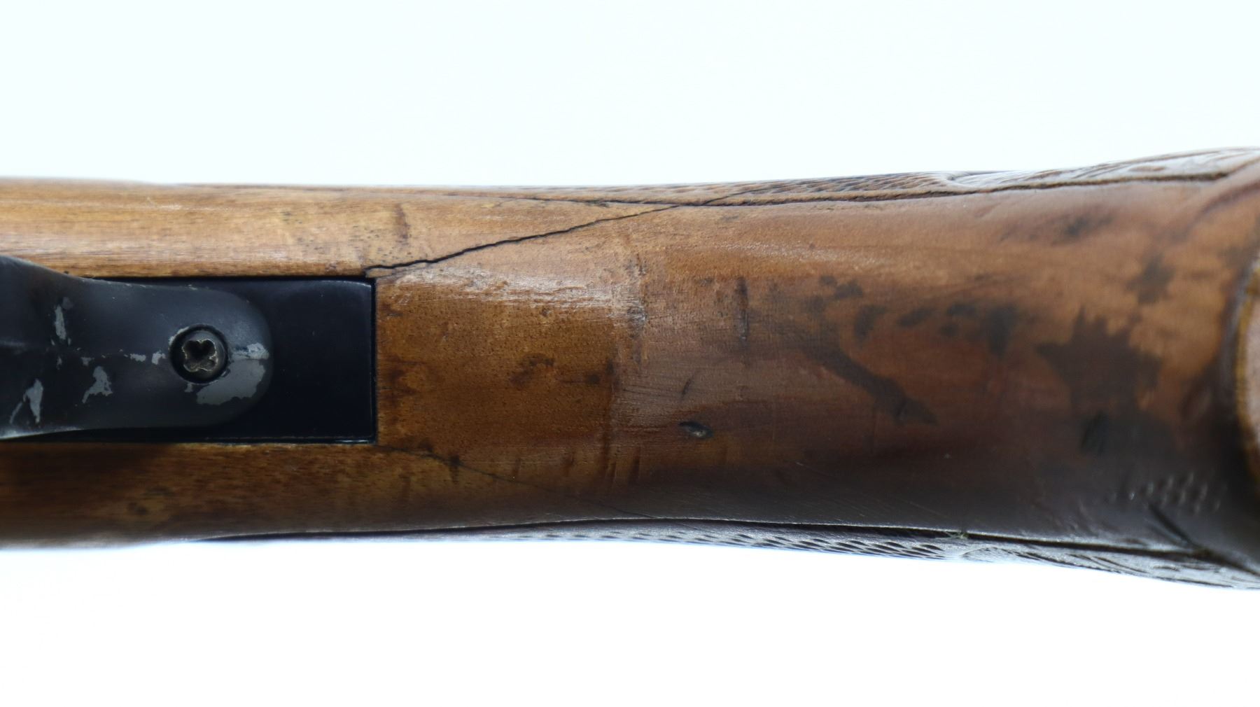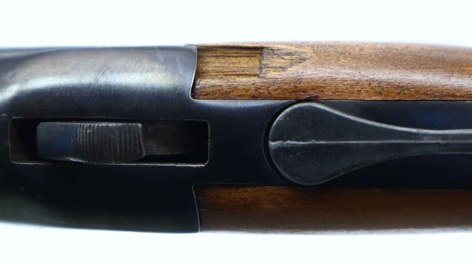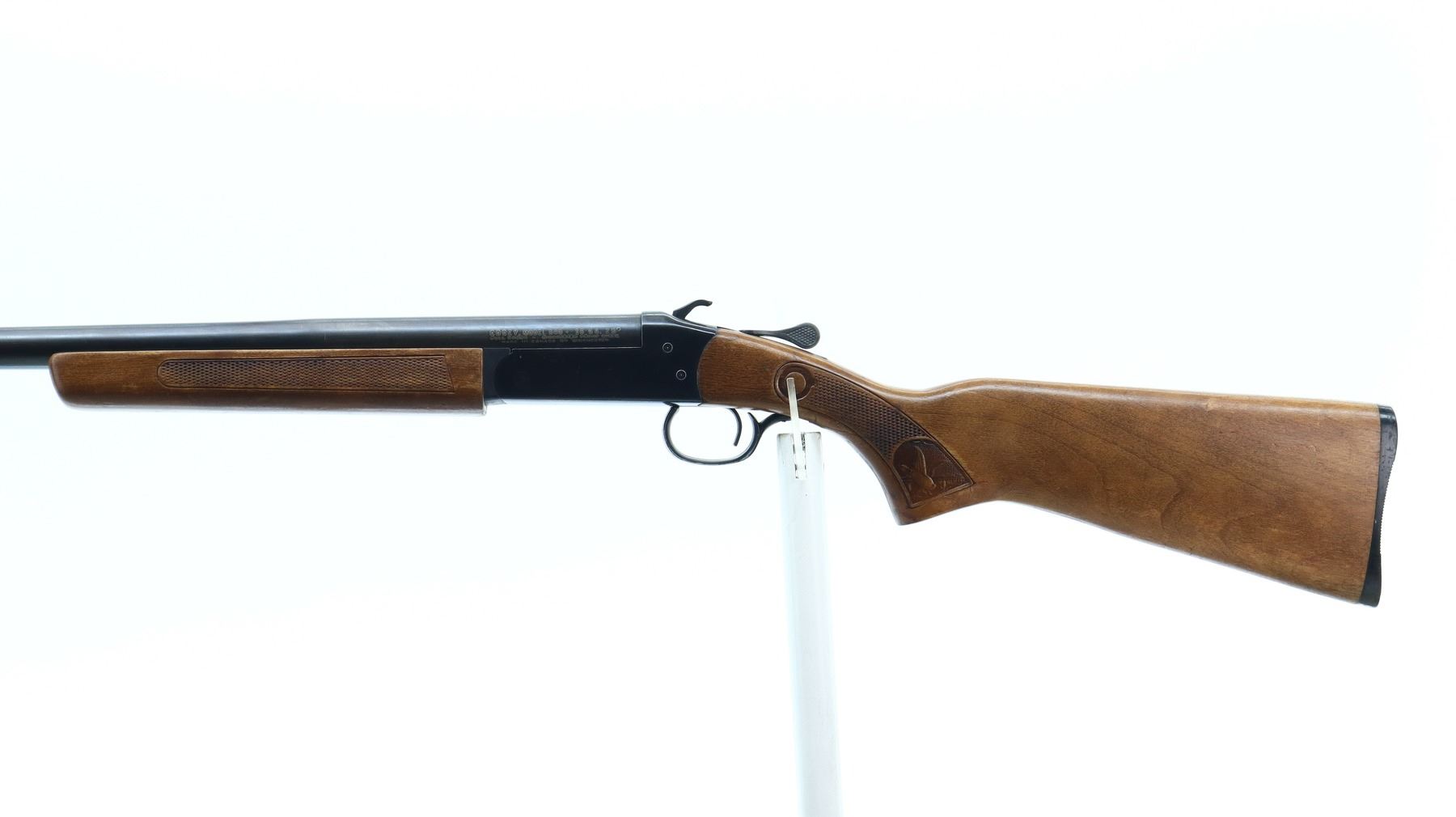 4/10, COOEY/WINCHESTER, MODEL: 840, CALIBER:16 G X 2 3/4", BORE IS GOOD. FIXED FULL CHOKE. BRASS BEAD, ROUND BARREL, GROOVED SPUR HAMMER, EJECTOR. TWO PIECE WOOD STOCKS, CHECKERED FOREARM AND PISTOL GRIP (CRACKED BEHIND UPPER AND LOWER TANGS), GROOVED BLACK POLYMER BUTT PLATE. METAL FINISH TURNING BROWN WITH SCRATCHES, HANDLING MARKS AND WEAR. STOCKS SHOW MARKS, SCRATCHES AND WEAR. , ACTION: HINGED SINGLE SHOT SHOTGUN, BARREL LENGTH: 30", SERIAL # 123321, CONDITION: 4/10, CLASS: CANADIAN NON RESTRICTED
