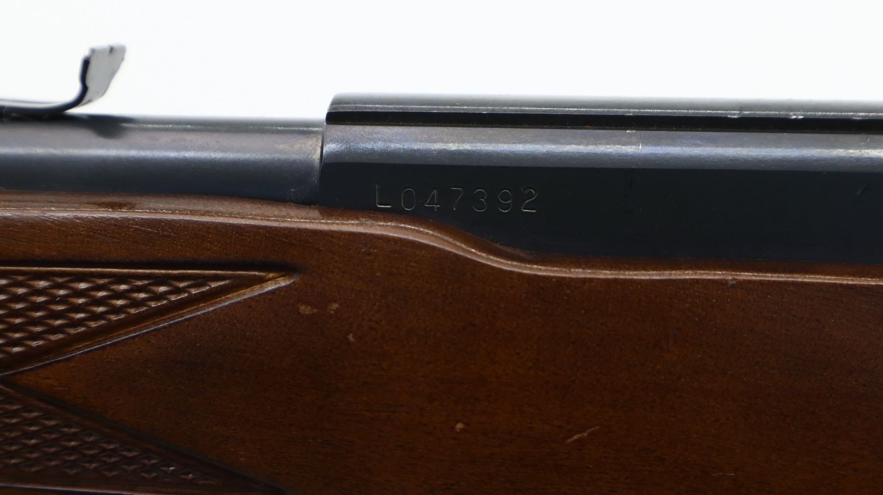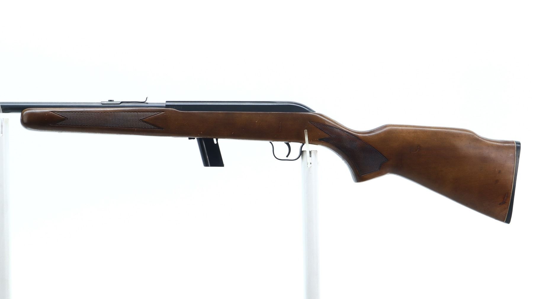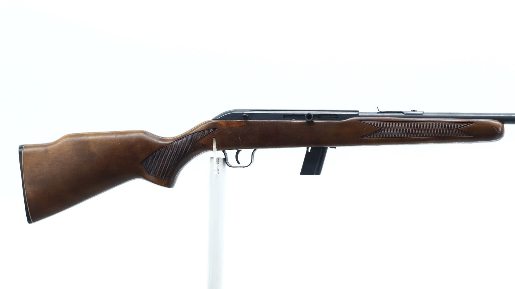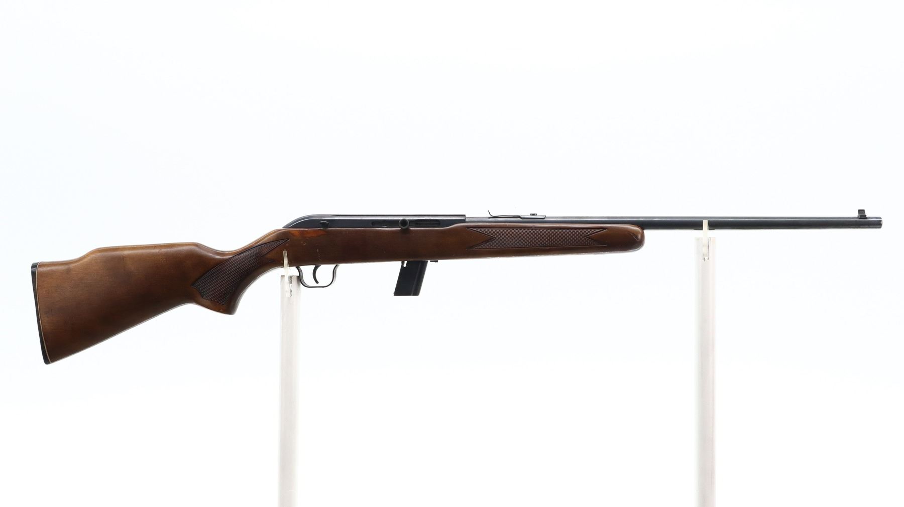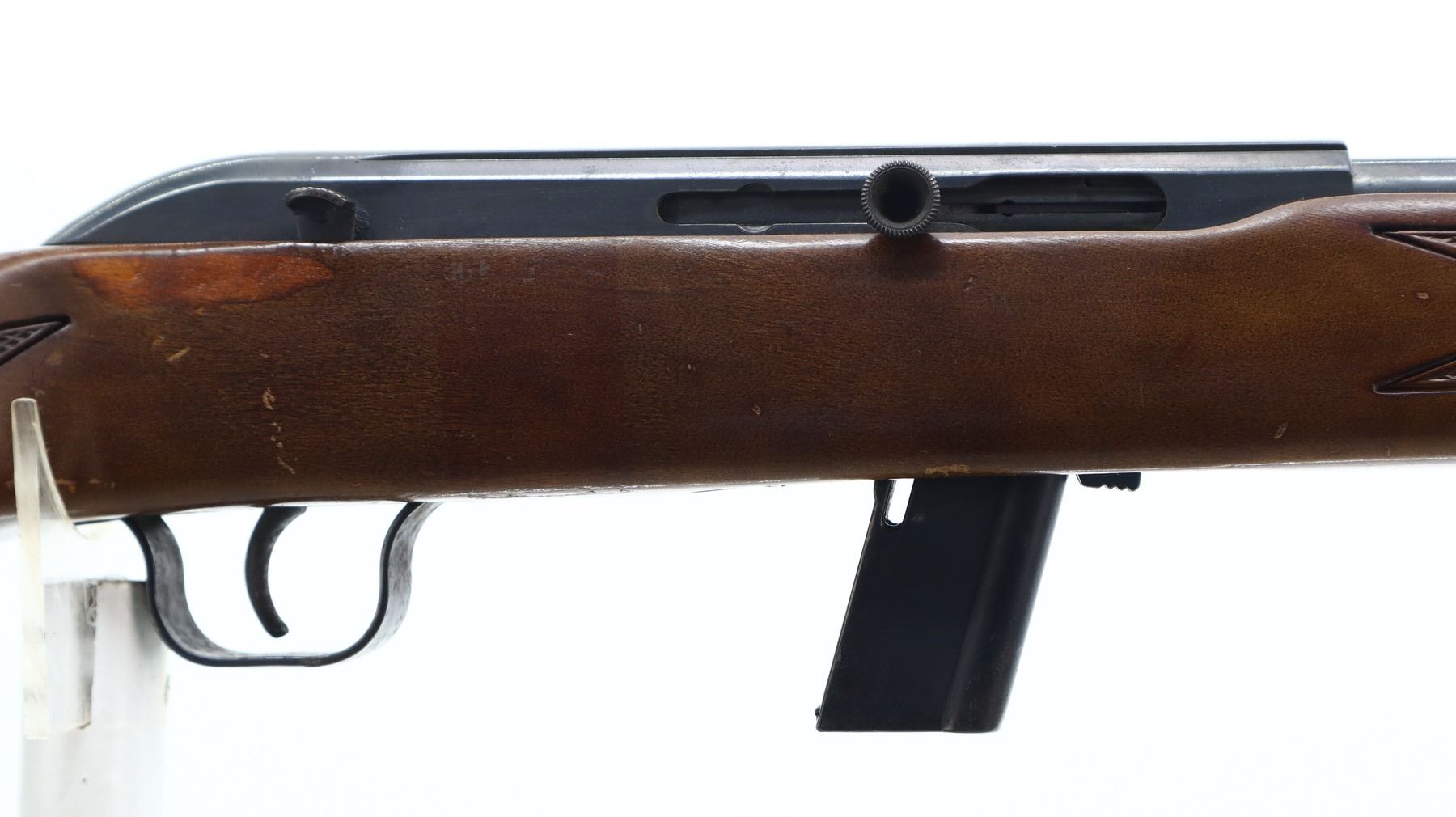 4/10, LAKEFIELD, MODEL: 64B, CALIBER:22 LR, COMES WITH MAGAZINE, BORE IS GOOD, LIGHT PITTING. BLADE FRONT SIGHT, U NOTCHED REAR SIGHT MISSING ELEVATOR, METAL PAINTED GREY, RECEIVER GROOVED FOR SCOPE MOUNT. ONE PIECE WOOD STOCK, CHECKERED FOREARM AND PISTOL GRIP, RAISED COMB, CHECKERED BLACK POLYMER BUTT PLATE. METAL FINISH SHOWS SCRATCHES, HANDLING MARKS AND WEAR. STOCK SHOWS MARKS, SCRATCHES AND WEAR. , ACTION: SEMI AUTOMATIC RIFLE, BARREL LENGTH: 20", SERIAL # L047392, CONDITION: 4/10, CLASS: CANADIAN NON RESTRICTED