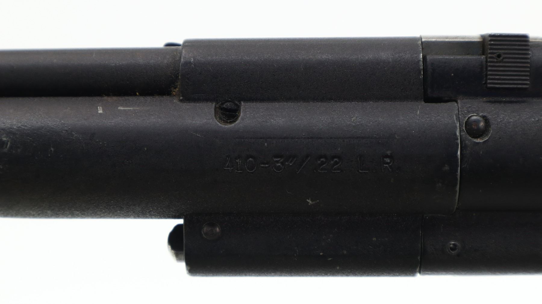 3/10, FI INDUSTRIES, MODEL: SURVIVAL RIFLE, CALIBER:22 LR / 410 G X .", BORES ARE GOOD. FIXED MOD CHOKE. POST FRONT SIGHT WITH RAMP, BLACK MATTE FINISH, MANUAL EXTRACTOR, BARREL DOES NOT LOCK IN THE CLOSED POSITION REQUIRES REPAIR/PARTS, CROSSBOLT SAFETY, OPENING LEVER IN FRONT OF TRIGGER GUARD. ONE PIECE METAL RECEIVER AND BUTT STOCK, GROOVED BUTT. METAL FINISH SHOWS SOME SCRATCHES, HANDLING MARKS AND WEAR. , ACTION: HINGED COMBINATION GUN, BARREL LENGTH: 20", SERIAL # A4040, CONDITION: 3/10, CLASS: CANADIAN NON RESTRICTED