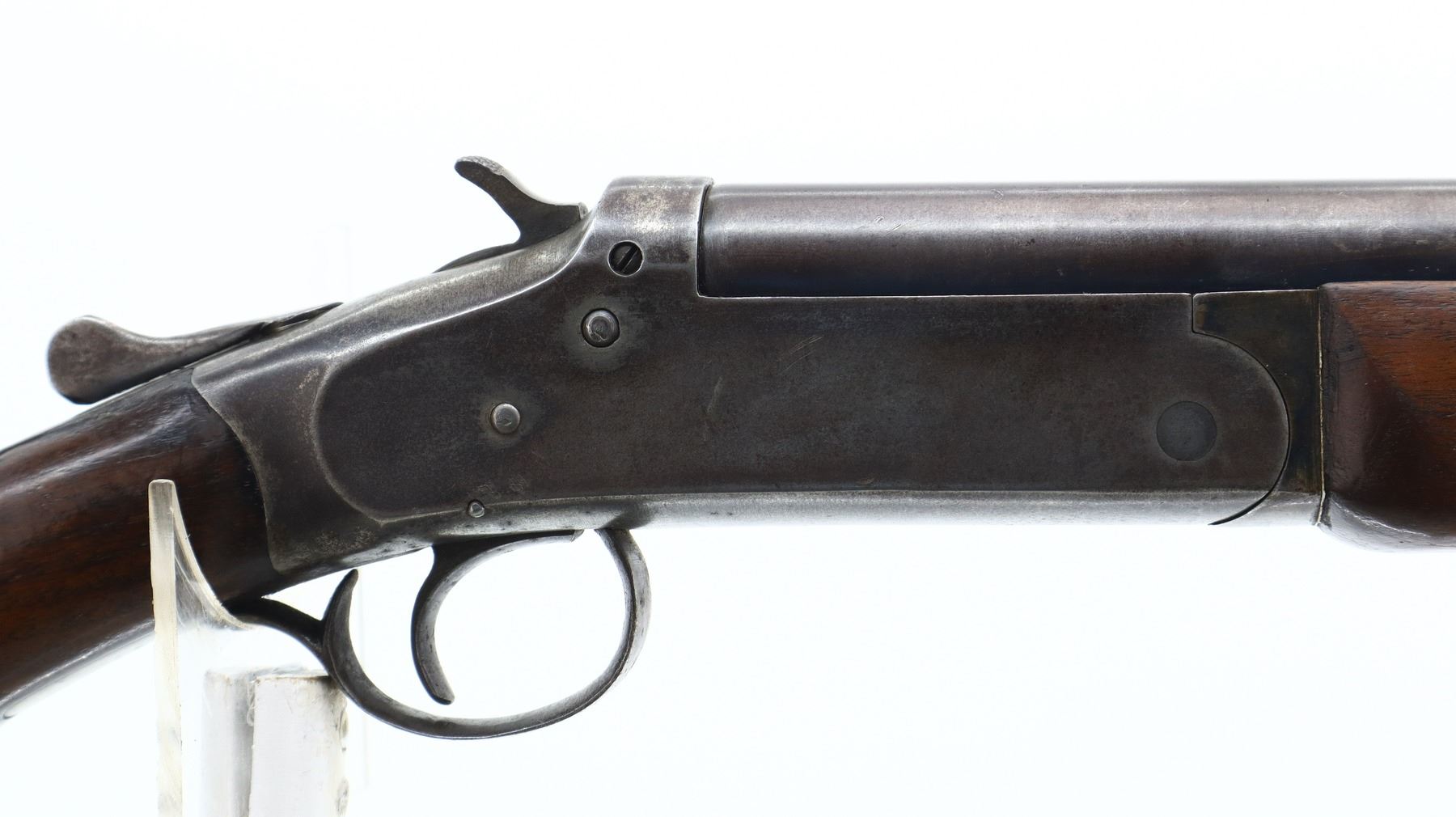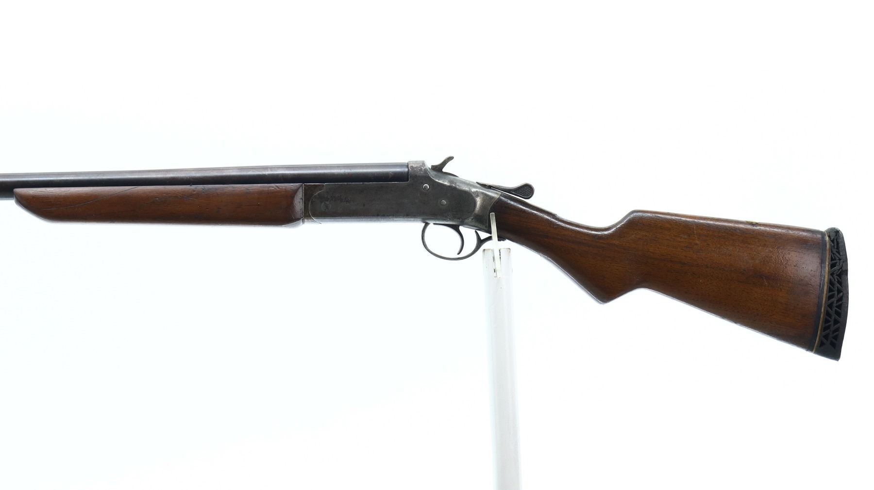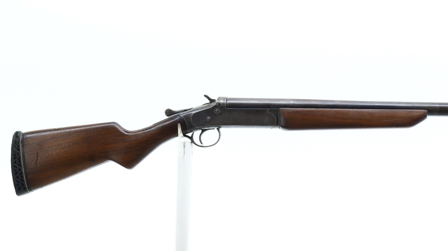 3/10, IVER JOHNSON, MODEL: CHAMPION, CALIBER:12 G X 2 3/4", BORE IS FAIR, SEVERAL RINGS. FIXED FULL CHOKE. BRASS BEAD, ROUND BARREL, CHECKERED SPUR HAMMER, EJECTOR. TWO PIECE SMOOTH WOOD STOCKS, PISTOL GRIP CRACKED BEHIND RECEIVER, COMB HAS COMPASS INLAYED IN IT, DAMAGED BLACK VENTED RUBBER RECOIL PAD. METAL FINISH TURNING BROWN WITH PITTING, LIGHT RUST SPECKLES, HANDLING MARKS AND WEAR. STOCKS SHOW MARKS, SCRATCHES AND WEAR. , ACTION: HINGED SINGLE SHOT SHOTGUN, BARREL LENGTH: 30", SERIAL # NA, CONDITION: 3/10, CLASS: CANADIAN NON RESTRICTED