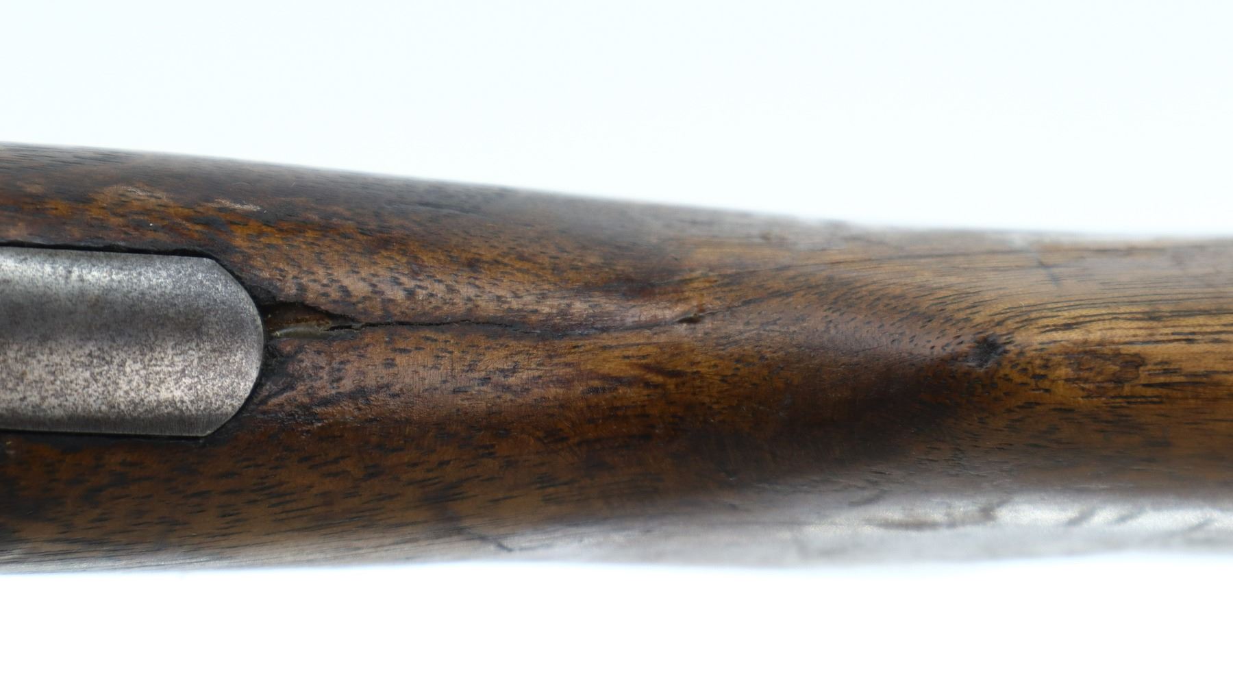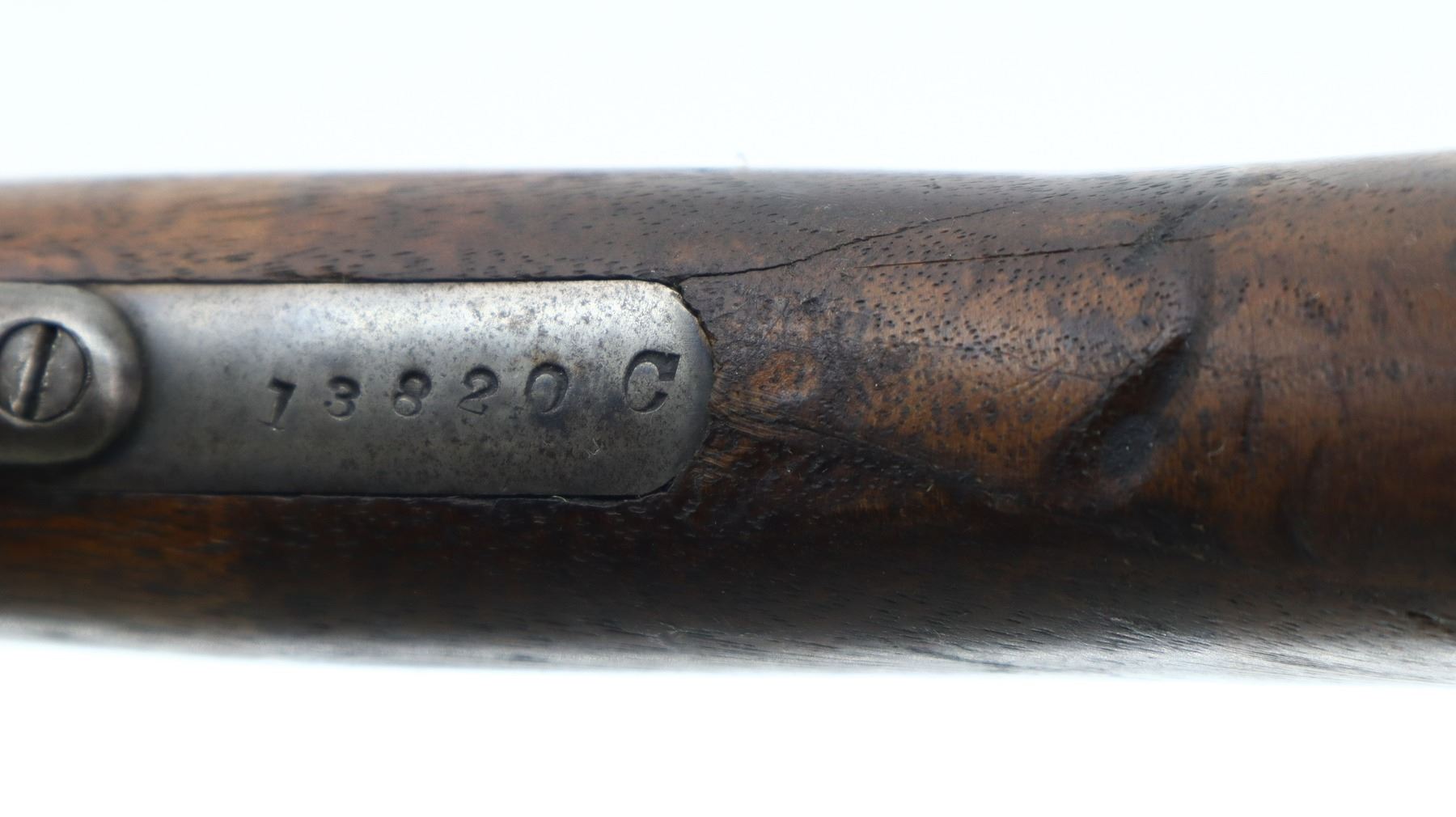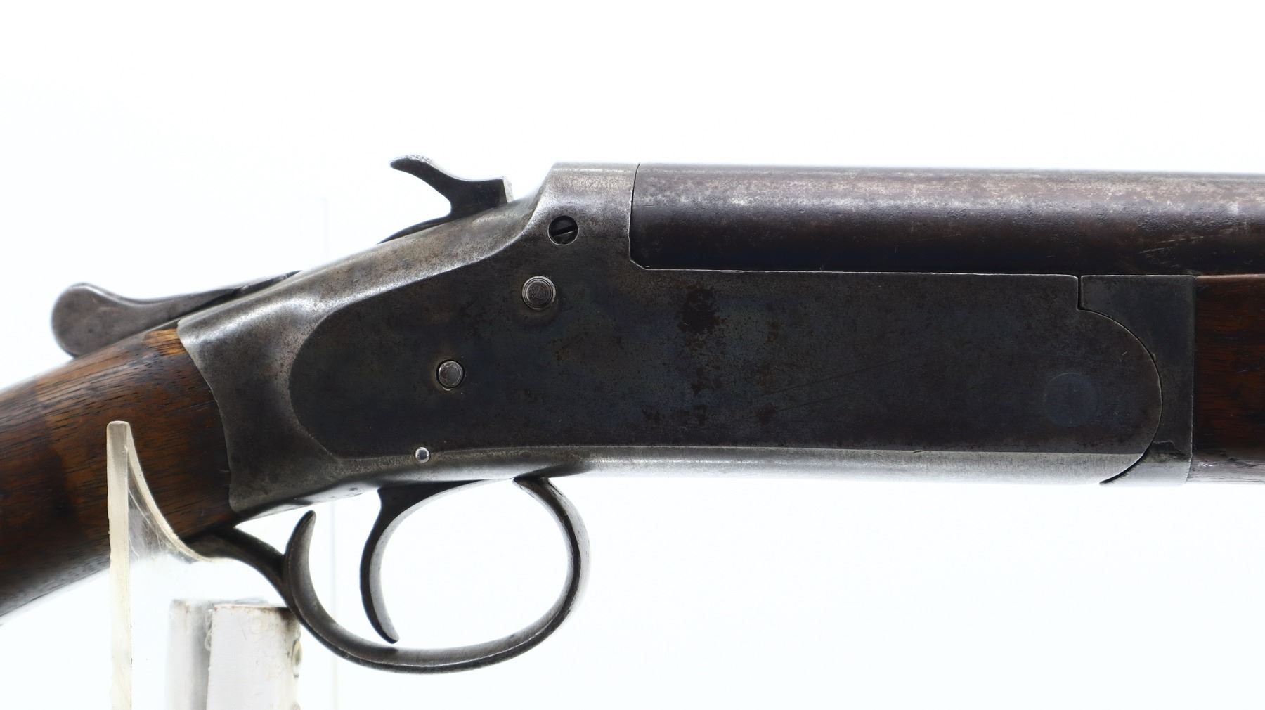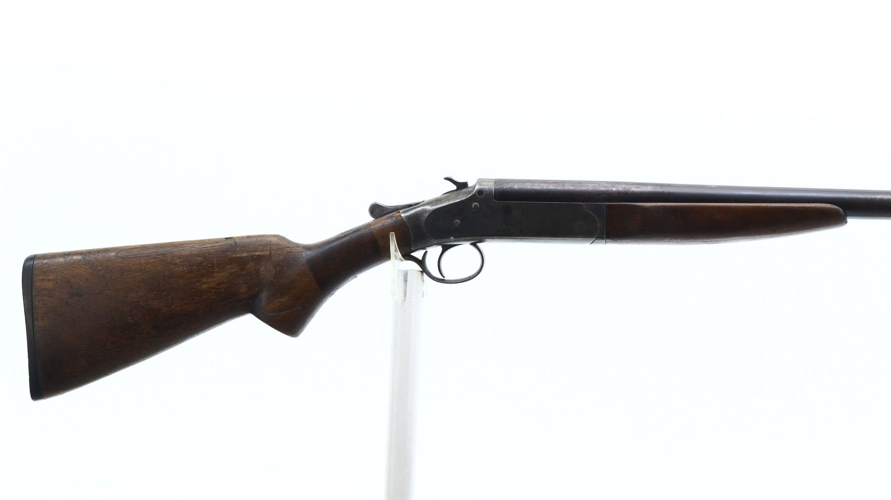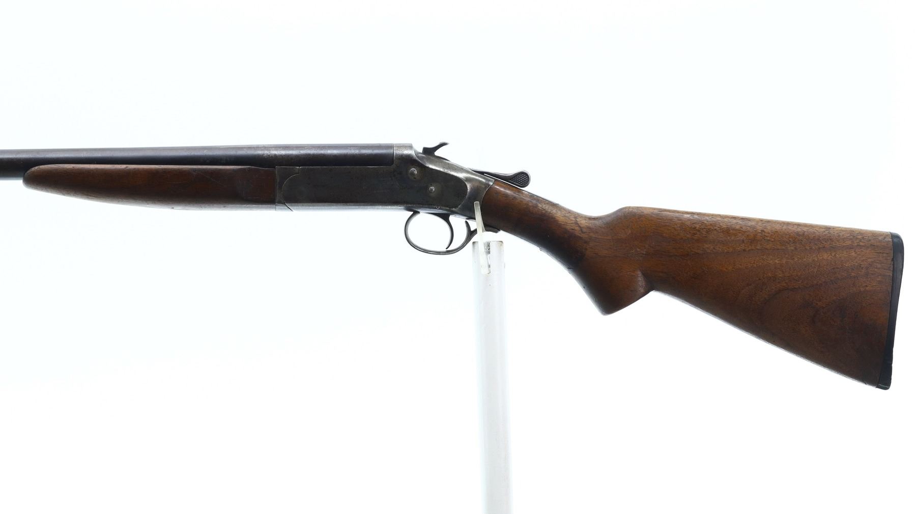 3/10, IVER JOHNSON, MODEL: CHAMPION, CALIBER:12 G X 2 3/4", BORE IS GOOD. FIXED IM CHOKE. SILVER BEAD, ROUND BARREL, COLOUR CASE HARDENED RECEIVER, CHECKERED SPUR HAMMER, EXTRACTOR, OPENING LEVER MISALIGNED. TWO PIECE SMOOTH WOOD STOCKS, PISTOL GRIP CRACKED BEHIND RECEIVER, GROOVED BLACK POLYMER BUTT PLATE. METAL FINISH TURNING BROWN WITH LIGHT PITTING, RUST SPECKLES, HANDLING MARKS AND WEAR. STOCKS SHOW MARKS, SCRATCHES AND WEAR. , ACTION: HINGED SINGLE SHOT SHOTGUN, BARREL LENGTH: 30", SERIAL # 13820C, CONDITION: 3/10, CLASS: CANADIAN NON RESTRICTED