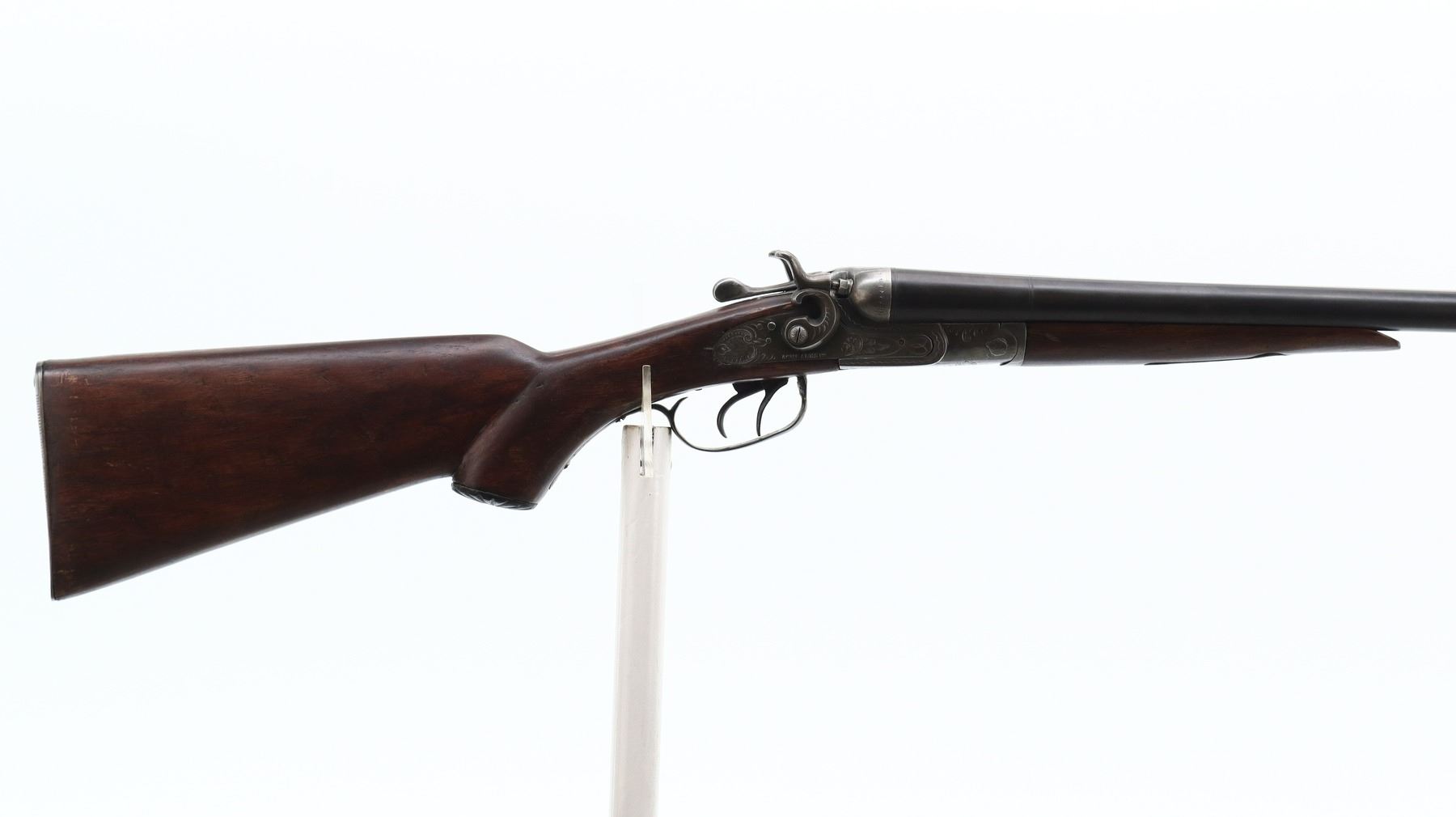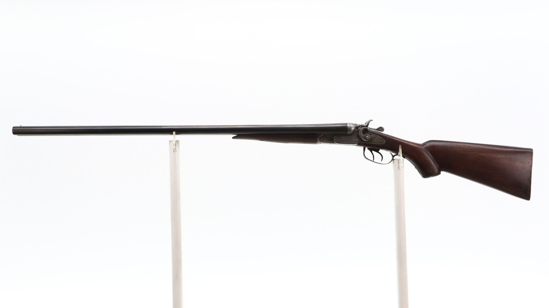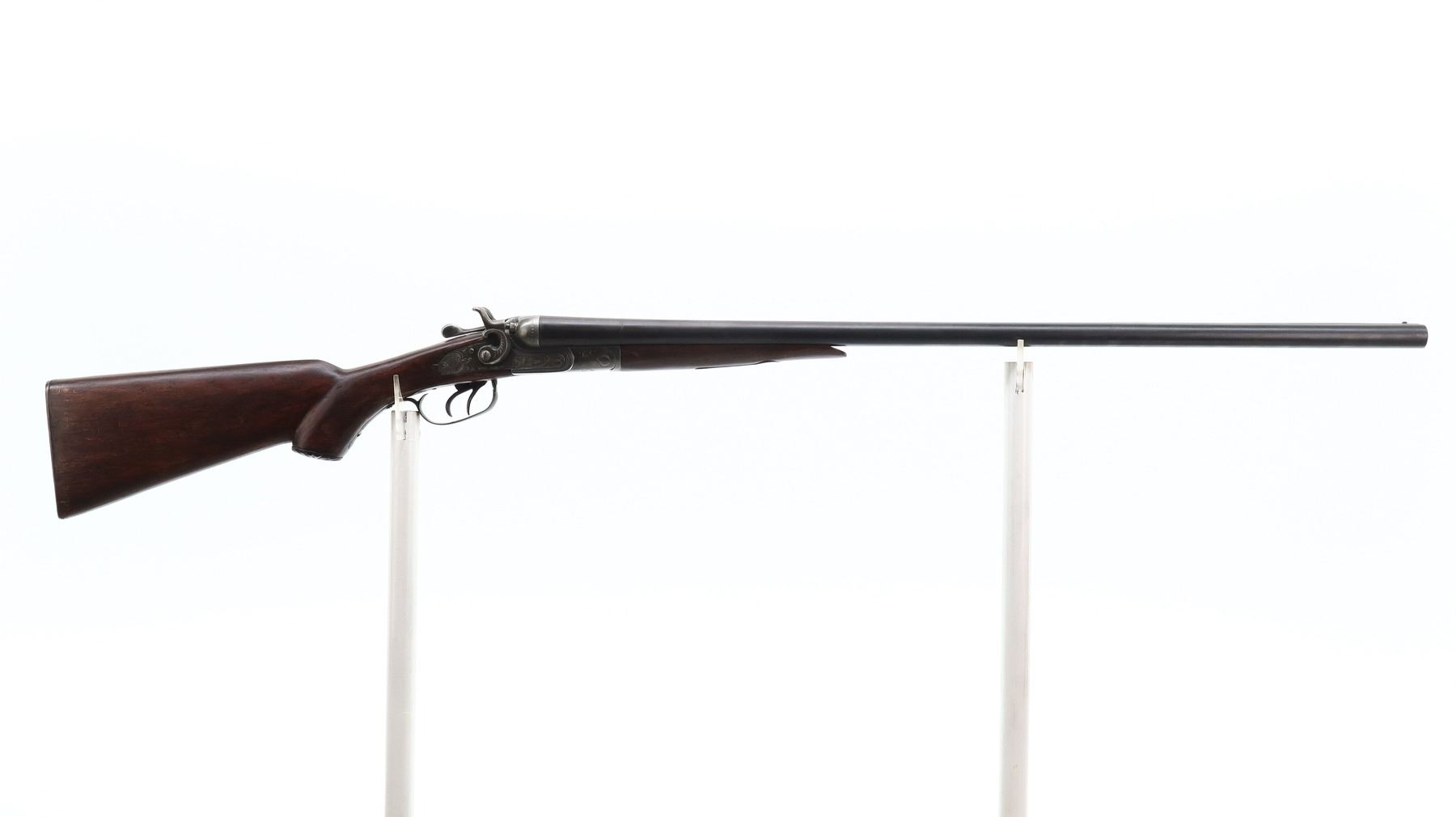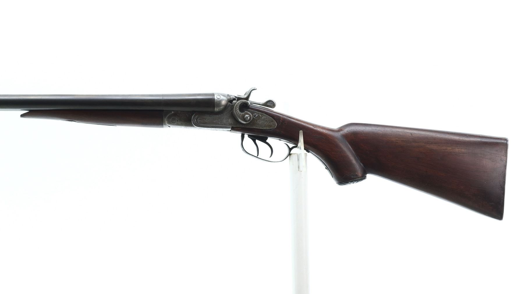 3/10, ACME ARMS CO BELGIUM, MODEL: SIDE BY SIDE HAMMERGUN, CALIBER:12 G X 2 1/2", BORES ARE FAIR, PITTED. FIXED IC CHOKES. BRASS BEAD, BLUED BARRELS, SILVER ENGRAVED RECEIVER, ENGRAVED SIDE LOCKS WITH CHECKERED SPUR HAMMERS, LEFT SIDE DOES NOT HOLD COCK, EXTRACTOR, DOUBLE TRIGGERS. TWO PIECE WOOD STOCKS, CHECKERED FOREARM, REPLACED PISTOL GRIP BUTT STOCK, GROOVED STEEL BUTT PLATE, GRIP CAP. METAL FINISH SHOWS SOME LIGHT PITTING, SCRATCHES, HANDLING MARKS AND WEAR. STOCKS SHOW SOME MARKS, SCRATCHES AND WEAR. , ACTION: HINGED SIDE BY SIDE SHOTGUN, BARREL LENGTH: 30" , SERIAL # NA, CONDITION: 3/10, CLASS: CANADIAN NON RESTRICTED