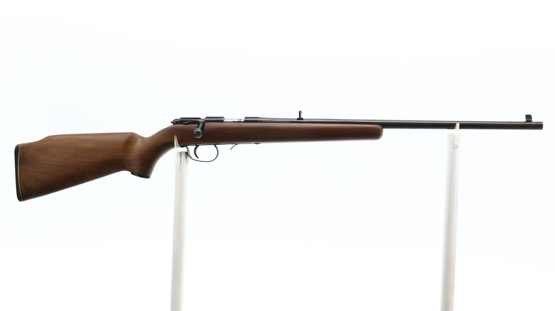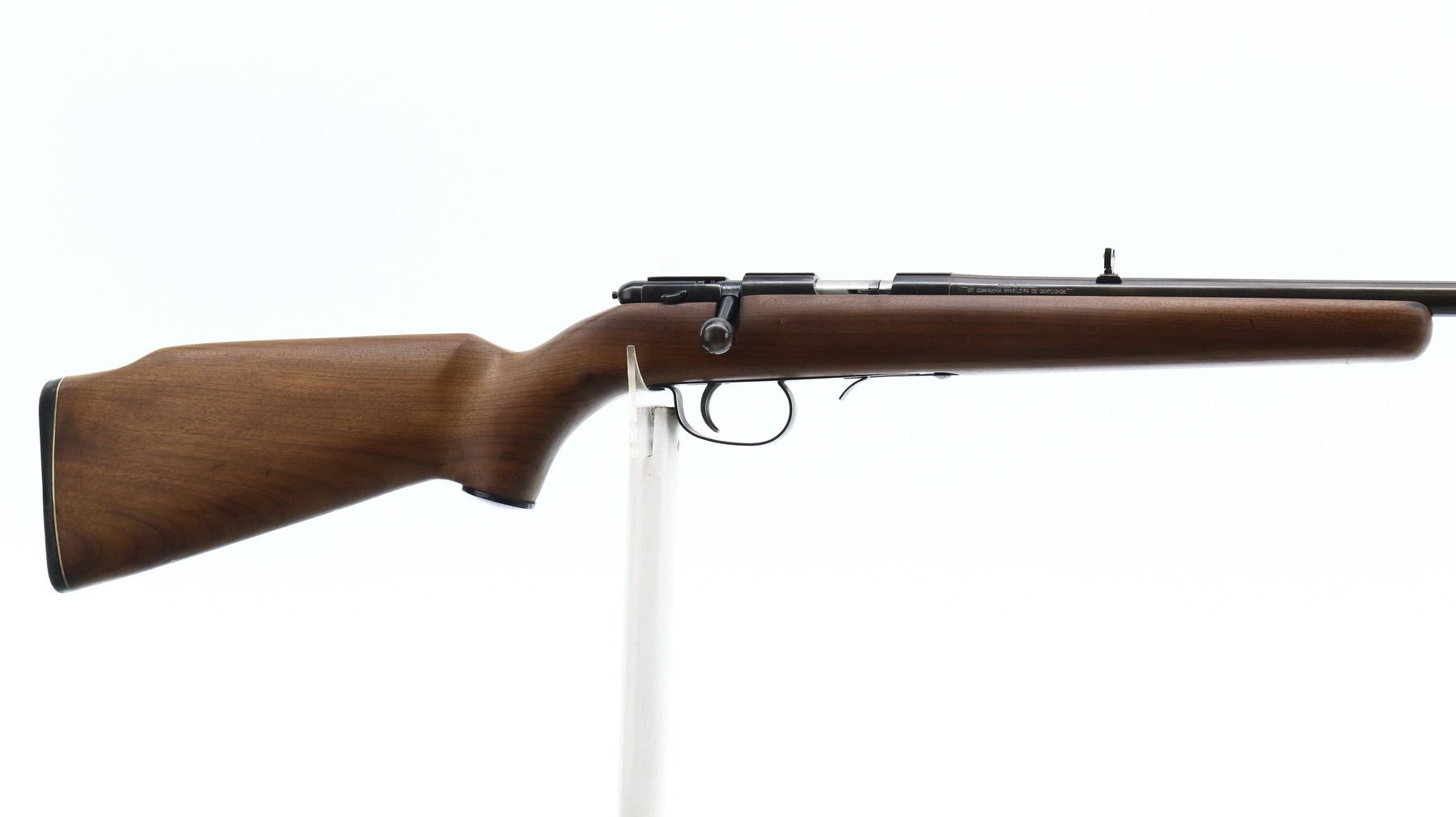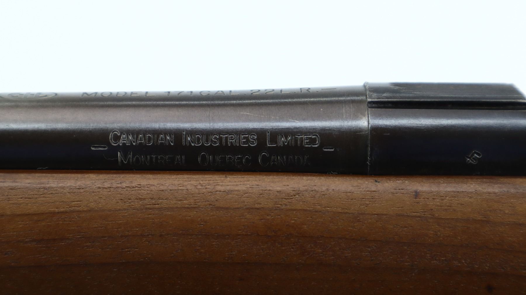 3/10, CIL, MODEL: 171, CALIBER:22 LR, DOES NOT COME WITH MAGAZINE, BORE IS VERY GOOD. BLADE FRONT SIGHT, ADJUSTABLE FOLDING U NOTCHED REAR SIGHT, RECEIVER GROOVED FOR SCOPE MOUNT. ONE PIECE SMOOTH WOOD STOCK CRACKED IN FRONT OF BOLT HANDLE SLOT. PISTOL GRIP WITH CAP, GROOVED BLACK POLYMER BUTT PLATE. METAL FINISH SHOWS SCRATCHES, HANDLING MARKS AND WEAR. STOCK SHOWS MARKS, SCRATCHES AND WEAR. , ACTION: BOLT ACTION RIFLE, BARREL LENGTH: 21", SERIAL # 53182, CONDITION: 3/10, CLASS: CANADIAN NON RESTRICTED
