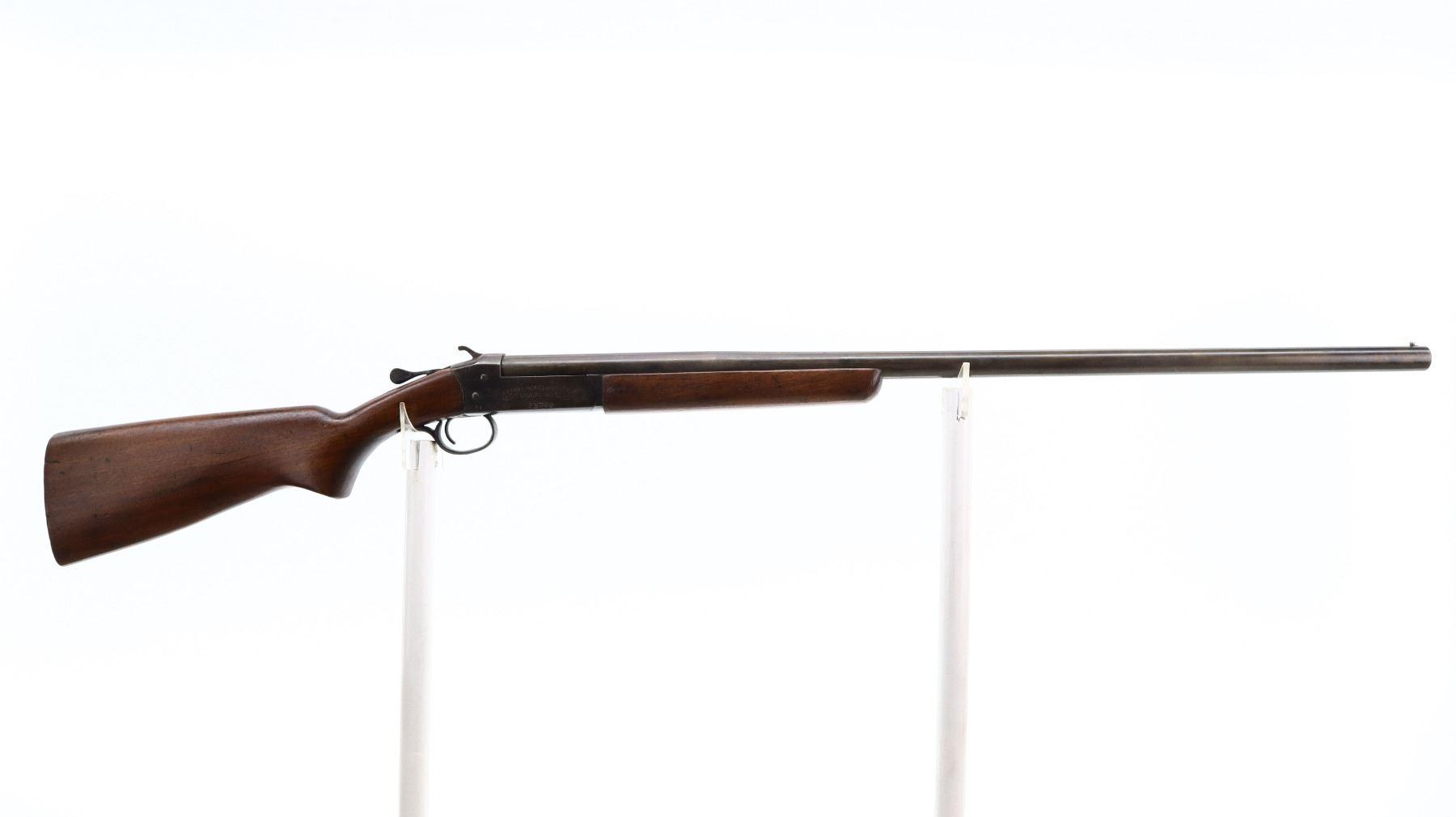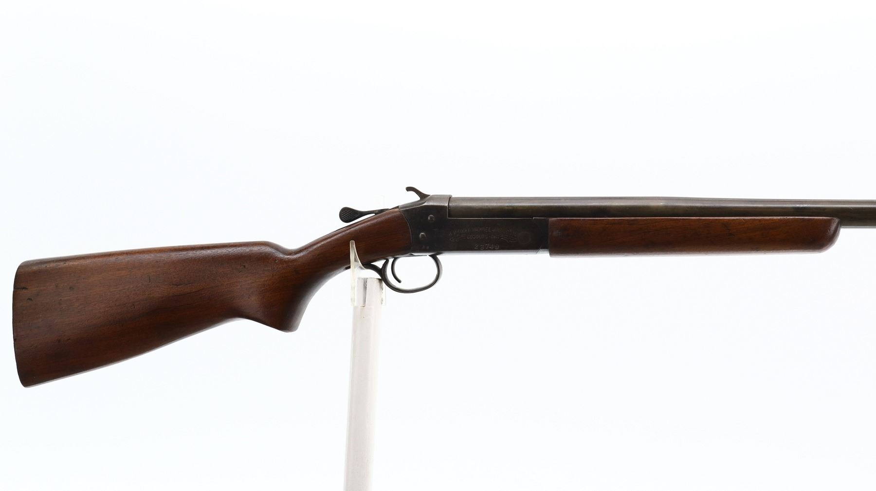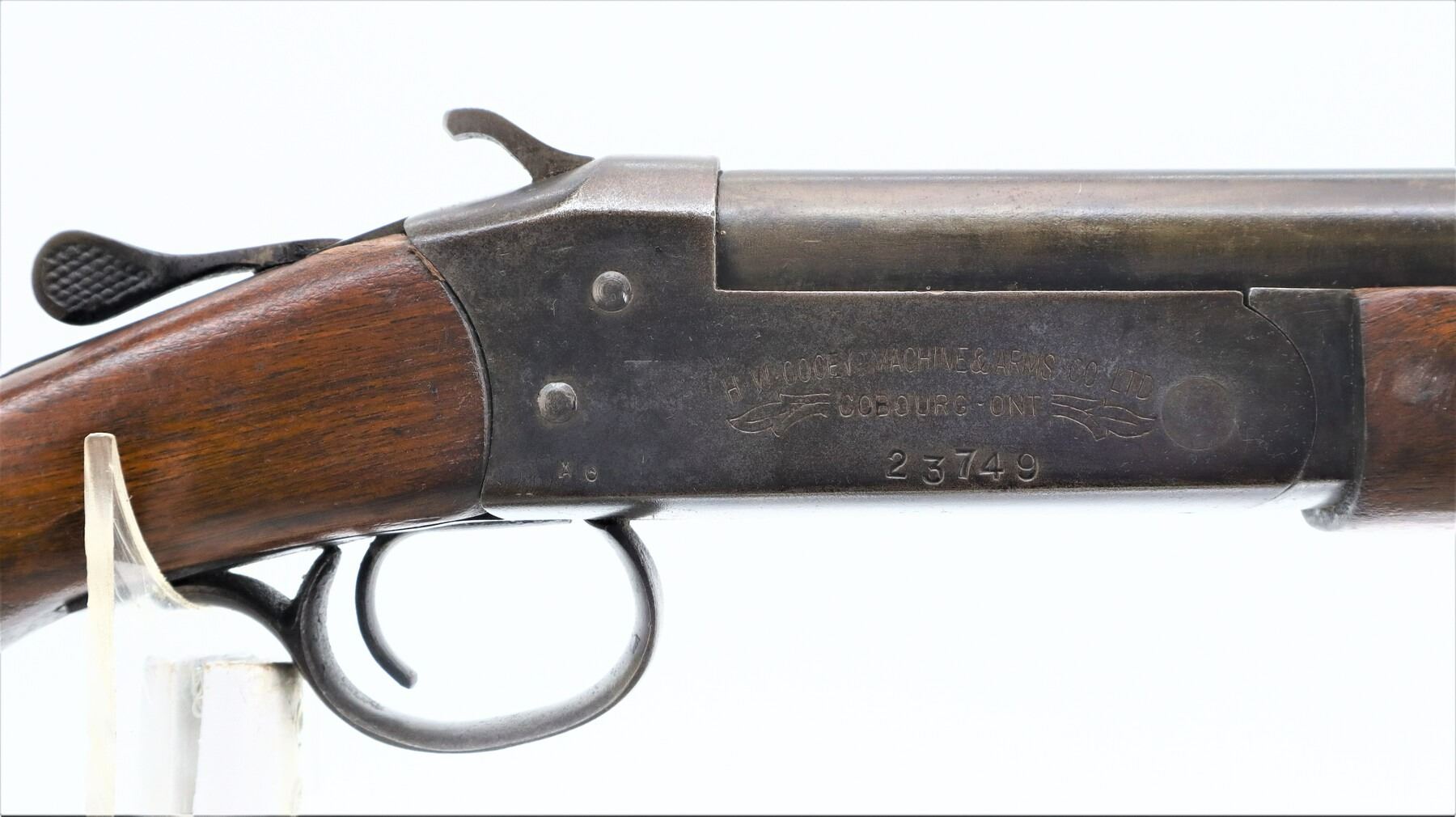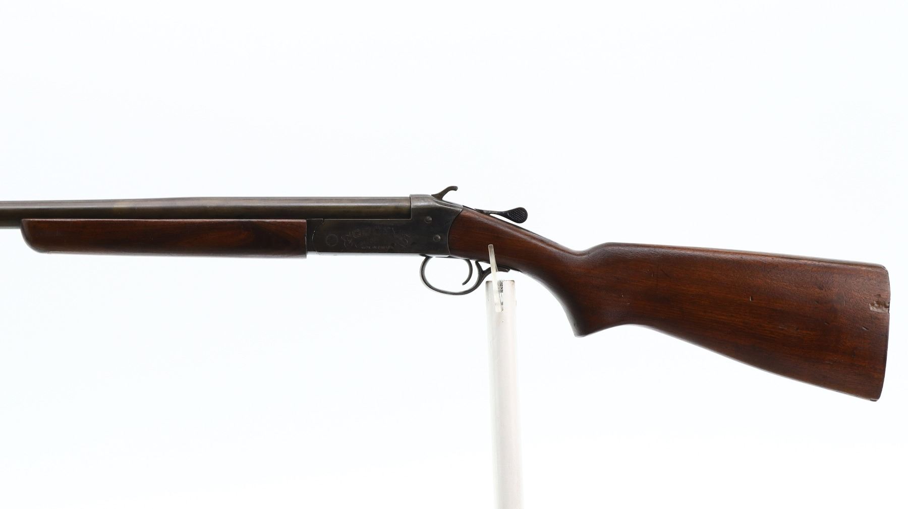 3/10, COOEY, MODEL: 84, CALIBER:12 G X 3", BORE IS EXCELLENT. FIXED FULL CHOKE. SILVER BEAD, ROUND BARREL, GROOVED SPUR HAMMER, EXTRACTOR. TWO PIECE SMOOTH WOOD STOCKS, PISTOL GRIP, CRACKED BEHIND RECEIVER, MISSING BUTT PLATE. METAL FINISH TURNING BROWN WITH LIGHT PITTING, SCRATCHES, HANDLING MARKS AND WEAR. STOCKS SHOW MARKS, SCRATCHES AND WEAR. , ACTION: HINGED SINGLE SHOT SHOTGUN, BARREL LENGTH: 30", SERIAL # 23749, CONDITION: 3/10, CLASS: CANADIAN NON RESTRICTED