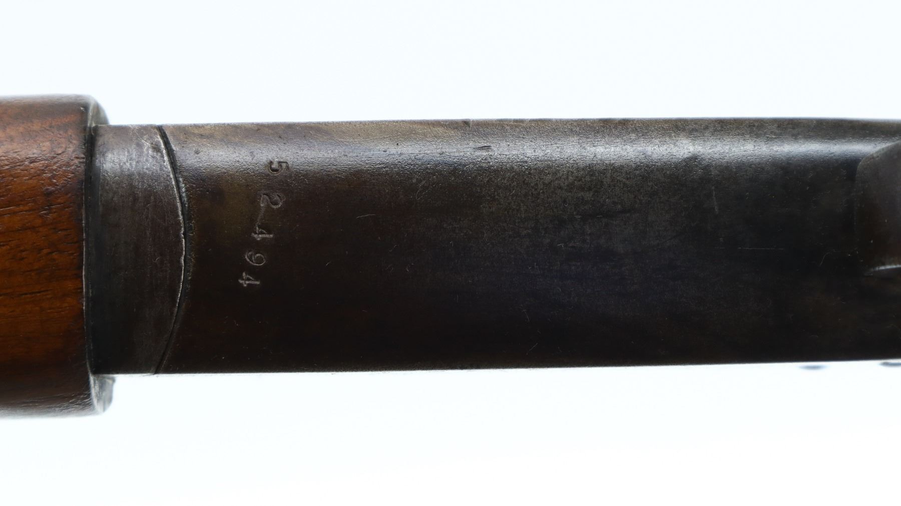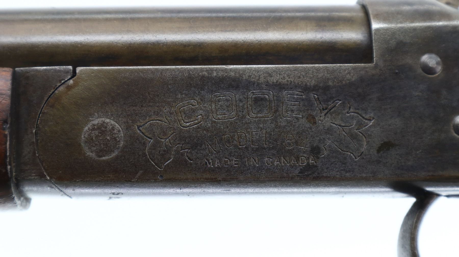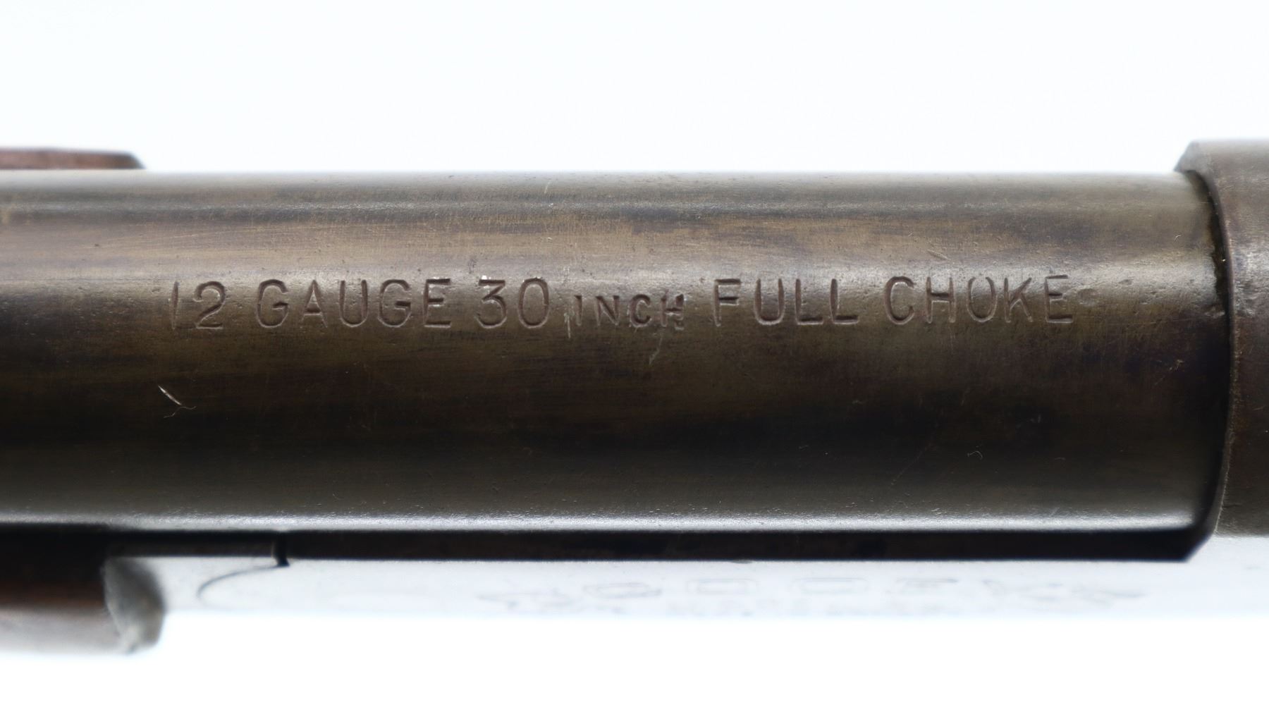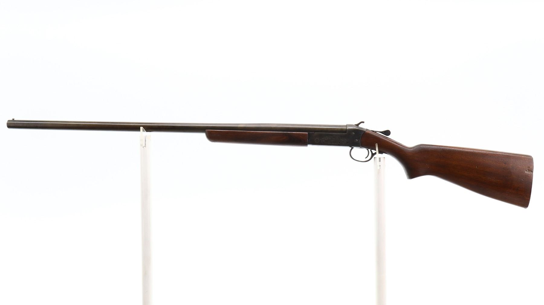 3/10, COOEY, MODEL: 84, CALIBER:12 G X 3", BORE IS EXCELLENT. FIXED FULL CHOKE. SILVER BEAD, ROUND BARREL, GROOVED SPUR HAMMER, EXTRACTOR. TWO PIECE SMOOTH WOOD STOCKS, PISTOL GRIP, CRACKED BEHIND RECEIVER, MISSING BUTT PLATE. METAL FINISH TURNING BROWN WITH LIGHT PITTING, SCRATCHES, HANDLING MARKS AND WEAR. STOCKS SHOW MARKS, SCRATCHES AND WEAR. , ACTION: HINGED SINGLE SHOT SHOTGUN, BARREL LENGTH: 30", SERIAL # 23749, CONDITION: 3/10, CLASS: CANADIAN NON RESTRICTED