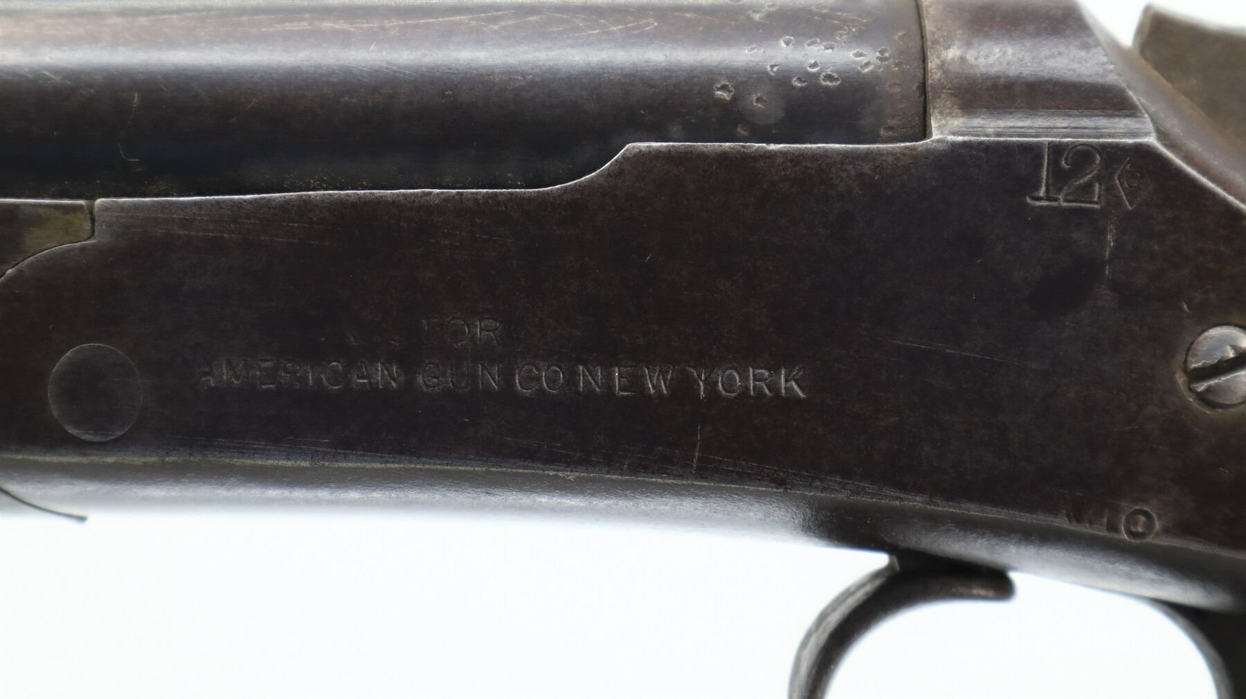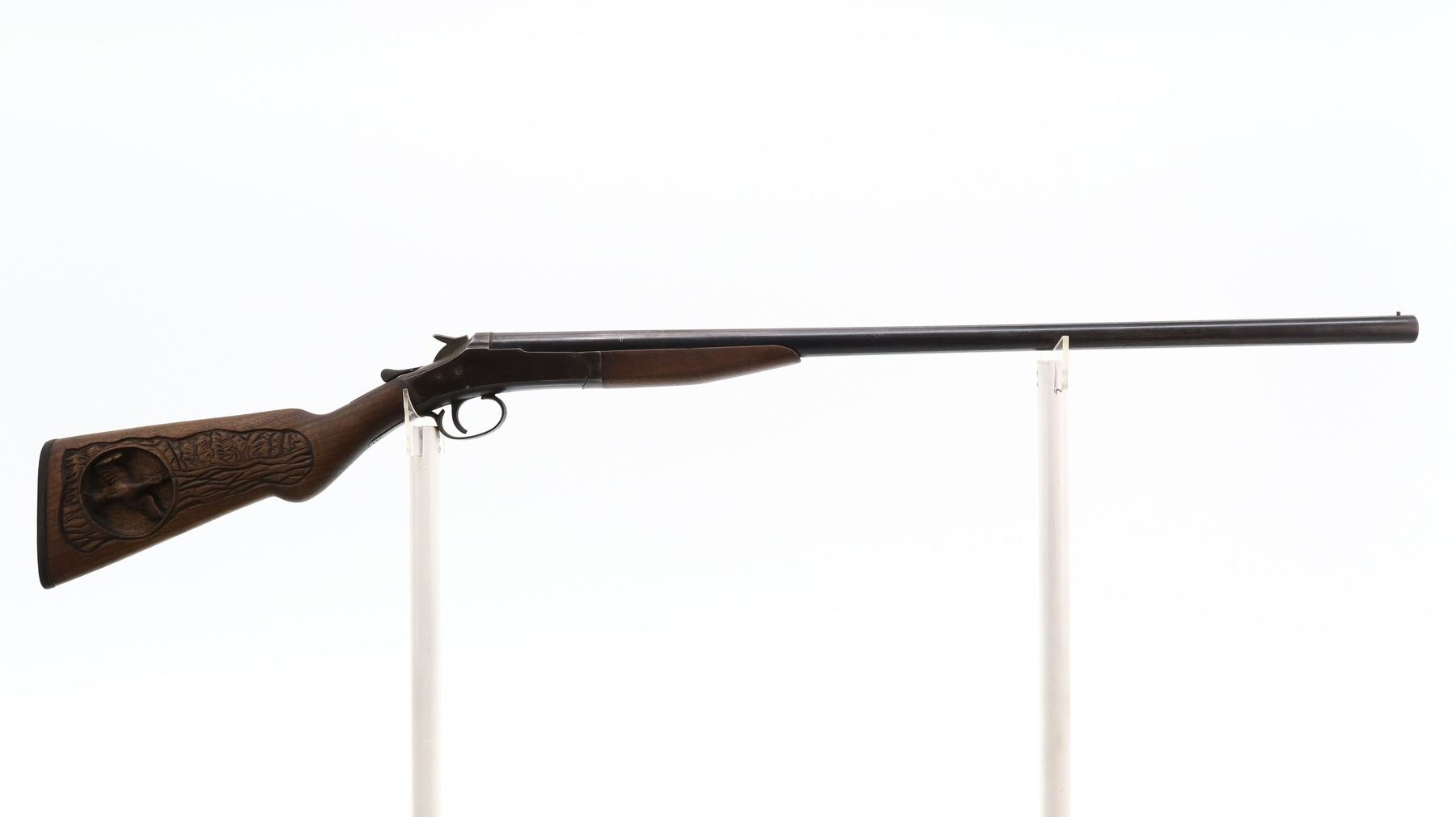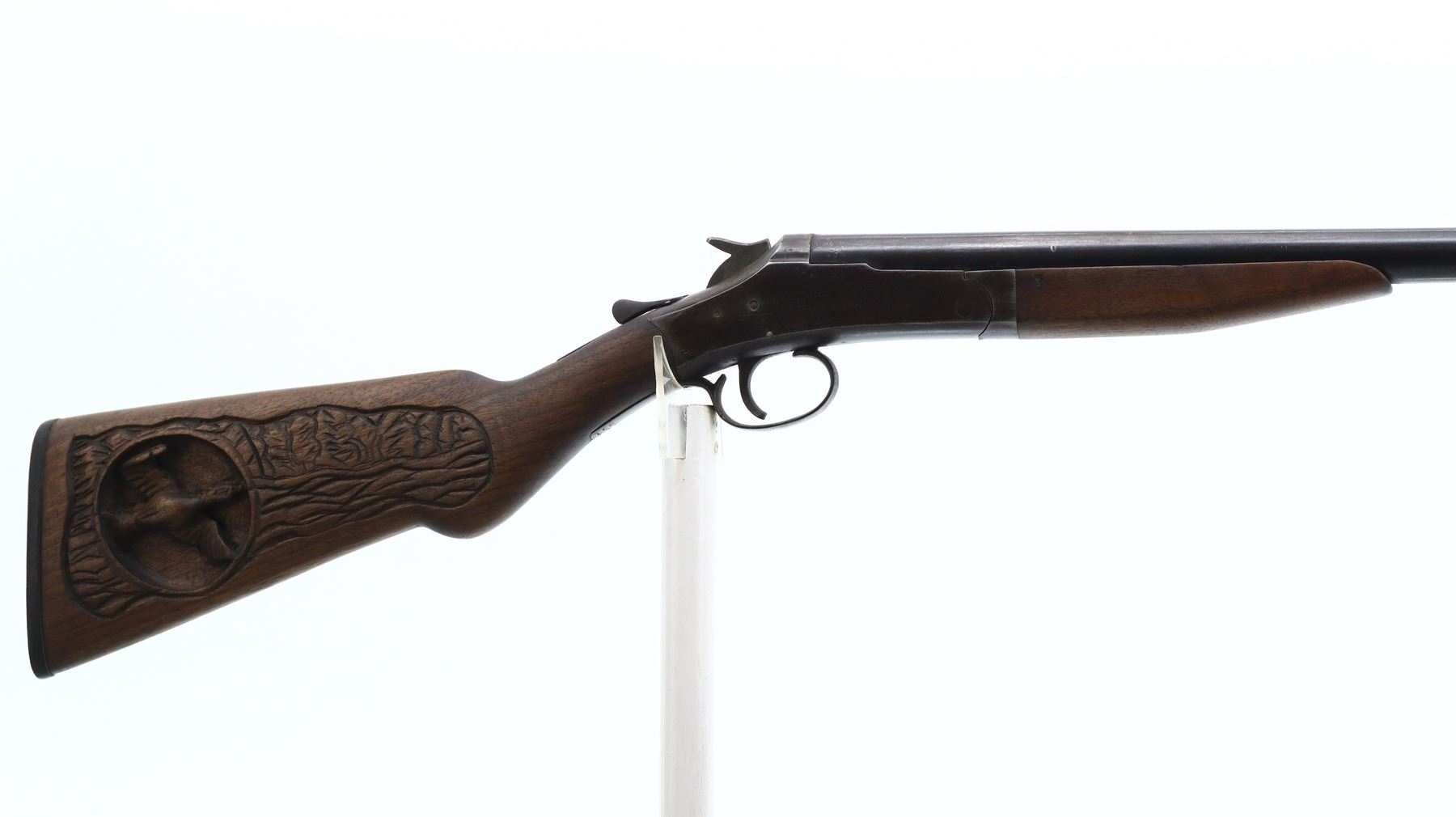 3/10, AMERICAN GUN CO, MODEL: VICTOR, CALIBER:12 G X 2 3/4", BORE IS FAIR, PITTED. FIXED FULL CHOKE. BRASS BEAD, ROUND BARREL LOOSE ON FACE, CHECKERED SPUR HAMMER, EXTRACTOR. TWO PIECE WOOD STOCKS, PISTOL GRIP, CHECKERED BLACK POLYMER BUTT PLATE, RIGHT SIDE OF STOCK HAS DUCK WOODLAND CARVING. METAL FINISH TURNING BROWN WITH LIGHT PITTING, SCRATCHES, HANDLING MARKS AND WEAR. STOCKS SHOW MARKS, SCRATCHES AND WEAR. , ACTION: HINGED SINGLE SHOT SHOTGUN, BARREL LENGTH: 29.5", SERIAL # 517651, CONDITION: 3/10, CLASS: CANADIAN NON RESTRICTED