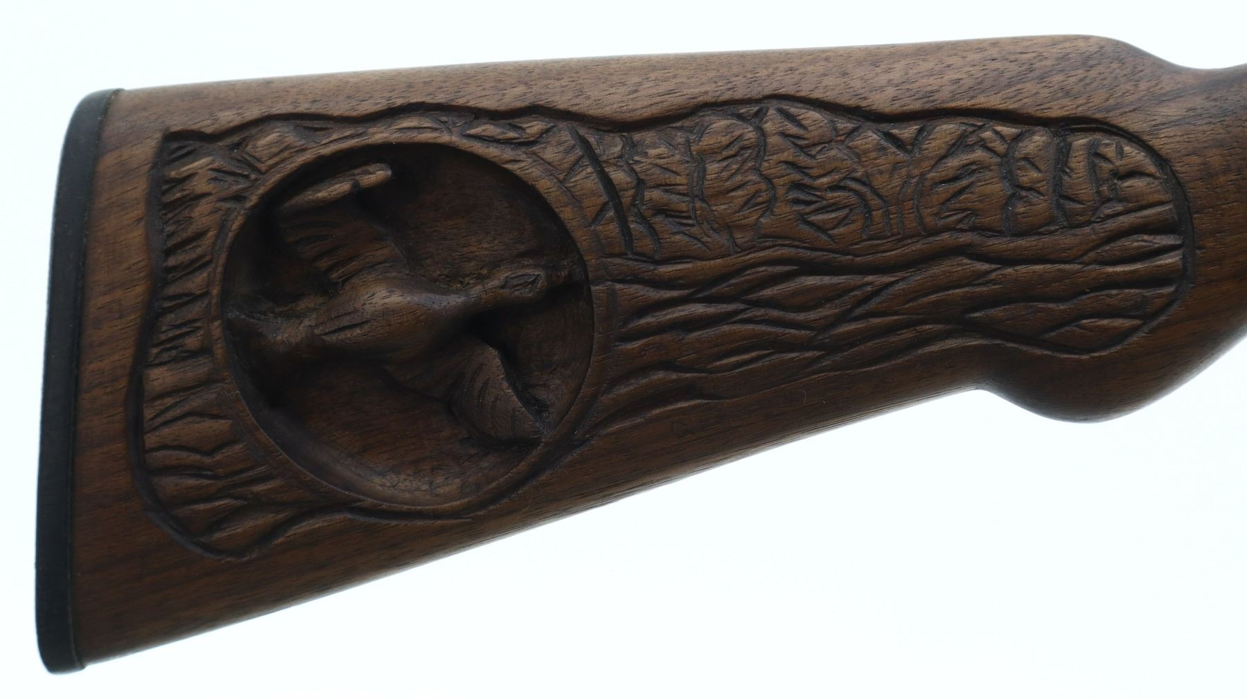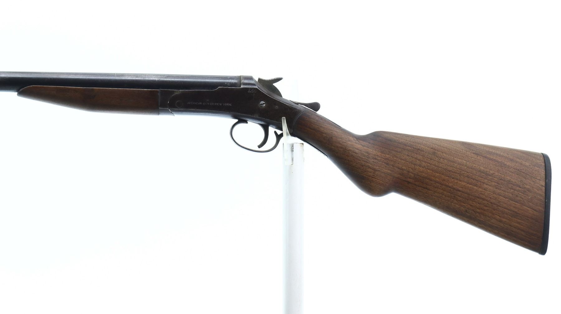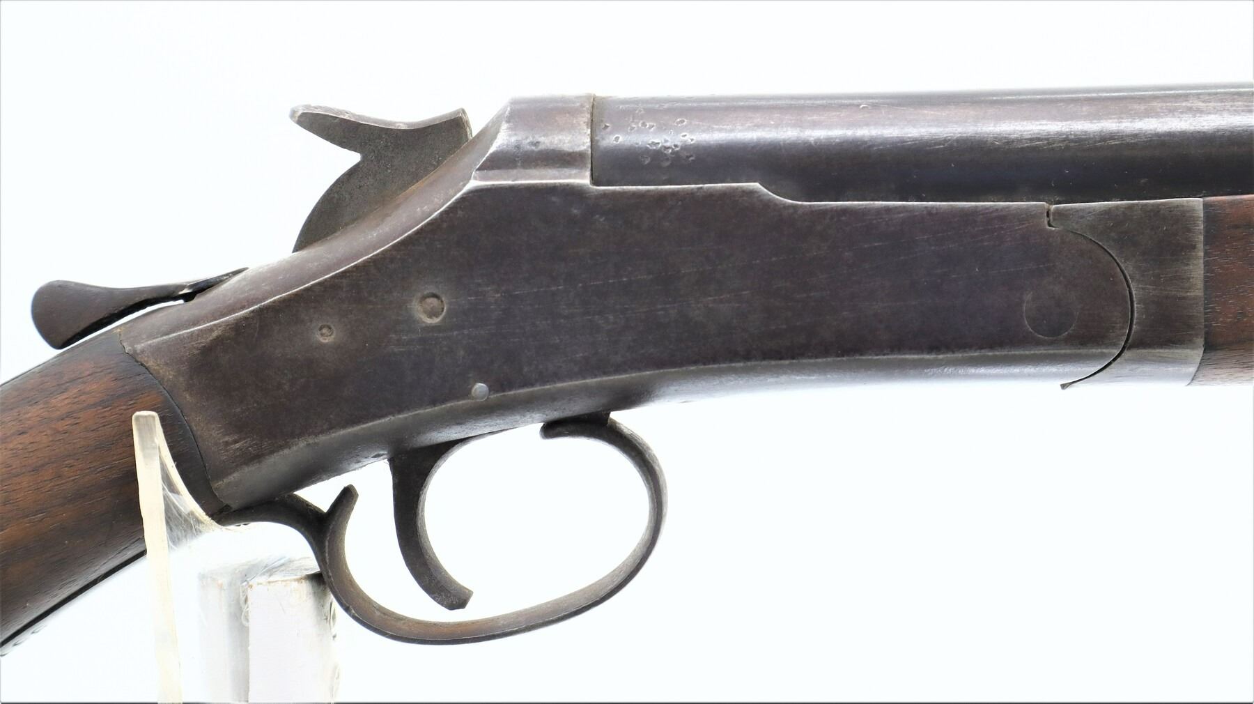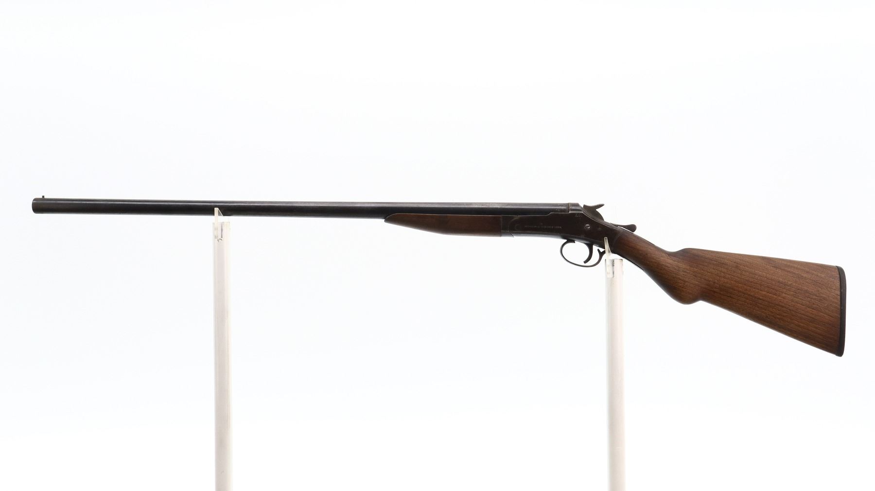 3/10, AMERICAN GUN CO, MODEL: VICTOR, CALIBER:12 G X 2 3/4", BORE IS FAIR, PITTED. FIXED FULL CHOKE. BRASS BEAD, ROUND BARREL LOOSE ON FACE, CHECKERED SPUR HAMMER, EXTRACTOR. TWO PIECE WOOD STOCKS, PISTOL GRIP, CHECKERED BLACK POLYMER BUTT PLATE, RIGHT SIDE OF STOCK HAS DUCK WOODLAND CARVING. METAL FINISH TURNING BROWN WITH LIGHT PITTING, SCRATCHES, HANDLING MARKS AND WEAR. STOCKS SHOW MARKS, SCRATCHES AND WEAR. , ACTION: HINGED SINGLE SHOT SHOTGUN, BARREL LENGTH: 29.5", SERIAL # 517651, CONDITION: 3/10, CLASS: CANADIAN NON RESTRICTED