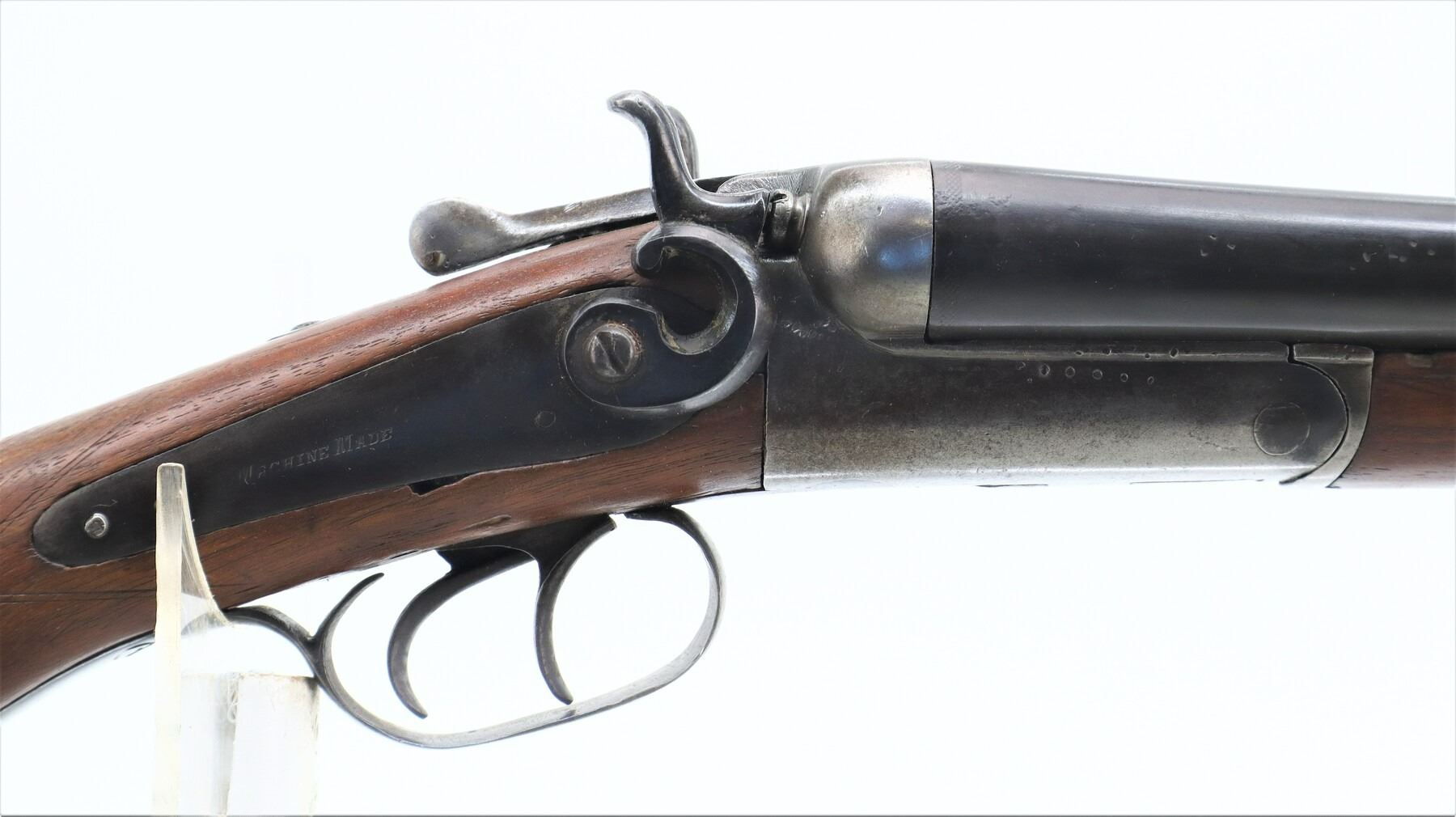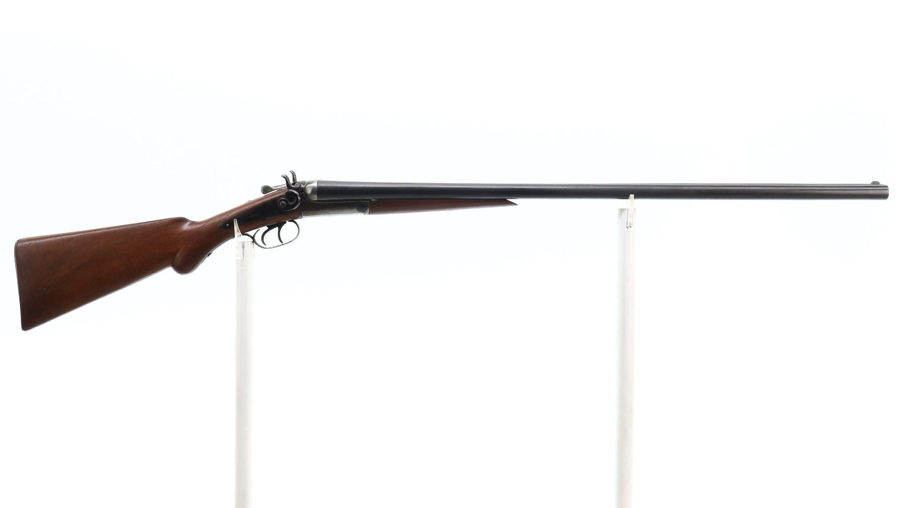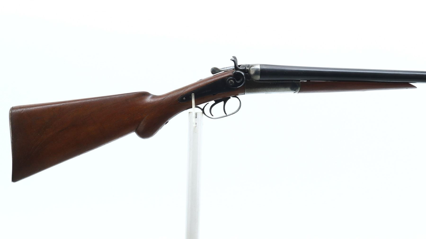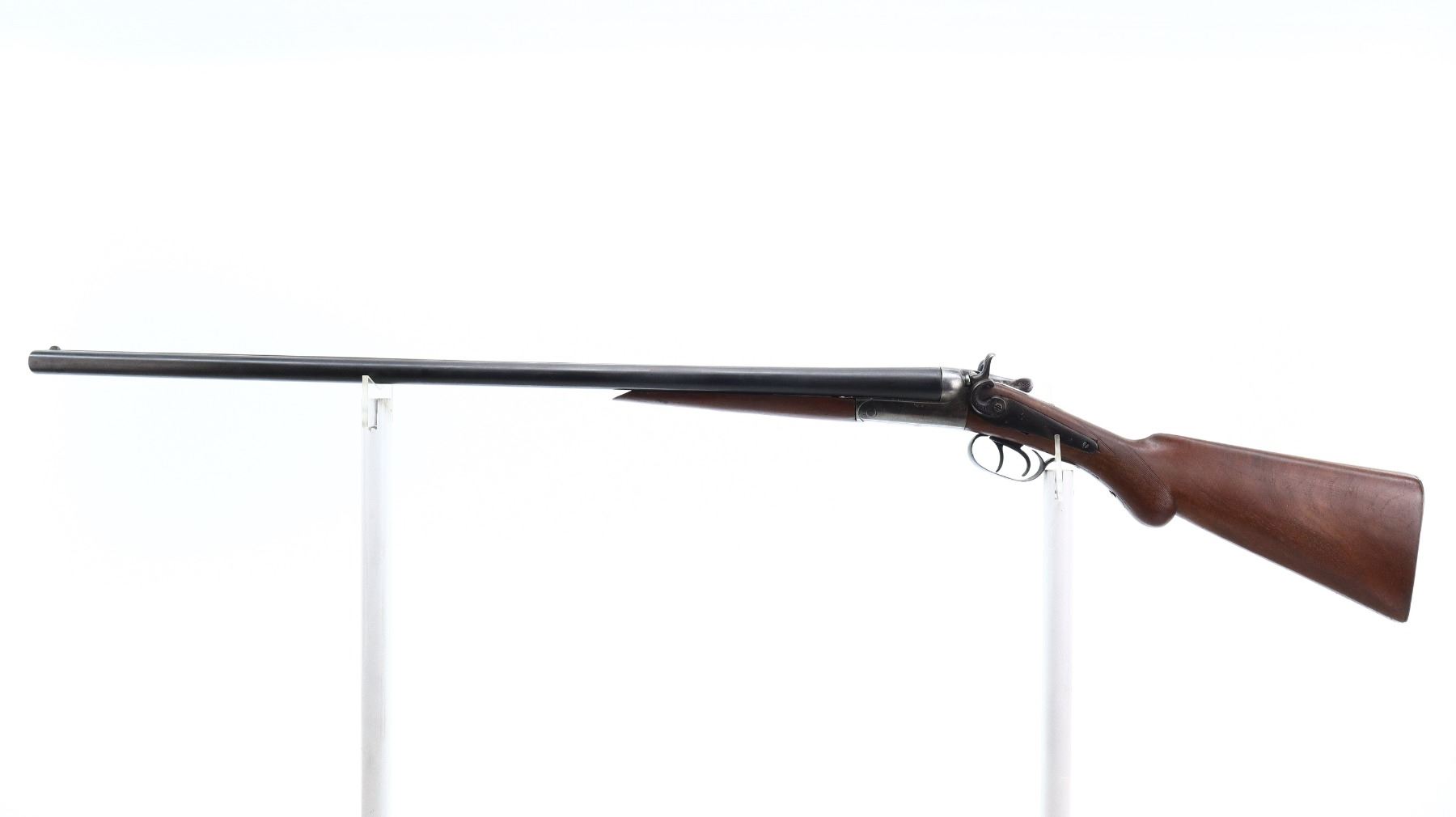 3/10, W PARKHURST, MODEL: SIDE BY SIDE HAMMER GUN, CALIBER:12 G X 2 1/2", BORES FAIR, PITTED. FIXED MOD CHOKES. BLADE FRONT SIGHT, LAMINATED STEEL BARRELS, OPENING LEVER IS VERY STIFF, BACK ACTION LOCKS WITH CHECKERED SPUR HAMMERS THAT WORK BUT ARE LOOSE. TWO PIECE WOOD STOCKS, CHECKERED PISTOL GRIP, GROOVED STEEL BUTT PLATE. METAL FINISH SHOWS LIGHT RUST SPECKLES, SCRATCHES, HANDLING MARKS AND WEAR. STOCKS SHOW MARKS, SCRATCHES AND WEAR. , ACTION: HINGED SIDE BY SIDE SHOTGUN, BARREL LENGTH: 30.25", SERIAL # 7246, CONDITION: 3/10, CLASS: CANADIAN NON RESTRICTED