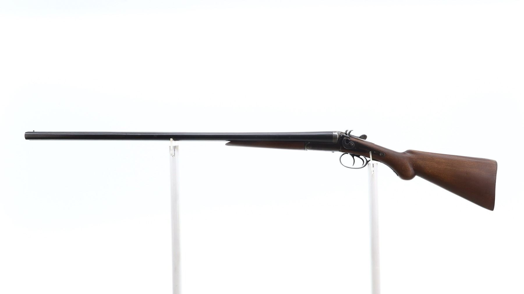 4/10, CAMBRIDGE ARMS, MODEL: SIDE BY SIDE HAMMER GUN, CALIBER:12 G X 2 5/8", BORES ARE FAIR, PITTED. FIXED MOD CHOKES. BRASS BEAD, LAMINATED STEEL BARRELS WHICH ARE TIGHT TO OPEN, BACK ACTION LOCKS WITH CHECKERED SPUR HAMMERS THAT ARE LOOSE, EXTRACTOR, DOUBLE TRIGGERS. TWO PIECE SMOOTH WOOD STOCKS, PISTOL GRIP, GROOVED STEEL BUTT PLATE. METAL FINISH TURNING BROWN WITH PITTING, SCRATCHES, HANDLING MARKS AND WEAR. STOCKS SHOW MARKS, SCRATCHES AND WEAR., ACTION: SIDE BY SIDE SHOTGUN, BARREL LENGTH: 30", SERIAL # 19716, CONDITION: 4/10, CLASS: CANADIAN NON RESTRICTED