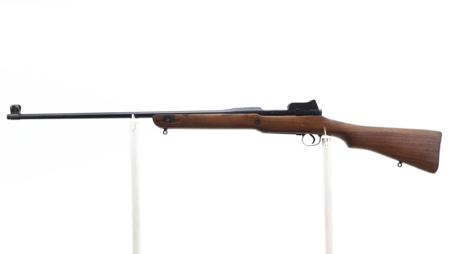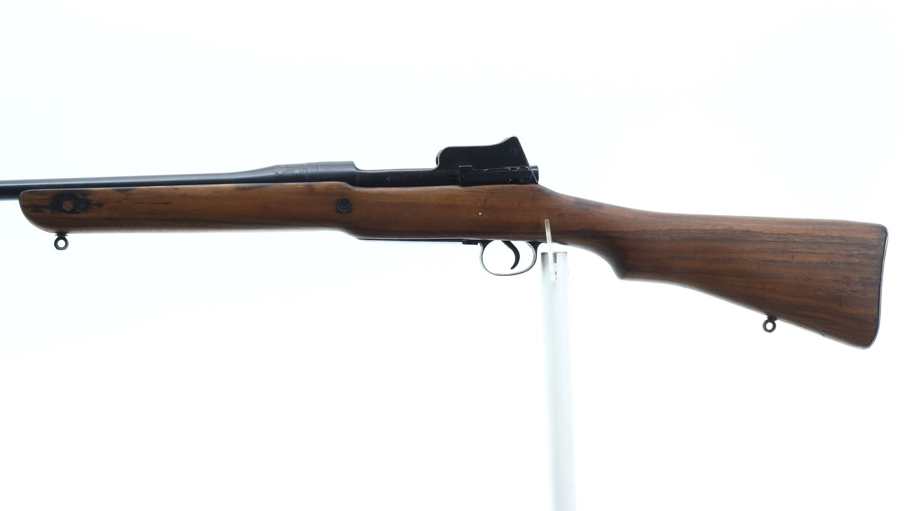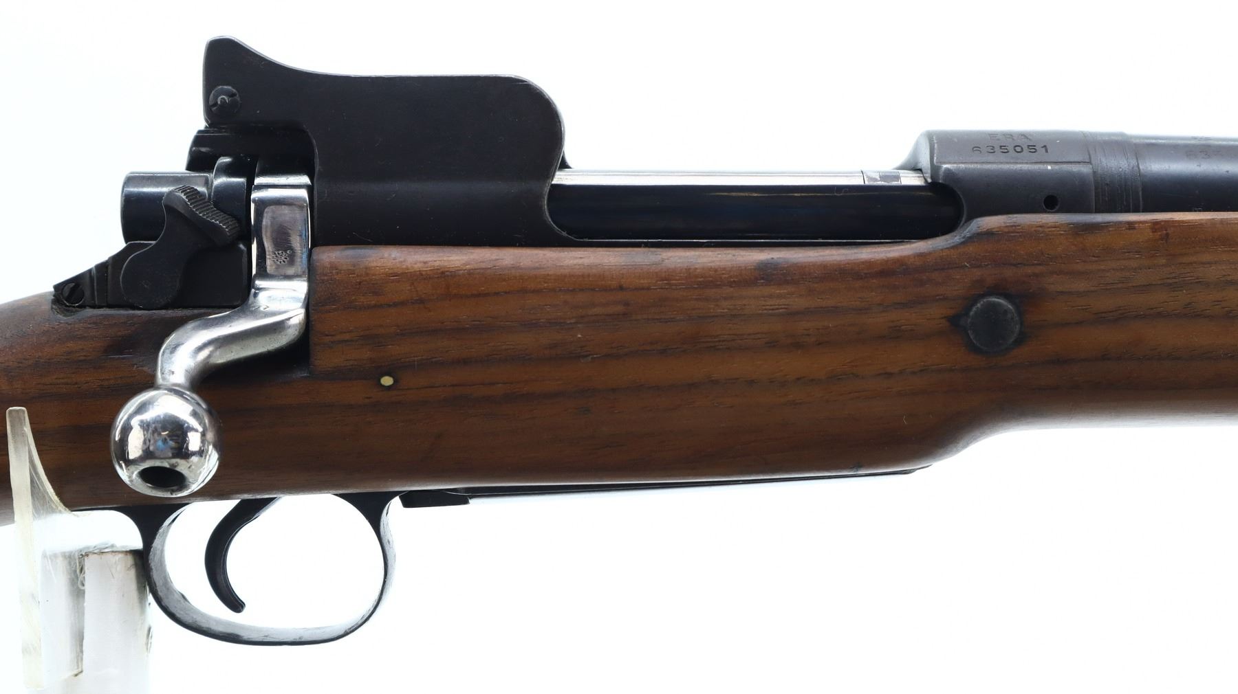 4+/10, ENFIELD, MODEL: P14 SPORTER, CALIBER:303 BR, BORE IS FAIR, WORN, LIGHT PITTING. MANUFACTURED BY ERA, BOLT MISMATCHED. BLADE FRONT SIGHT WITH EARS AND RAMP, ADJUSTABLE REAR PEEP SIGHT WITH EARS, BOLT POLISHED SILVER. ONE PIECE SPORTERIZED SMOOTH WOOD STOCK, PISTOL GRIP, SMOOTH STEEL BUTT PLATE WITH TRAP, STOCK DISK REPLACED WITH A QUARTER, SWIVEL STUDS. METAL FINISH SHOWS SCRATCHES, HANDLING MARKS AND WEAR. STOCKS SHOW MARKS, SCRATCHES AND WEAR., ACTION: BOLT ACTION RIFLE, BARREL LENGTH: 25.5", SERIAL # 635051, CONDITION: 4+/10, CLASS: CANADIAN NON RESTRICTED