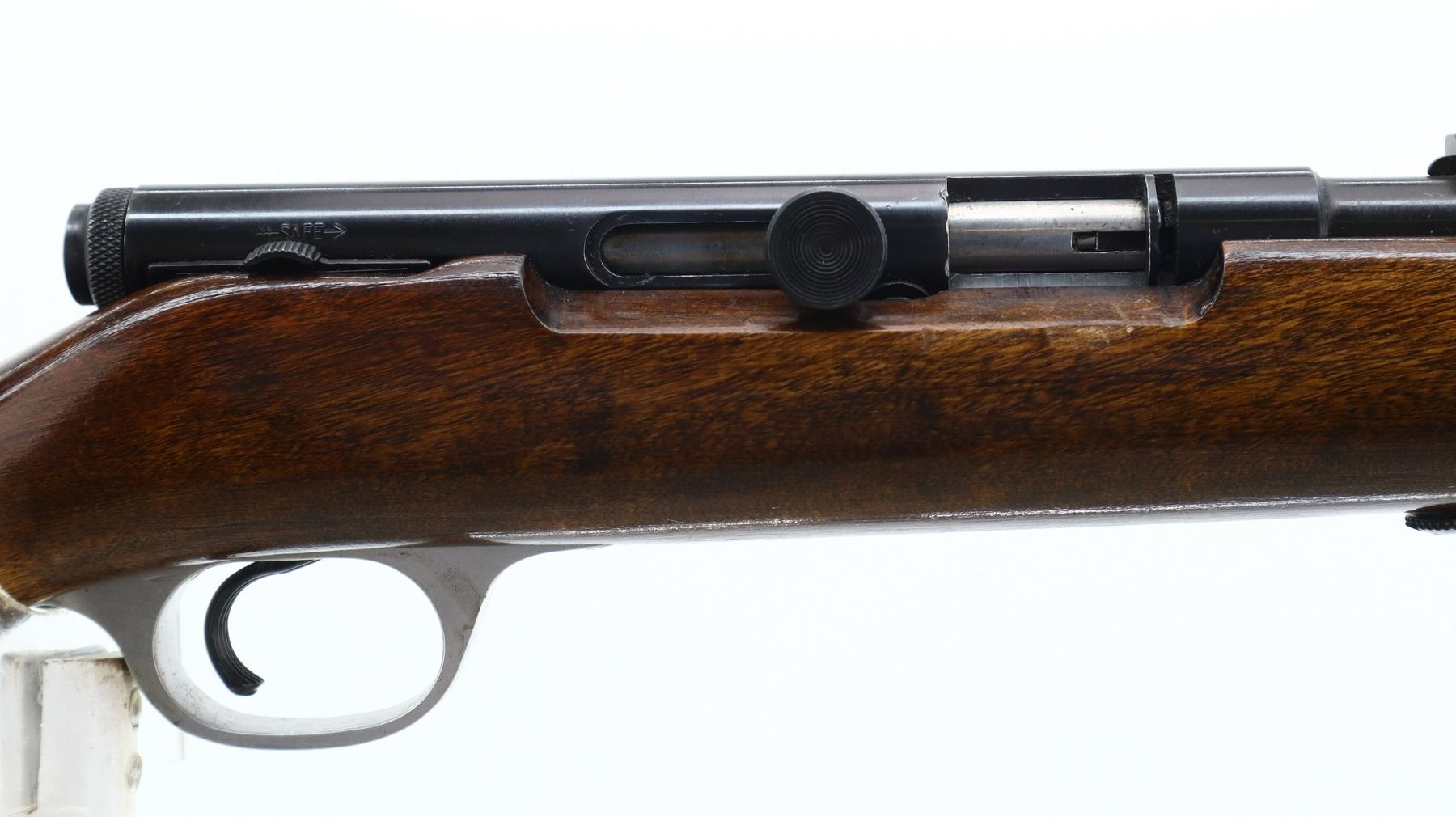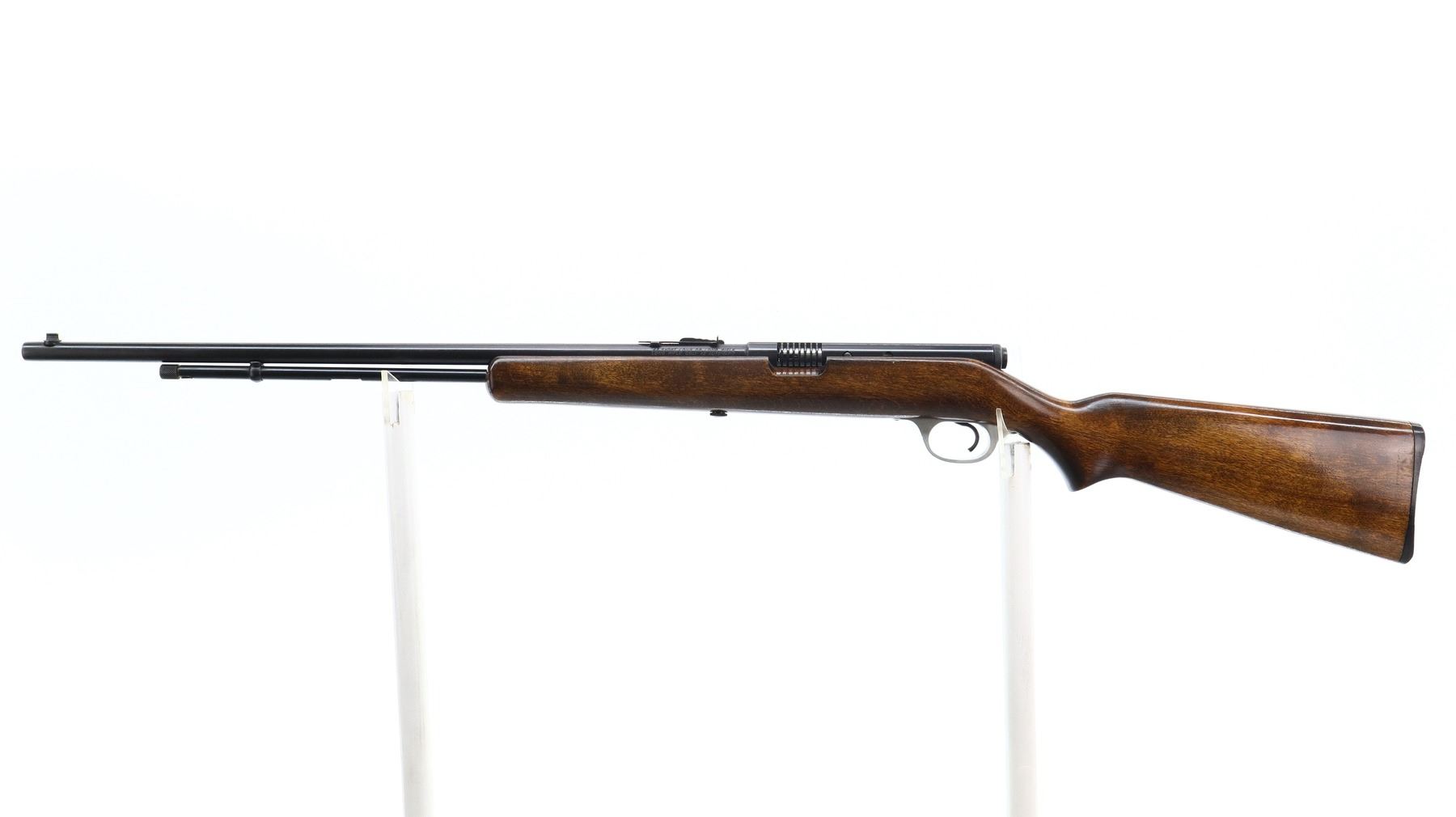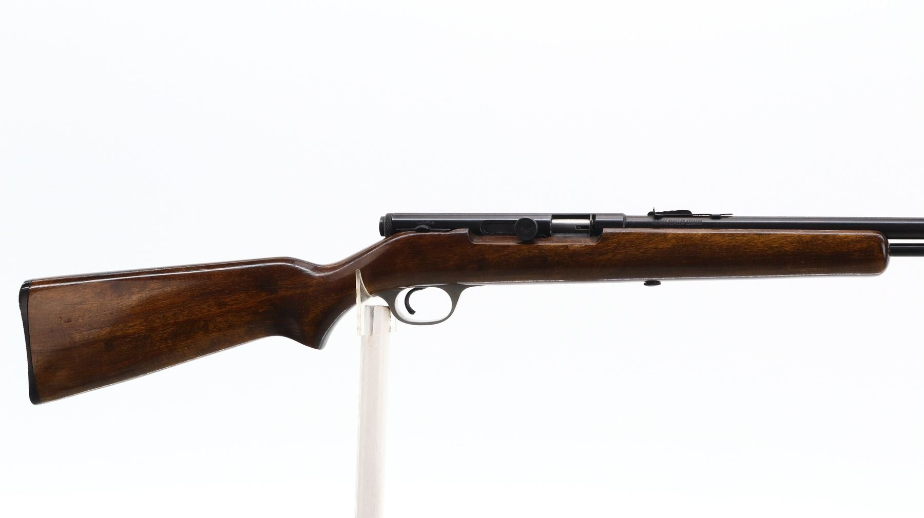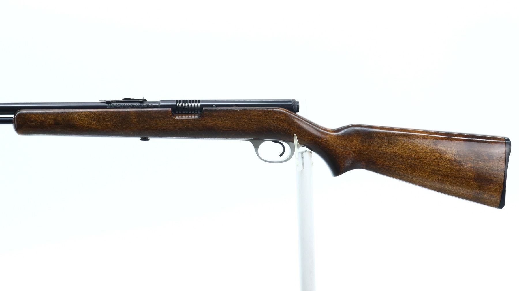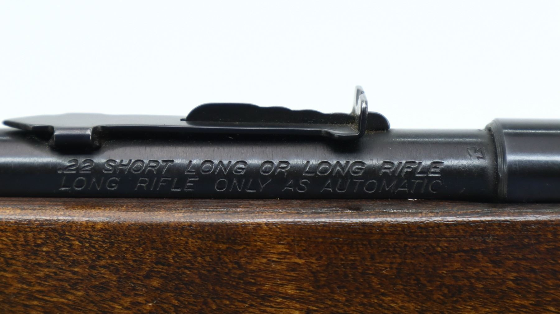 5/10, SPRINGFIELD, MODEL: 87A, CALIBER:22 LR, BORE IS VERY GOOD. BLADE FRONT SIGHT, ADJUSTABLE U NOTCHED REAR SIGHT, BLUED FINISH. ONE PIECE SMOOTH WOOD STOCK, PISTOL GRIP, GROOVED BLACK ALLOY BUTT PLATE, SILVER ALUMINUM TRIGGER GUARD, 3/4 LENGTH MAG TUBE. METAL FINISH SHOWS SOME SCRATCHES, HANDLING MARKS AND WEAR. STOCK SHOWS SOME MARKS, SCRATCHES AND WEAR. , ACTION: SEMI AUTOMATIC RIFLE, BARREL LENGTH: 24", SERIAL # NA, CONDITION: 5/10, CLASS: CANADIAN NON RESTRICTED