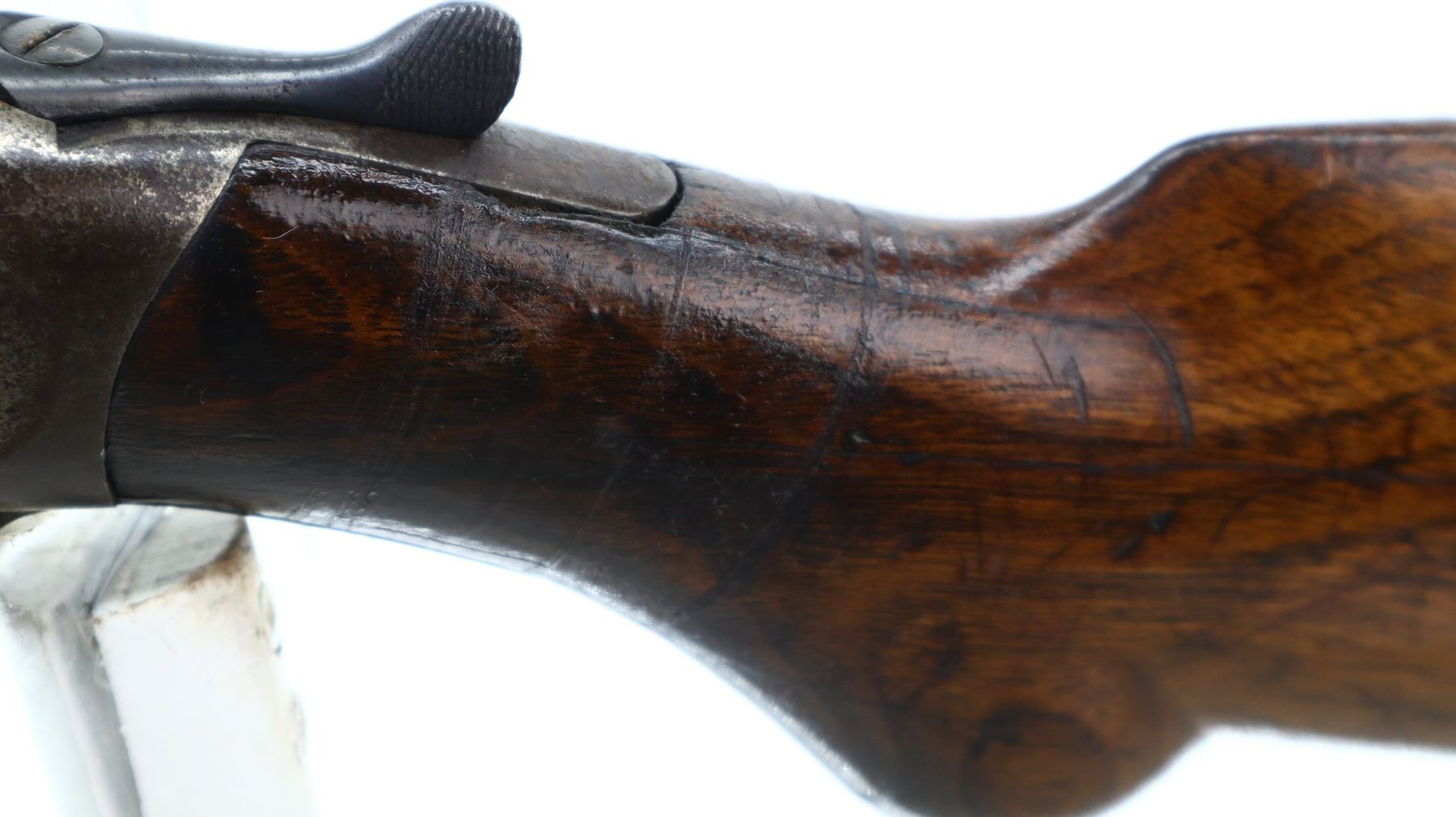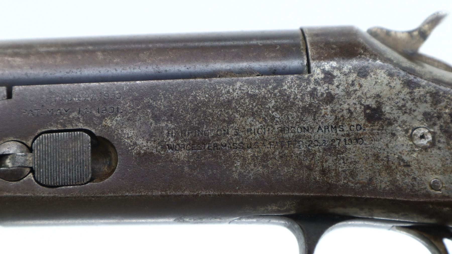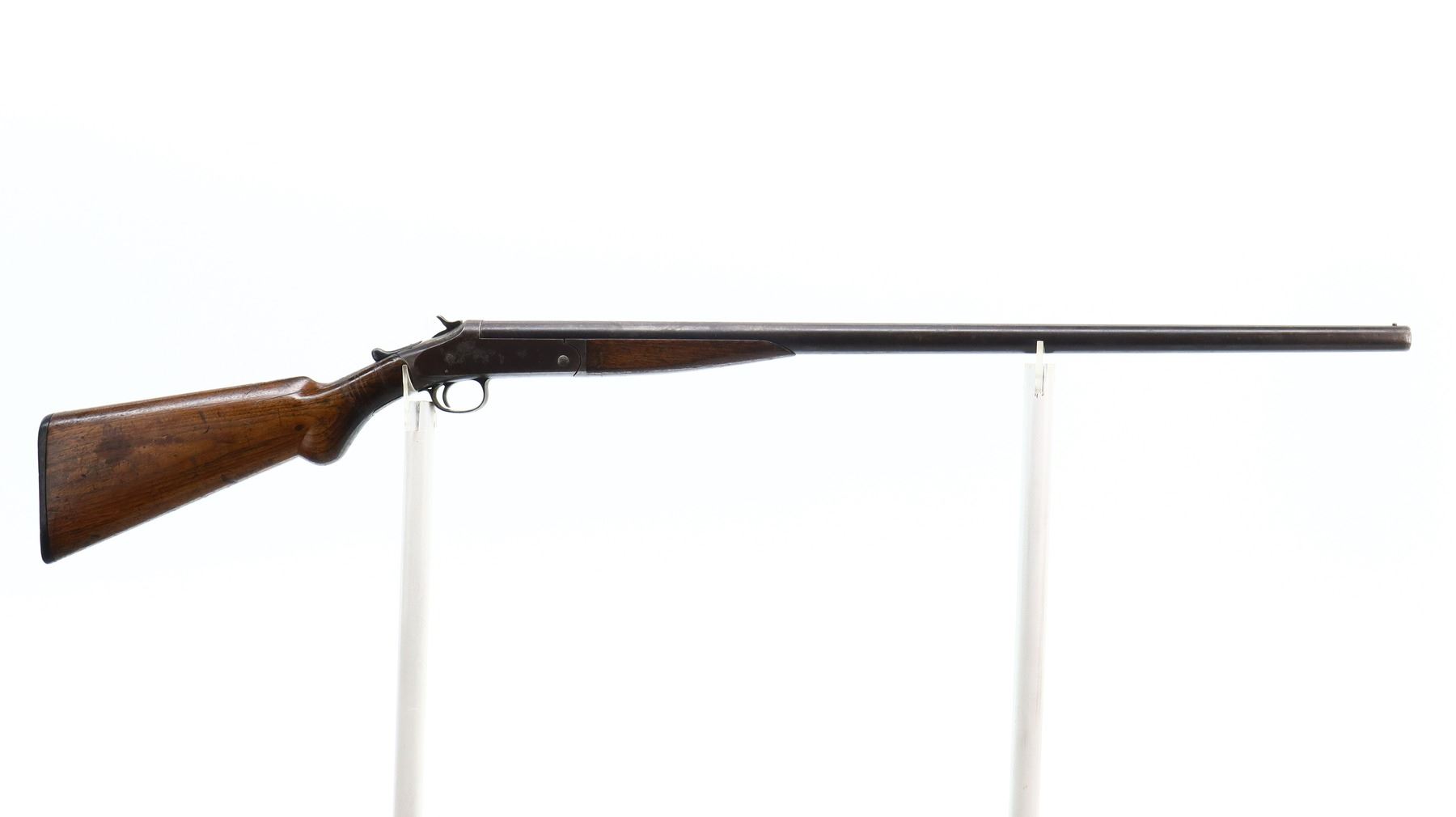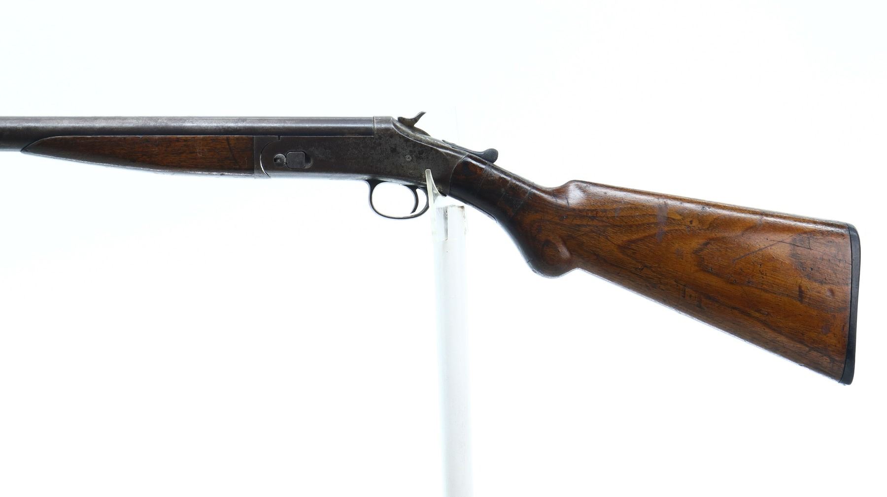 3/10, HARRINGTON & RICHARDSON, MODEL: SINGLE SHOT, CALIBER:12 G X 2 3/4", BORE IS POOR, PITTED. FIXED MOD CHOKE. BRASS BEAD, ROUND BARREL, LOOSE ON FACE, CHECKERED SPUR HAMMER, EXTRACTOR. TWO PIECE SMOOTH WOOD STOCKS, PISTOL GRIP, CRACKED AND LOOSE, CHECKERED BLACK POLYMER BUTT PLATE. METAL FINISH TURNING BROWN WITH PITTING, LIGHT RUST SPECKLES, HANDLING MARKS AND WEAR. STOCKS SHOW MARKS, SCRATCHES AND WEAR. , ACTION: HINGED SINGLE SHOT SHOTGUN, BARREL LENGTH: 30", SERIAL # 223404, CONDITION: 3/10, CLASS: CANADIAN NON RESTRICTED