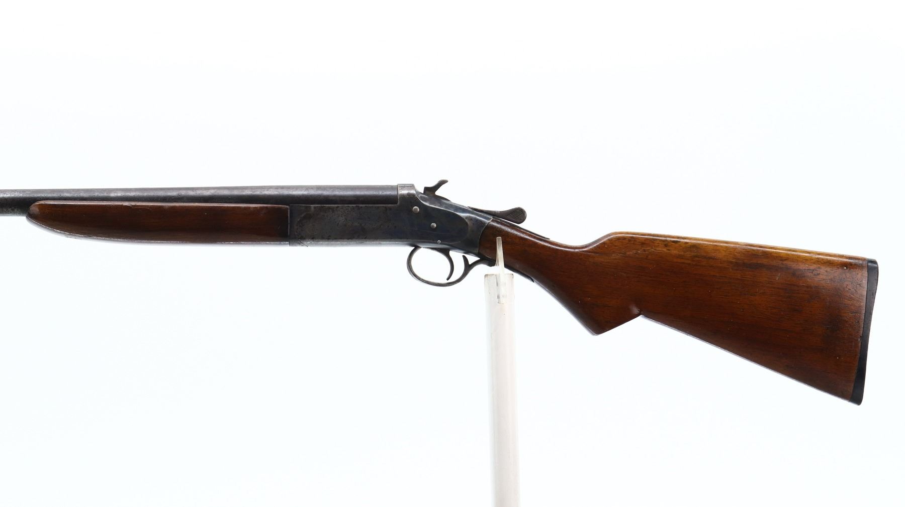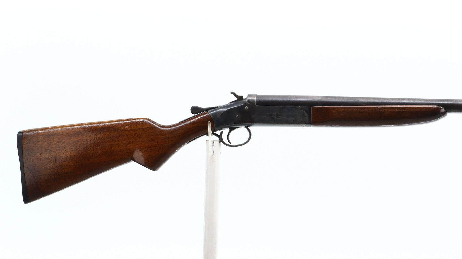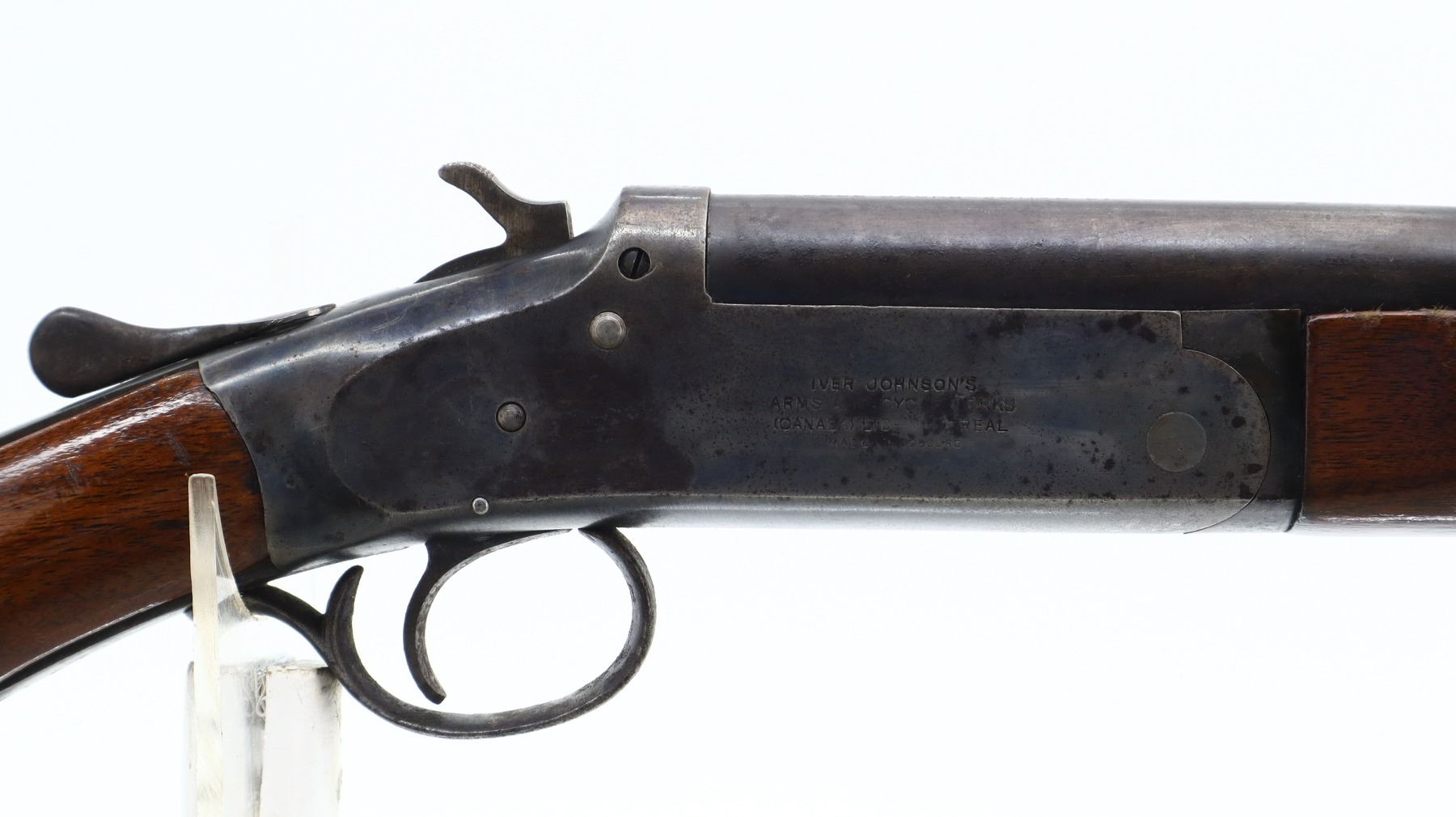 3/10, IVER JOHNSON, MODEL: CHAMPION, CALIBER:12 G X 2 3/4", BORE IS GOOD, SLIGHT PITTING. FIXED FULL CHOKE. BRASS BEAD, ROUND BARREL, COLOUR CASE HARDENED RECEIVER, CHECKERED SPUR HAMMER, EJECTOR. TWO PIECE SMOOTH WOOD STOCKS, PISTOL GRIP, GROOVED BLACK POLYMER BUTT PLATE. METAL FINISH SHOWS PITTING, LIGHT RUST SPECKLES, HANDLING MARKS AND WEAR. STOCKS SHOW MARKS, SCRATCHES AND WEAR. , ACTION: HINGED SINGLE SHOT SHOTGUN, BARREL LENGTH: 30", SERIAL # 26979, CONDITION: 3/10, CLASS: CANADIAN NON RESTRICTED