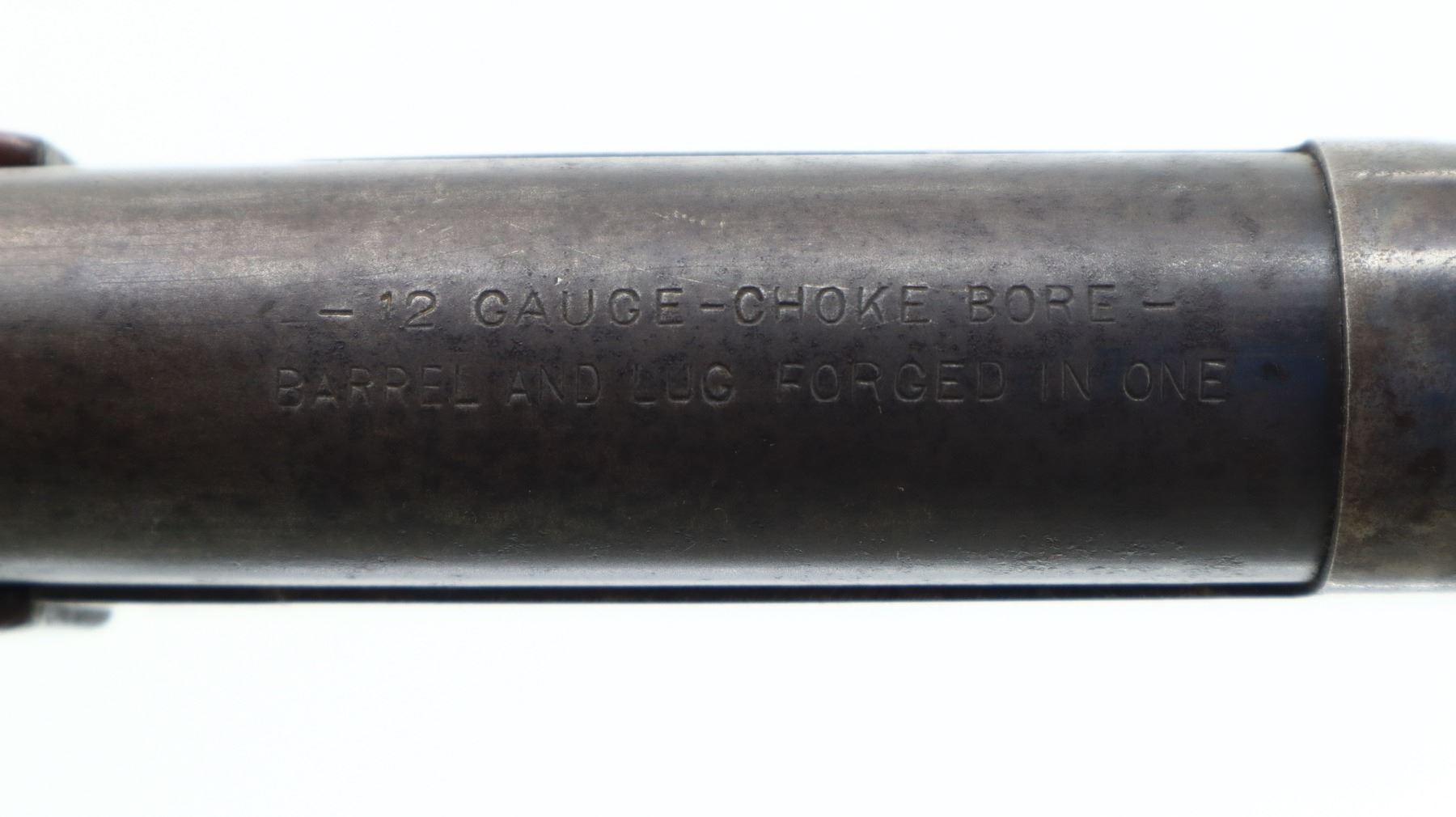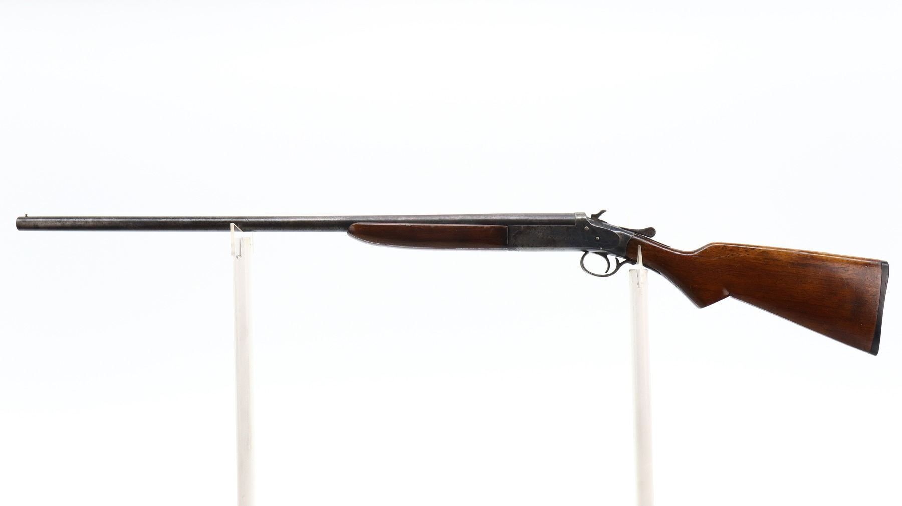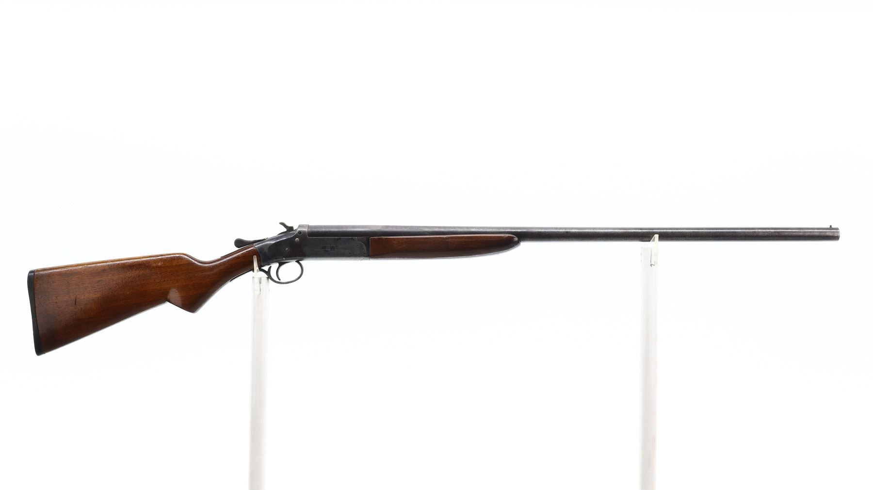 3/10, IVER JOHNSON, MODEL: CHAMPION, CALIBER:12 G X 2 3/4", BORE IS GOOD, SLIGHT PITTING. FIXED FULL CHOKE. BRASS BEAD, ROUND BARREL, COLOUR CASE HARDENED RECEIVER, CHECKERED SPUR HAMMER, EJECTOR. TWO PIECE SMOOTH WOOD STOCKS, PISTOL GRIP, GROOVED BLACK POLYMER BUTT PLATE. METAL FINISH SHOWS PITTING, LIGHT RUST SPECKLES, HANDLING MARKS AND WEAR. STOCKS SHOW MARKS, SCRATCHES AND WEAR. , ACTION: HINGED SINGLE SHOT SHOTGUN, BARREL LENGTH: 30", SERIAL # 26979, CONDITION: 3/10, CLASS: CANADIAN NON RESTRICTED