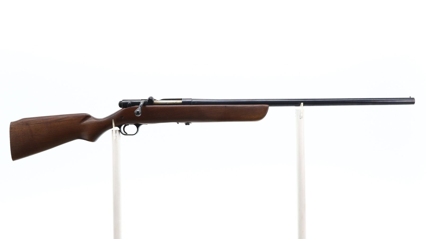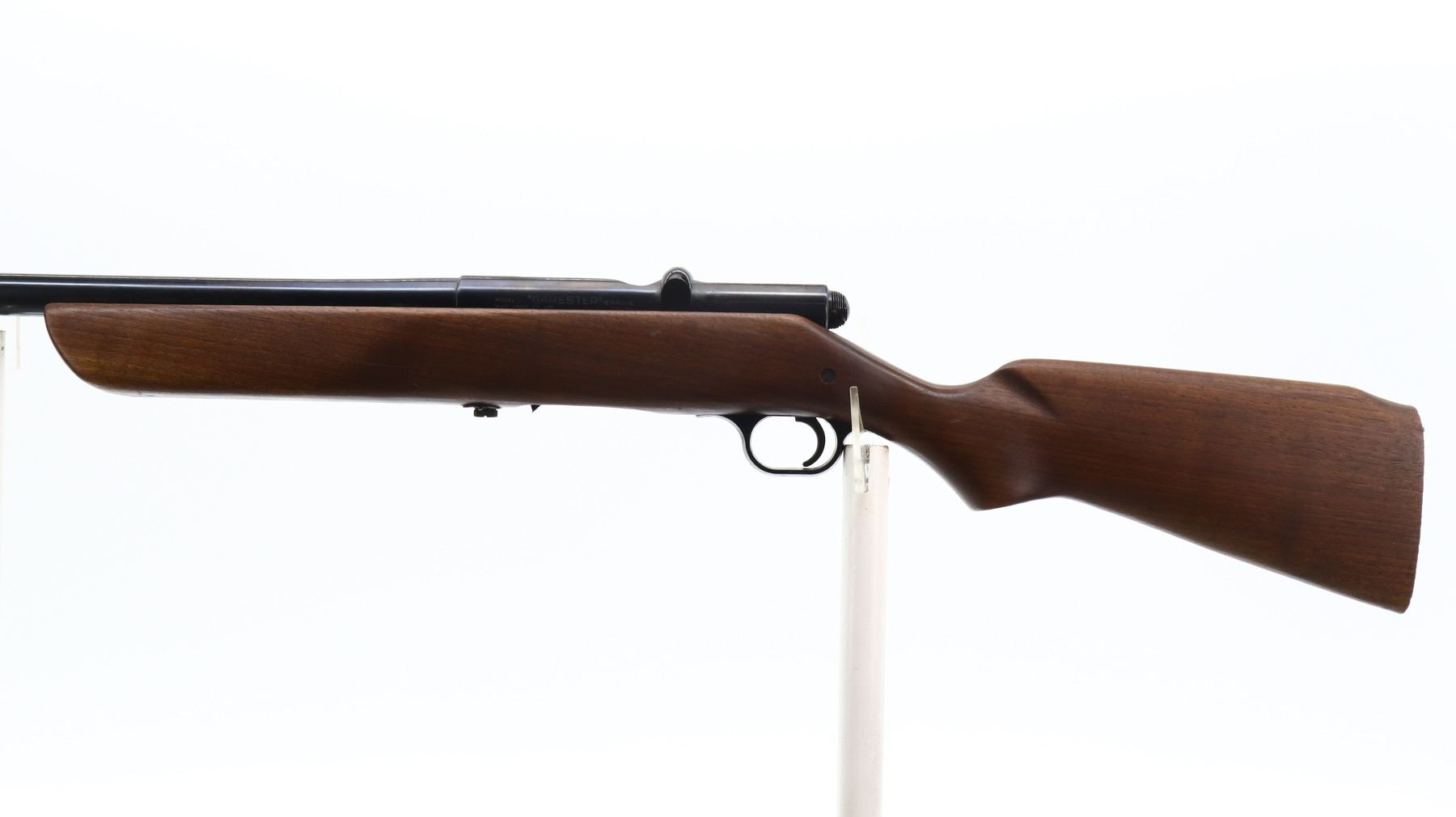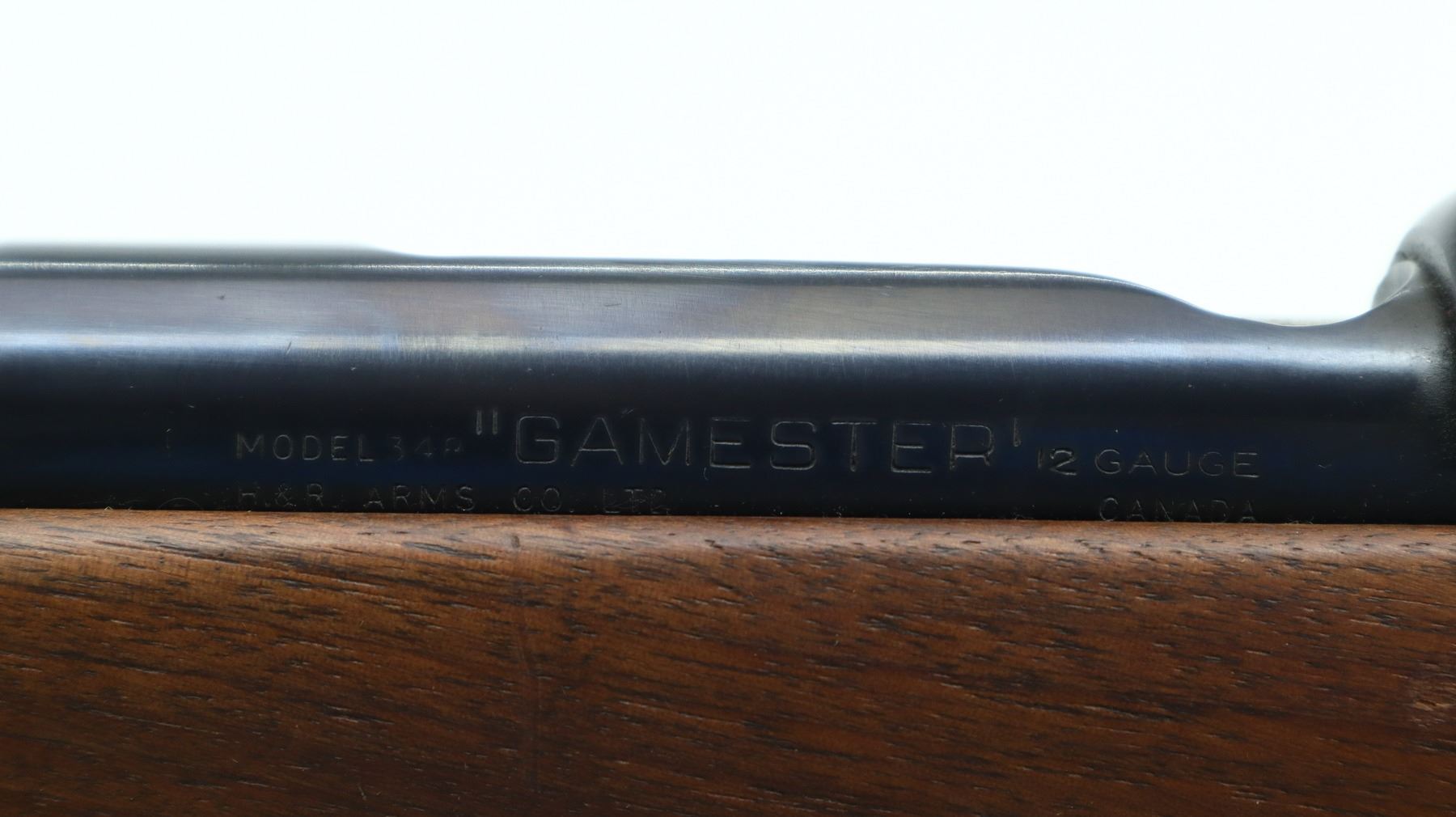 4/10, HARRINGTON & RICHARDSON, MODEL: 348 GAMESTER, CALIBER:12 G X 2 3/4", BORE IS GOOD. BRASS BEAD, METAL HAS BEEN POLISHED AND REBLUED, ROUND BARREL. ONE PIECE SMOOTH WOOD STOCK, PISTOL GRIP, MISSING BUTT PLATE. METAL FINISH SHOWS SOME SCRATCHES, HANDLING MARKS AND WEAR. STOCK SHOWS SOME MARKS, SCRATCHES AND WEAR. , ACTION: BOLT ACTION SHOTGUN, BARREL LENGTH: 26", SERIAL # NA, CONDITION: 4/10, CLASS: CANADIAN NON RESTRICTED