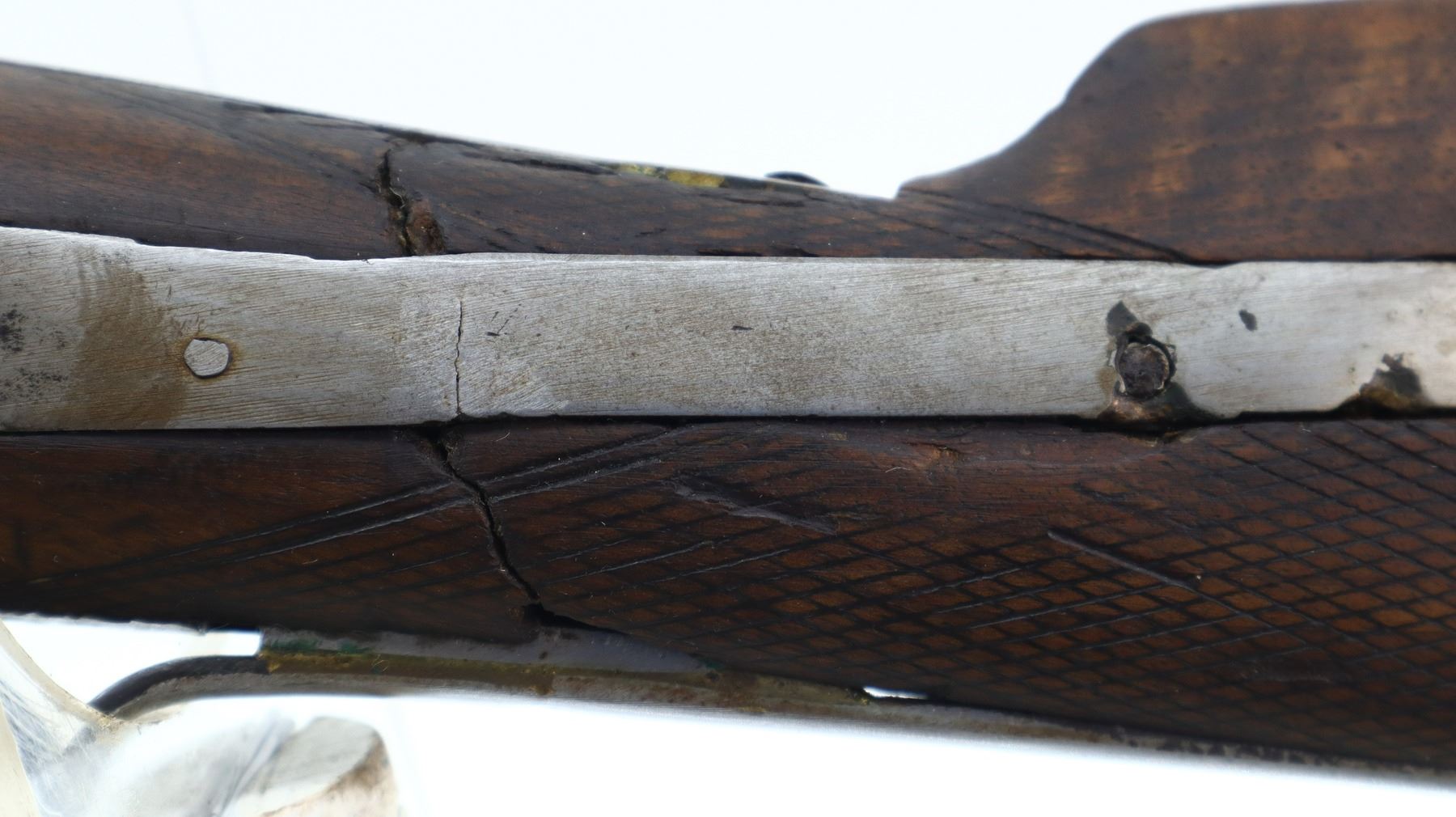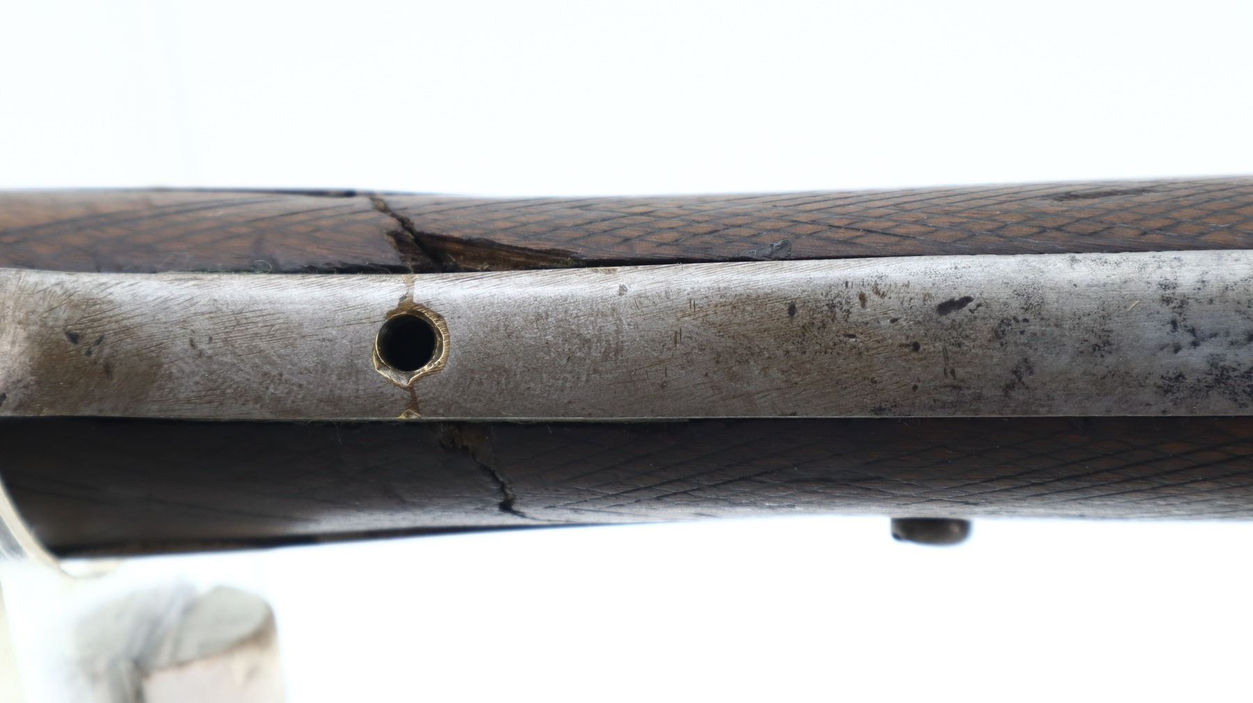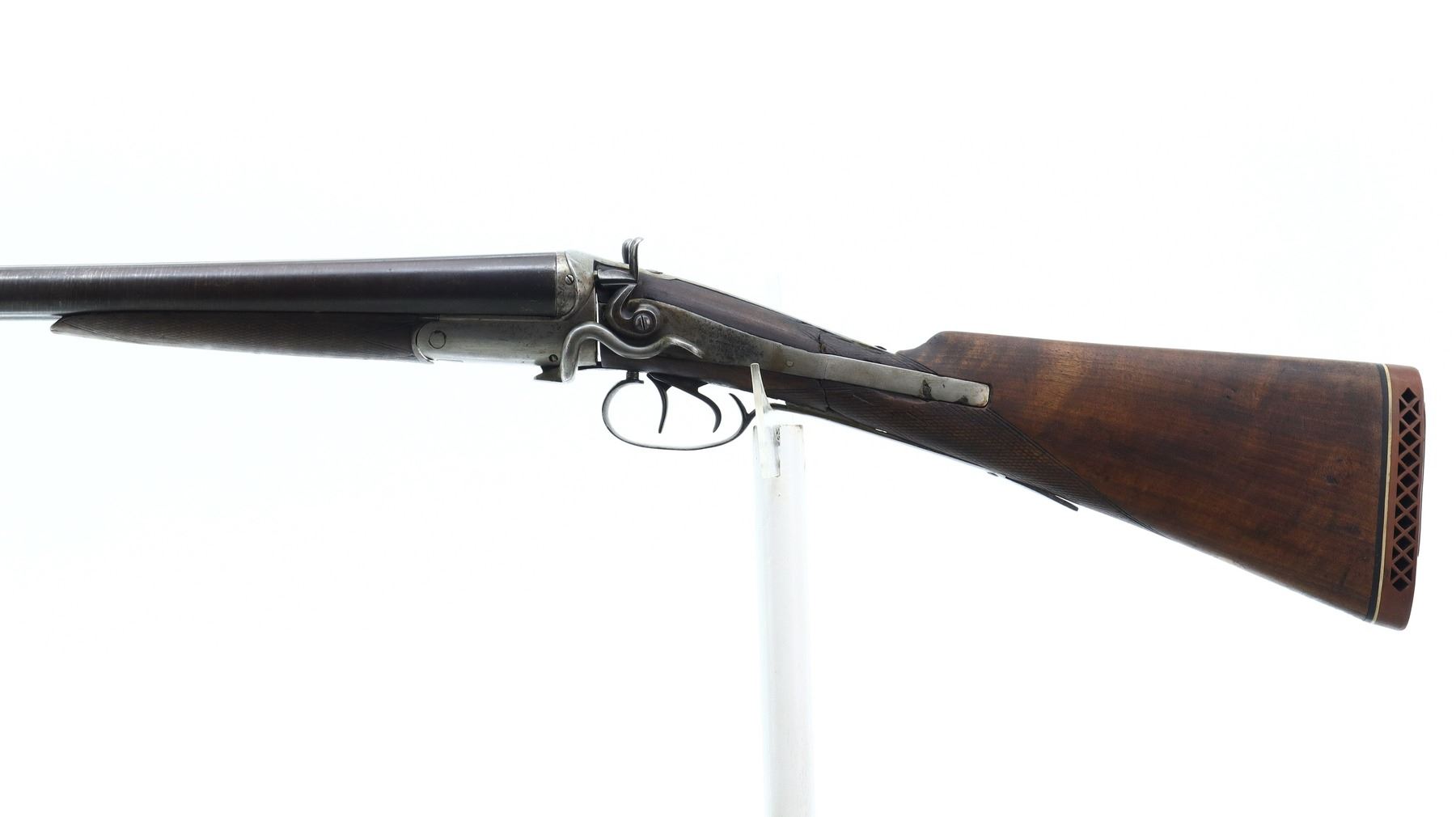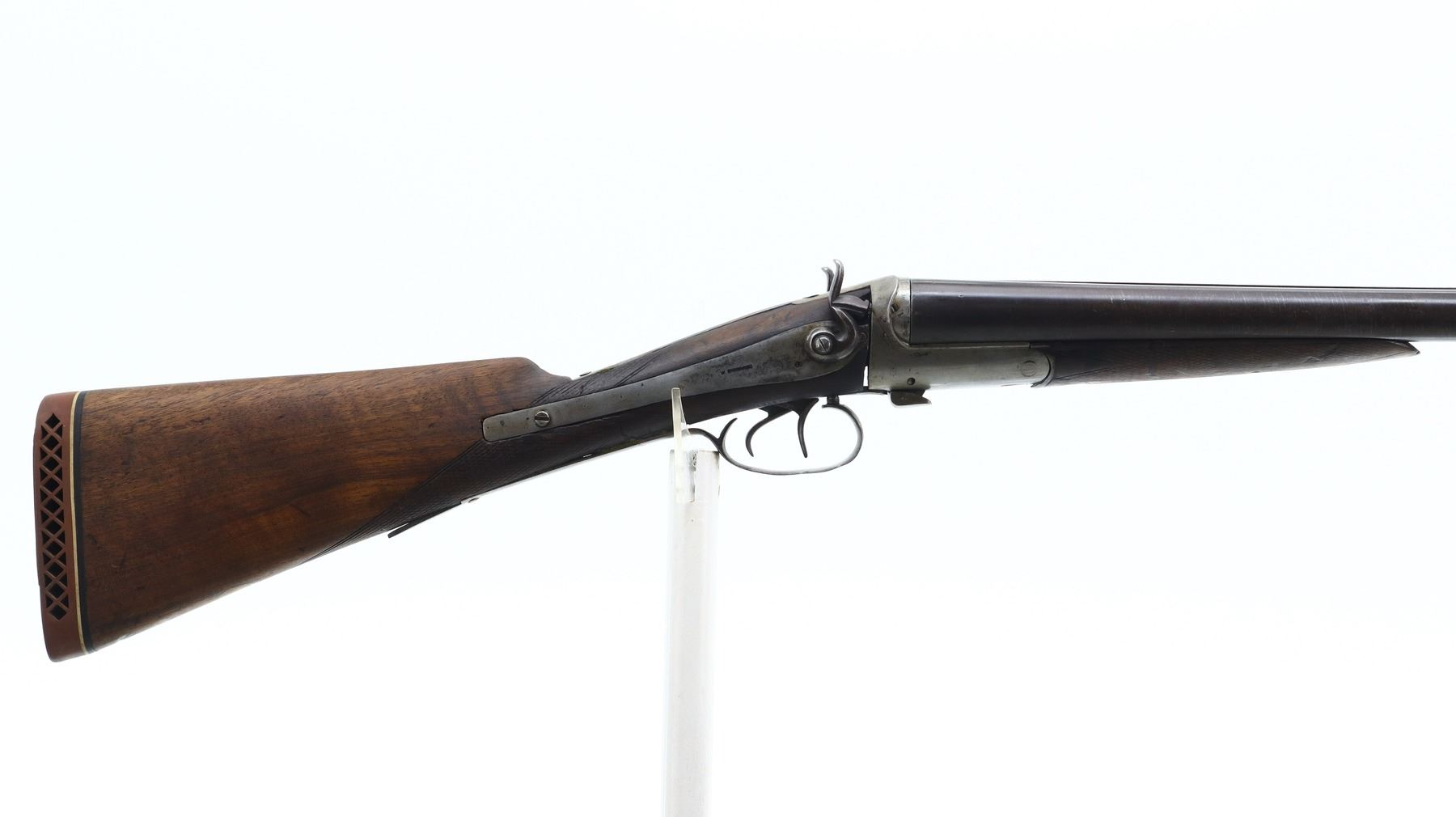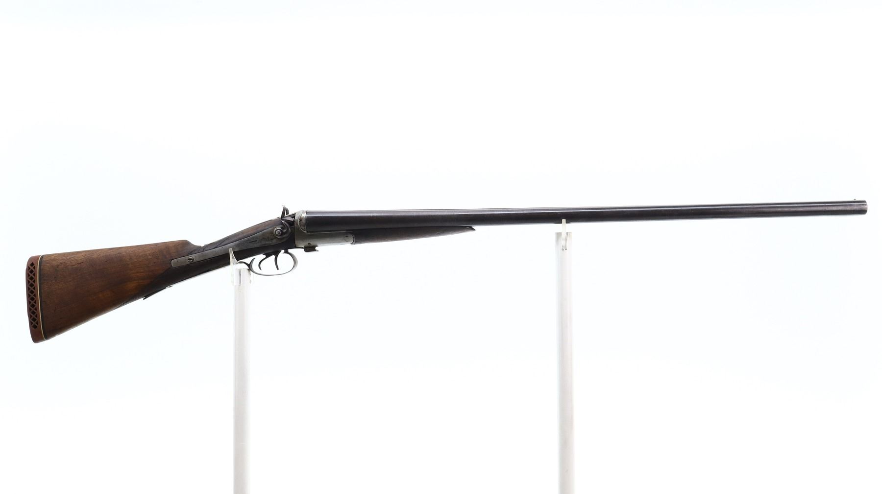 2/10, W.RICHARDS, MODEL: SIDE BY SIDE HAMMERGUN, CALIBER:10 G X 2 3/4", BORES ARE POOR, PITTED. BRASS BEAD, BROWNED DAMASCUS BARRELS WITH A FEW SMALL DENTS LOOSE ON FACE, BACK ACTION LOCKS WITH CHECKERED SPUR HAMMERS THAT DON’T FUNCTION, EXTRACTOR, LEFT SIDE OPENING LEVER. TWO PIECE WOOD STOCKS, CHECKERED FOREARM CHIPPED AND CRACKED, CHECKERED STRAIGHT GRIP CRACKED AND BROKEN, BOTH UPPER AND LOWER TANGS TRIGGER GUARD AND LOCKS HAVE BEEN WELDED AND EXTENDED IN ORDER TO FIXE STOCK (STILL BROKEN AND LOOSE). BROWN VENTED RUBBER RECOIL PAD, MISSING FRONT TANG SCREW. METAL FINISH SHOWS PITTING, LIGHT RUST SPECKLES, SCRATCHES, HANDLING MARKS AND WEAR. STOCKS SHOW MARKS, SCRATCHES AND WEAR. , ACTION: HINGED SIDE BY SIDE SHOTGUN, BARREL LENGTH: 32", SERIAL # NA, CONDITION: 2/10, CLASS: CANADIAN NON RESTRICTED