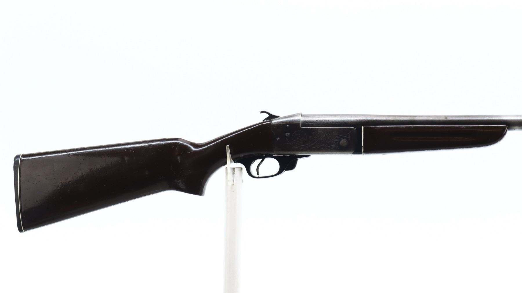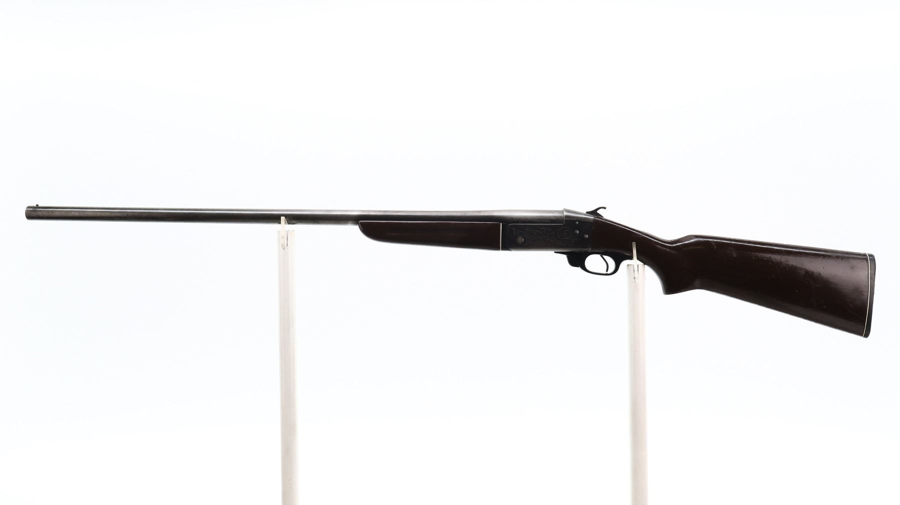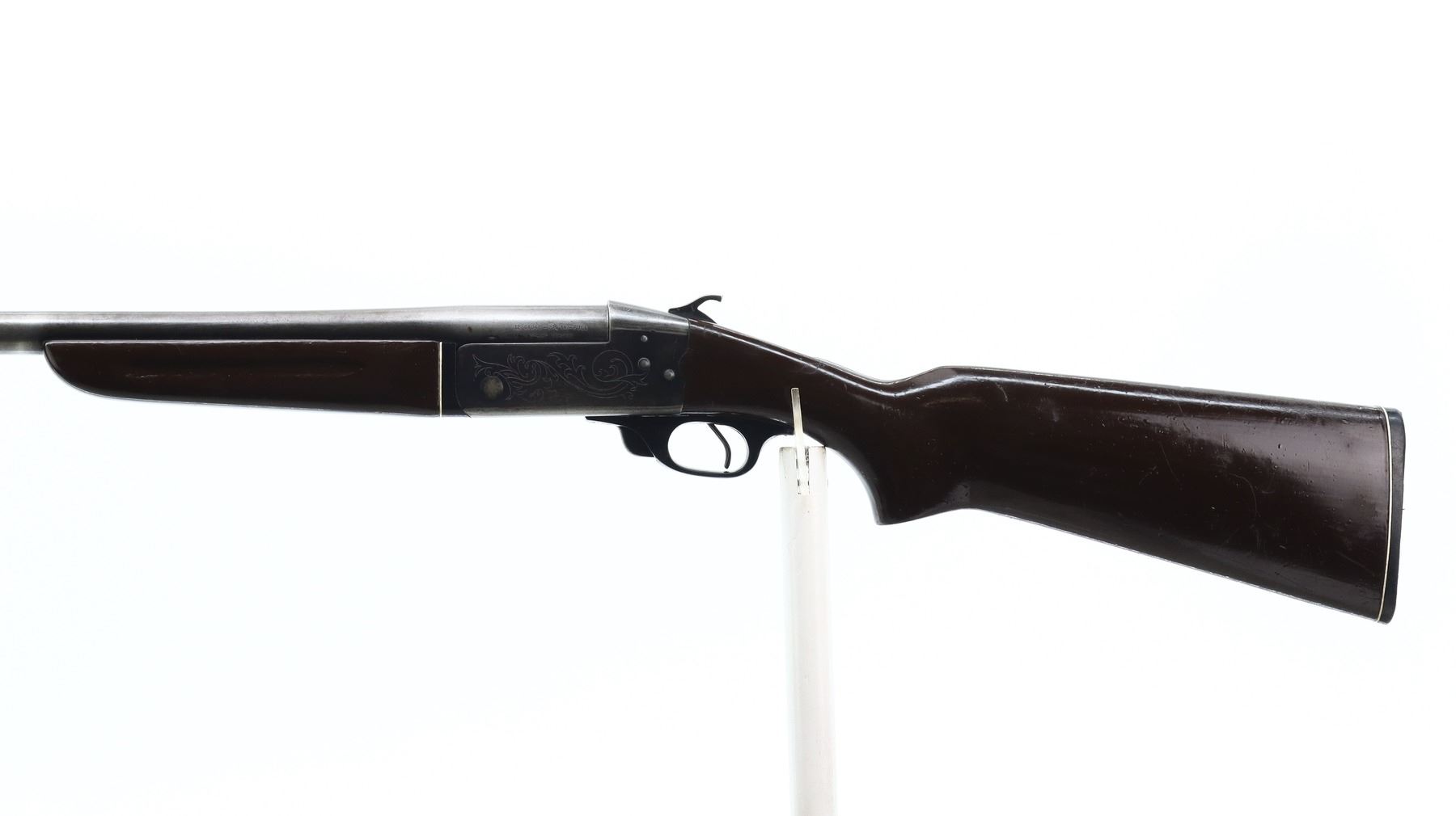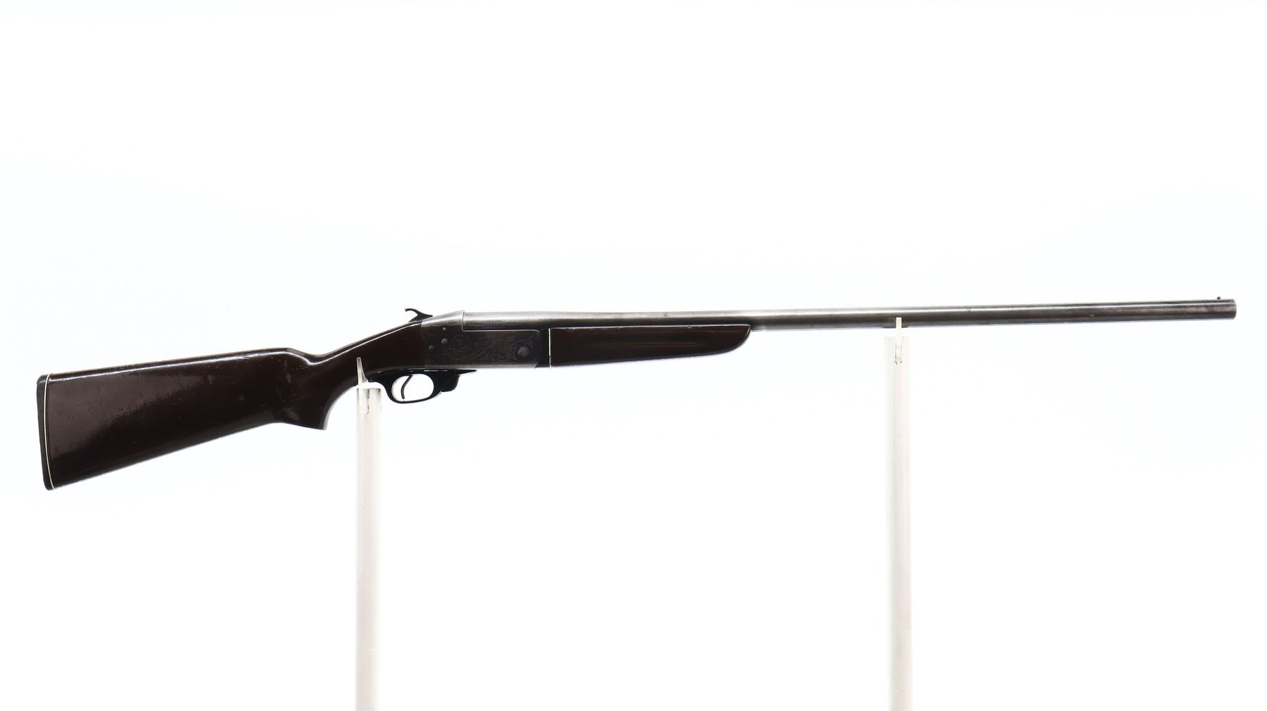 3/10, CIL, MODEL: 402, CALIBER:12 G X 2 3/4", BORE IS GOOD. FIXED FULL CHOKE. BRASS BEAD, ROUND BARREL, GROOVED SPUR HAMMER, EJECTOR, ENGRAVED RECEIVER. TWO PIECE SMOOTH WOOD STOCKS, FINGER GROOVED FOREND, PISTOL GRIP CRACKED BEHIND RECEIVER, GROOVED BLACK POLYMER BUTT PLATE. METAL FINISH TURNING SILVER GREY WITH PITTING, RUST SPECKLES, HANDLING MARKS AND WEAR. STOCKS SHOW MARKS, SCRATCHES AND WEAR. , ACTION: HINGED SINGLE SHOT SHOTGUN, BARREL LENGTH: 30", SERIAL # 78870, CONDITION: 3/10, CLASS: CANADIAN NON RESTRICTED