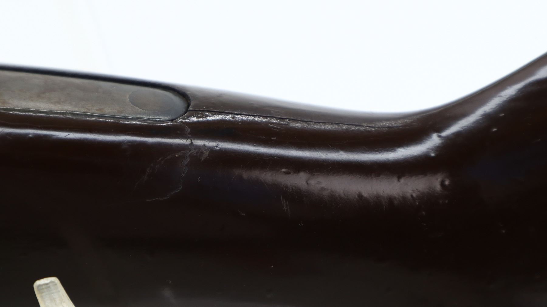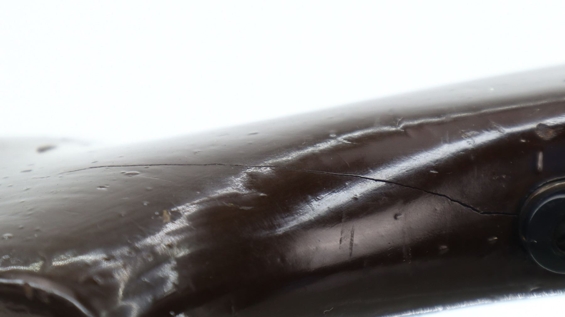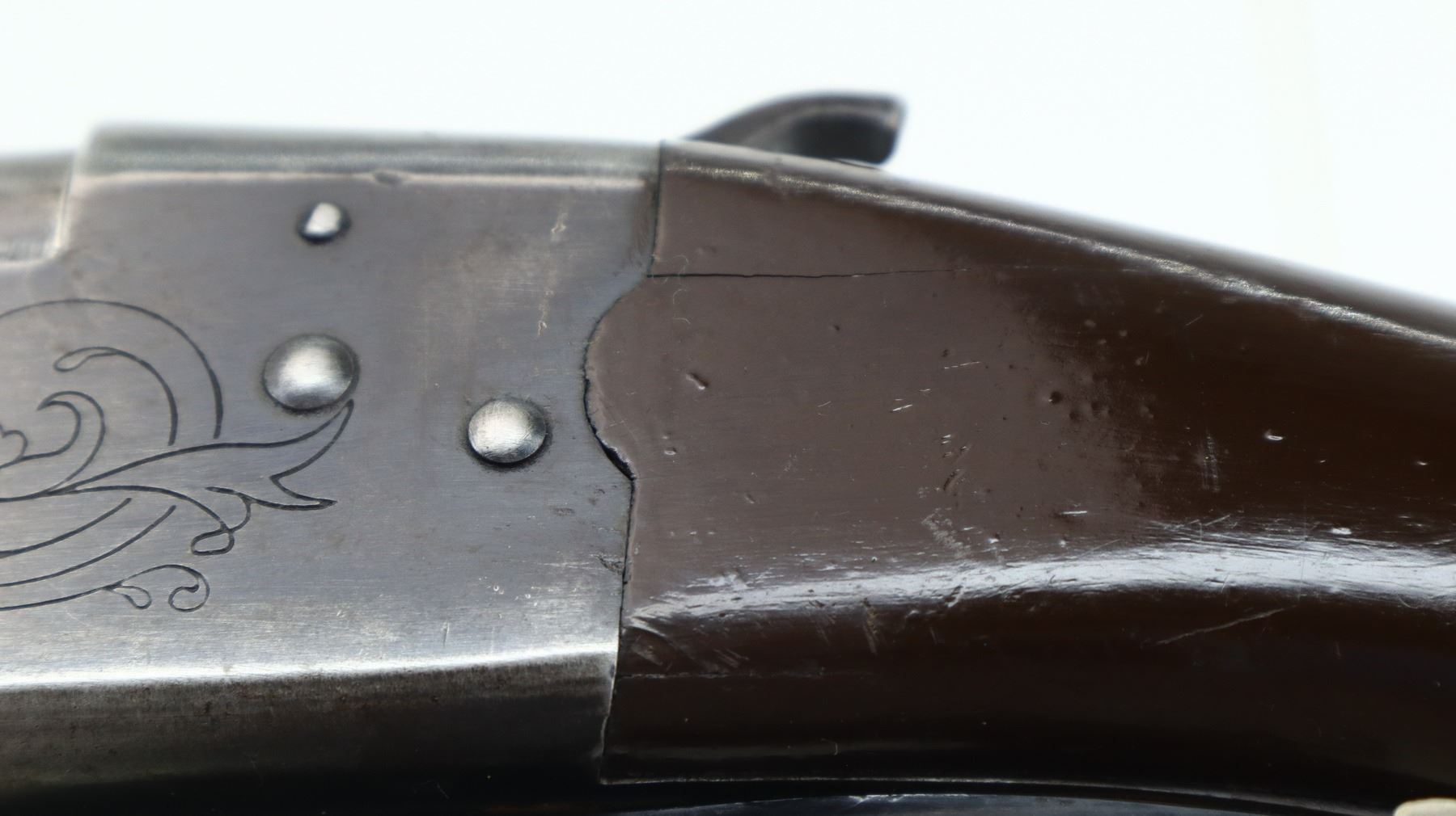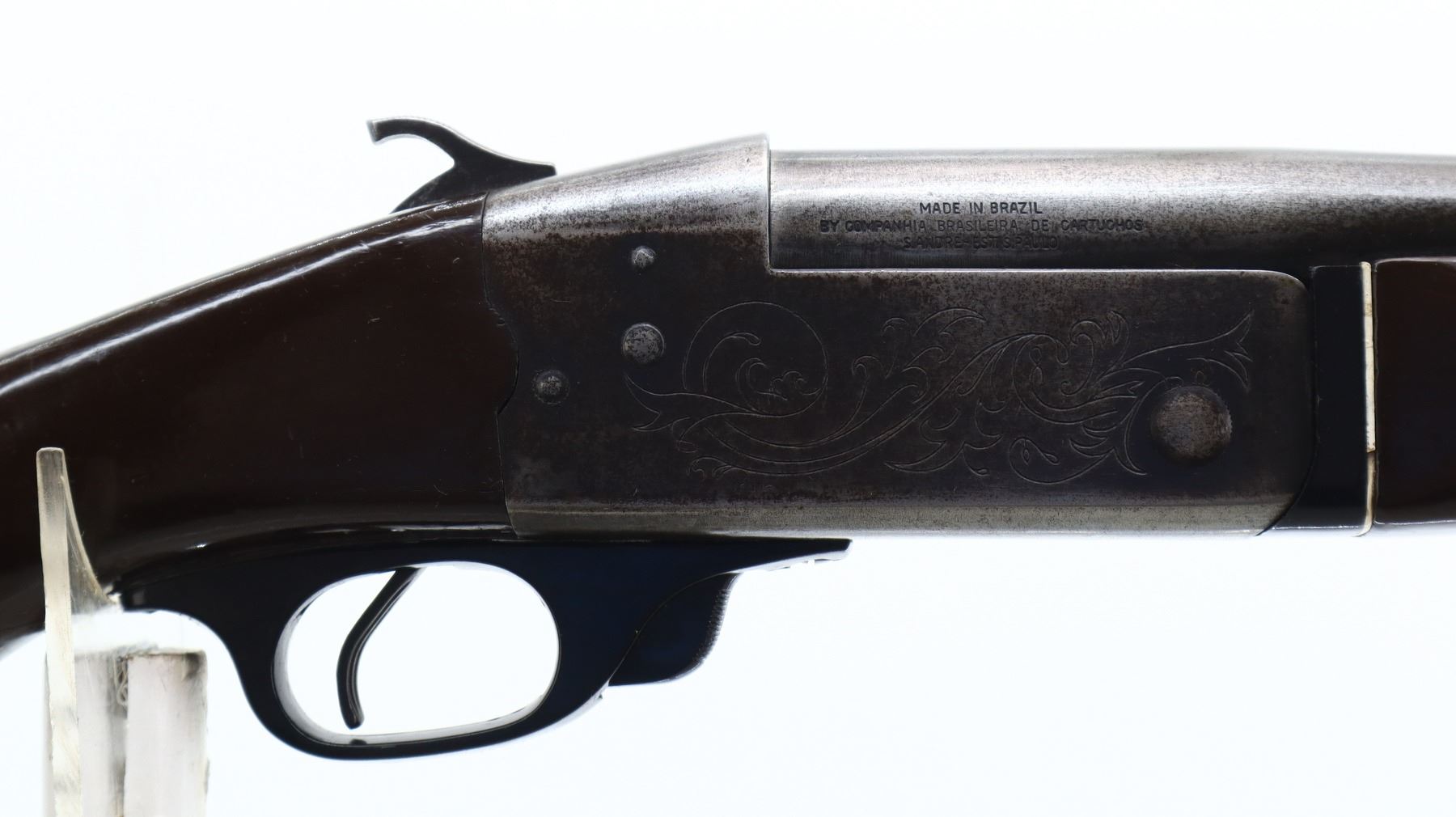 3/10, CIL, MODEL: 402, CALIBER:12 G X 2 3/4", BORE IS GOOD. FIXED FULL CHOKE. BRASS BEAD, ROUND BARREL, GROOVED SPUR HAMMER, EJECTOR, ENGRAVED RECEIVER. TWO PIECE SMOOTH WOOD STOCKS, FINGER GROOVED FOREND, PISTOL GRIP CRACKED BEHIND RECEIVER, GROOVED BLACK POLYMER BUTT PLATE. METAL FINISH TURNING SILVER GREY WITH PITTING, RUST SPECKLES, HANDLING MARKS AND WEAR. STOCKS SHOW MARKS, SCRATCHES AND WEAR. , ACTION: HINGED SINGLE SHOT SHOTGUN, BARREL LENGTH: 30", SERIAL # 78870, CONDITION: 3/10, CLASS: CANADIAN NON RESTRICTED