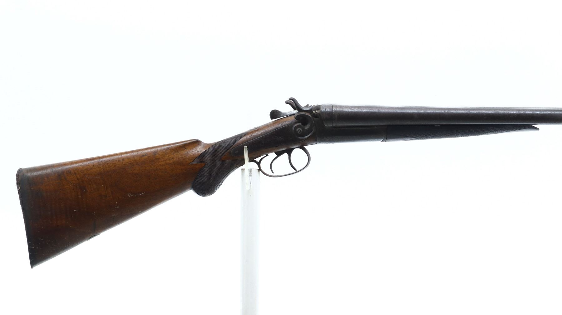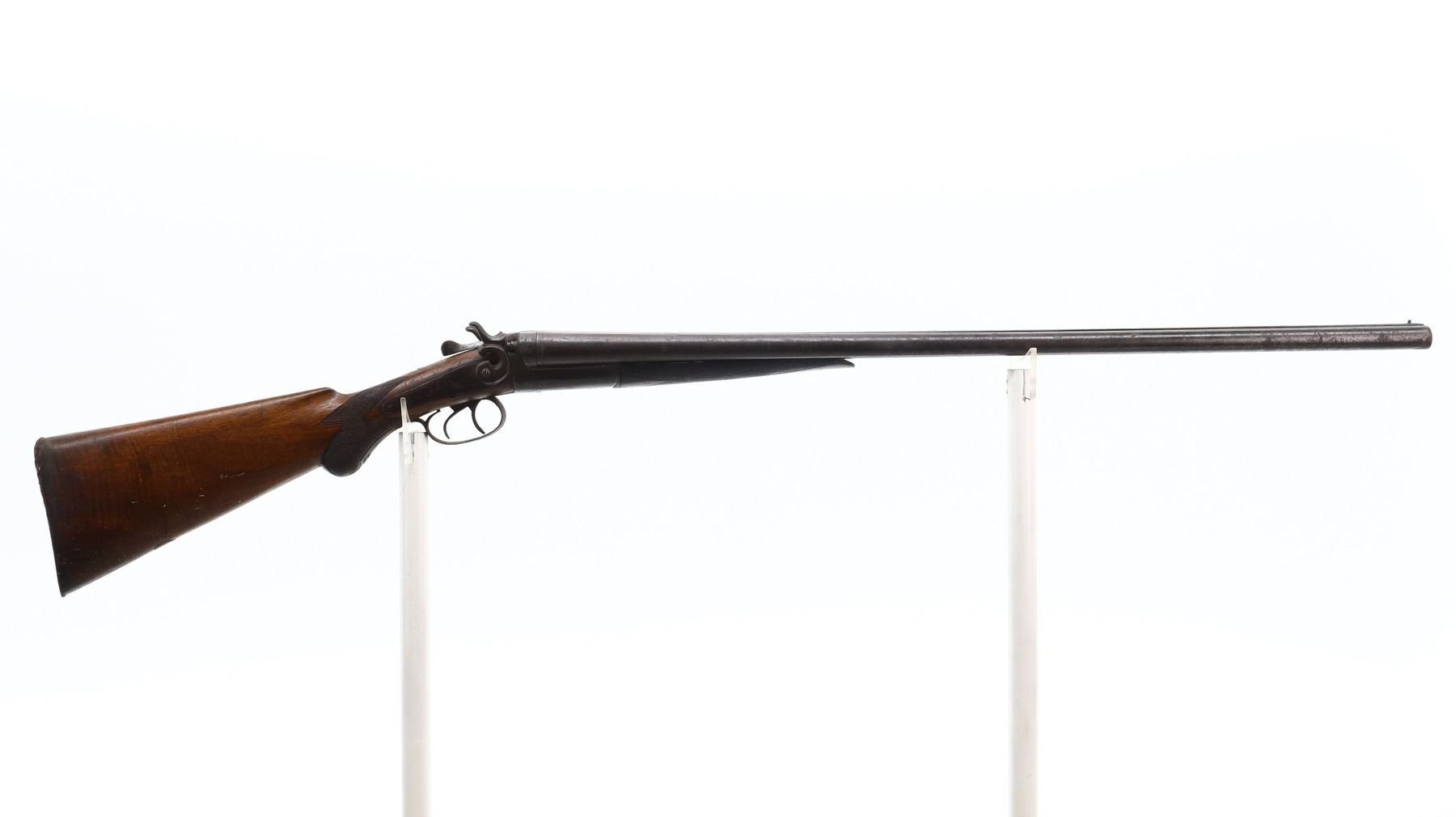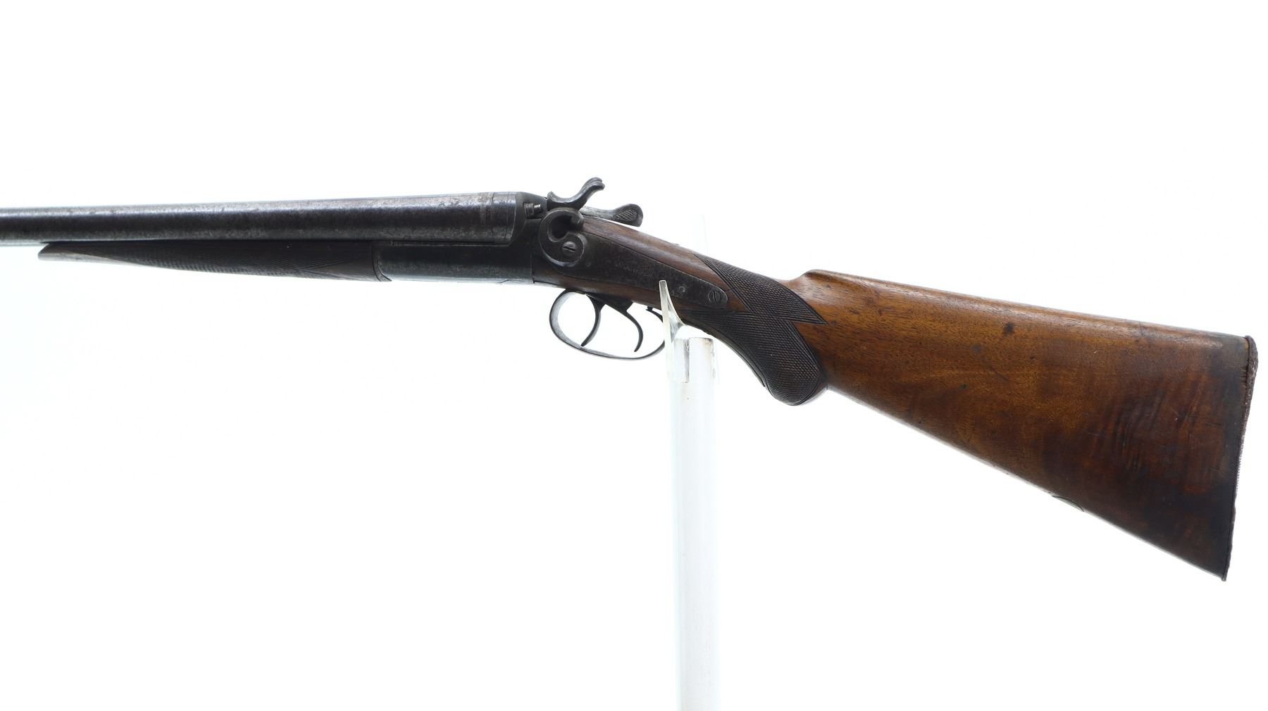2/10, J COOPER, MODEL: SIDE BY SIDE HAMMERGUN, CALIBER:12 G X 2 5/8", BORES ARE POOR, PITTED, SMALL DENTS. FIXED IM AND FULL CHOKES. BRASS BEAD, LAMINATED STEEL BARRELS, LOOSE ON FACE WITH SMOOTH RIB, BACK ACTION LOCKS WITH CHECKERED SPUR HAMMERS, RIGHT SIDE DOES NOT FUNCTION, EXTRACTOR, DOUBLE TRIGGERS. TWO PIECE WOOD STOCKS, CHECKERED FOREARM AND PISTOL GRIP, GROOVED STEEL BUTT PLATE (RUSTY). METAL FINISH TURNING BROWN WITH PITTING, LIGHT RUST, HANDLING MARKS AND WEAR. STOCKS SHOW MARKS, SCRATCHES AND WEAR. , ACTION: HINGED SIDE BY SIDE SHOTGUN, BARREL LENGTH: 30", SERIAL # 5112, CONDITION: 2/10, CLASS: CANADIAN NON RESTRICTED