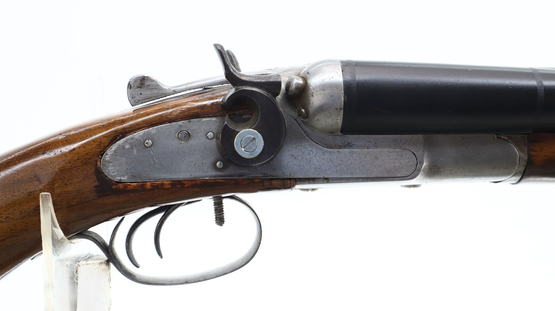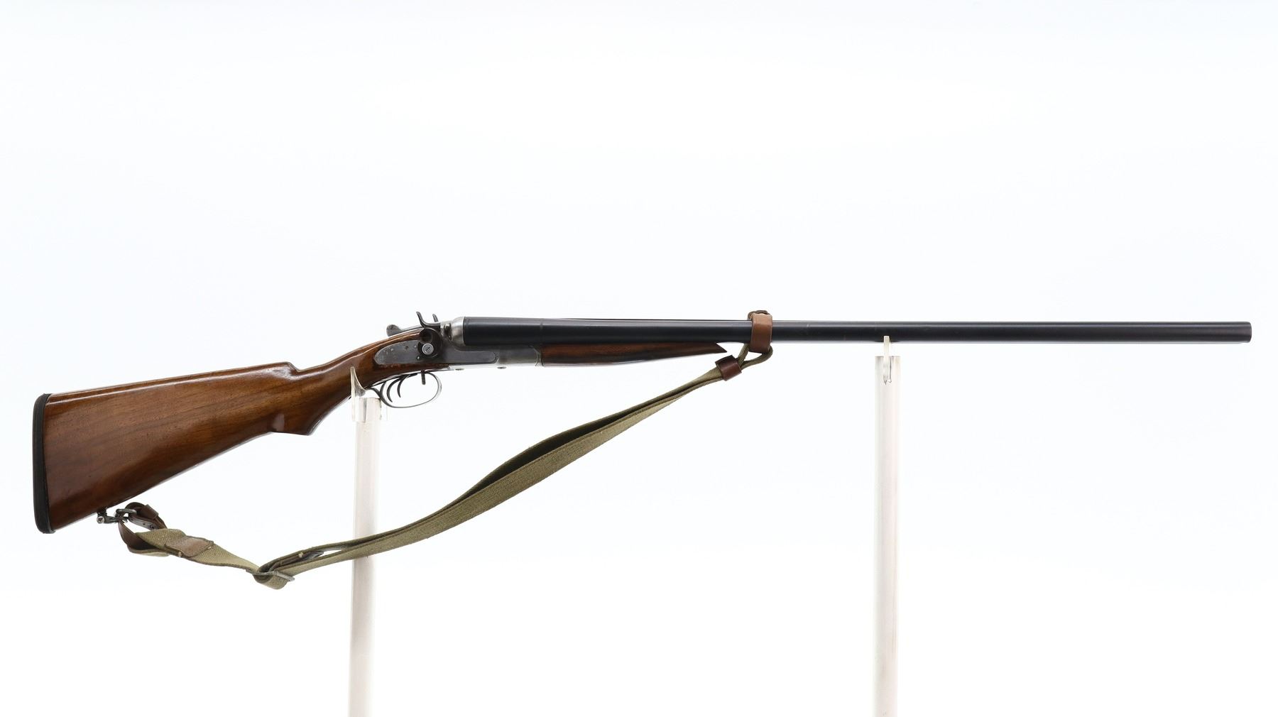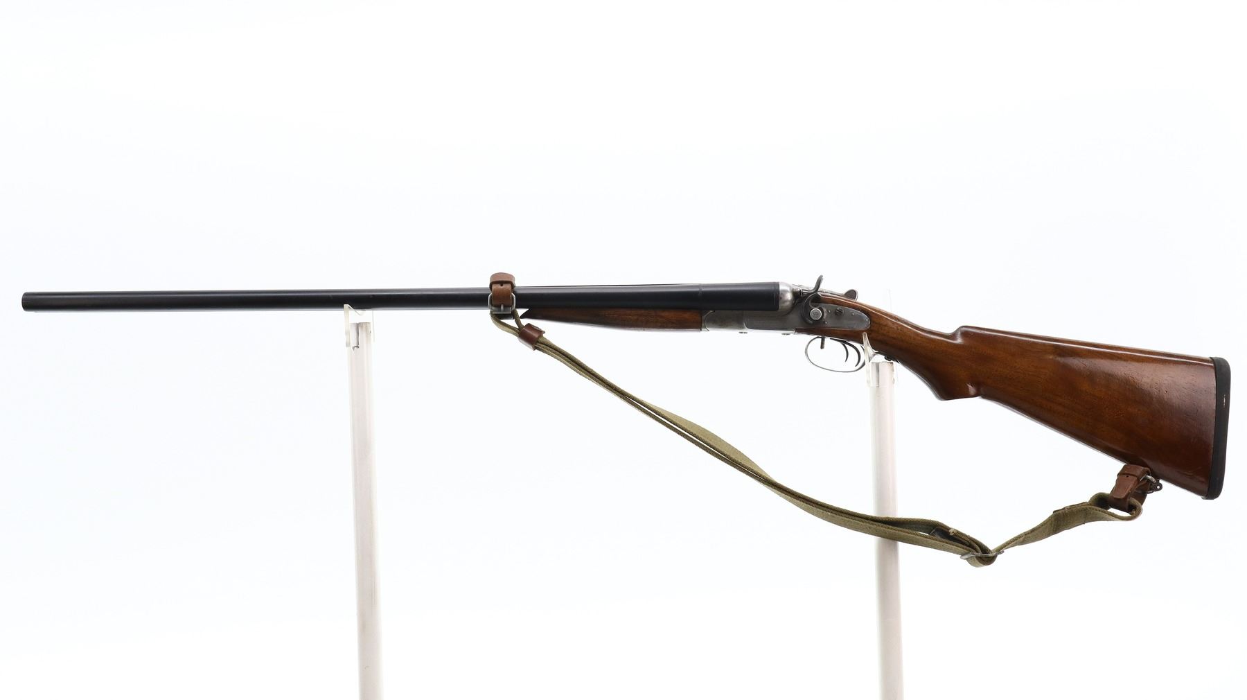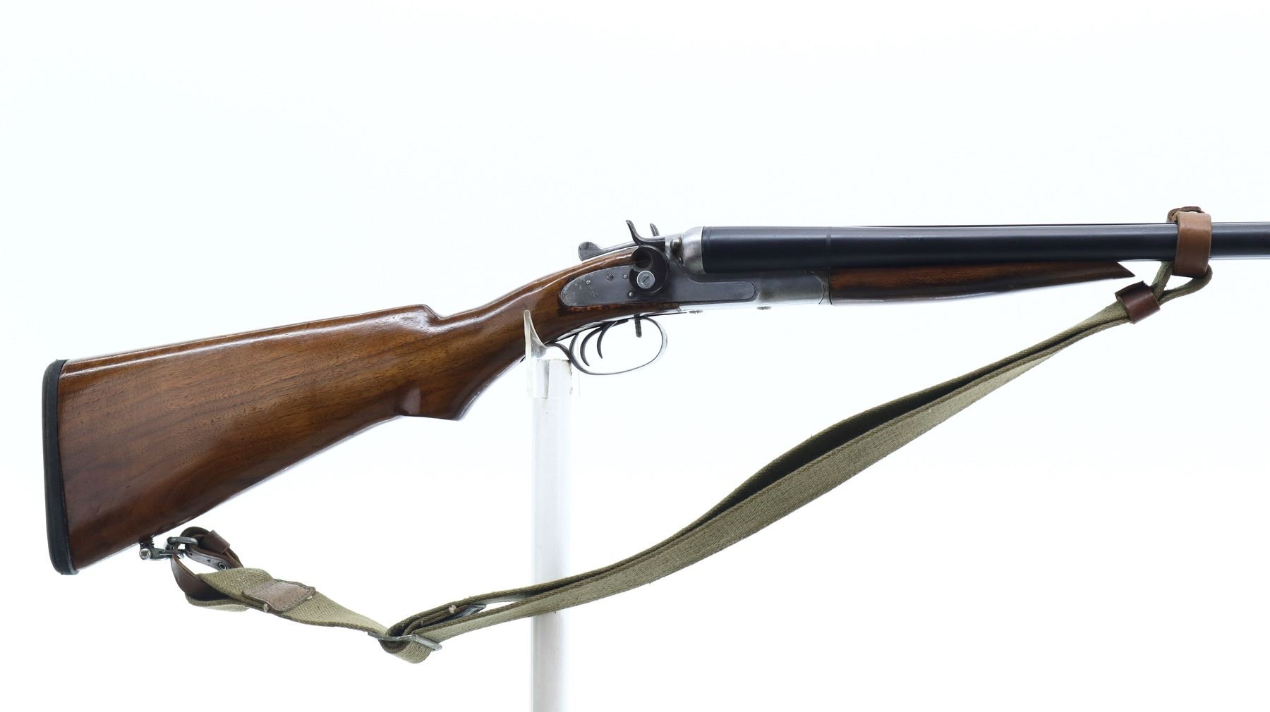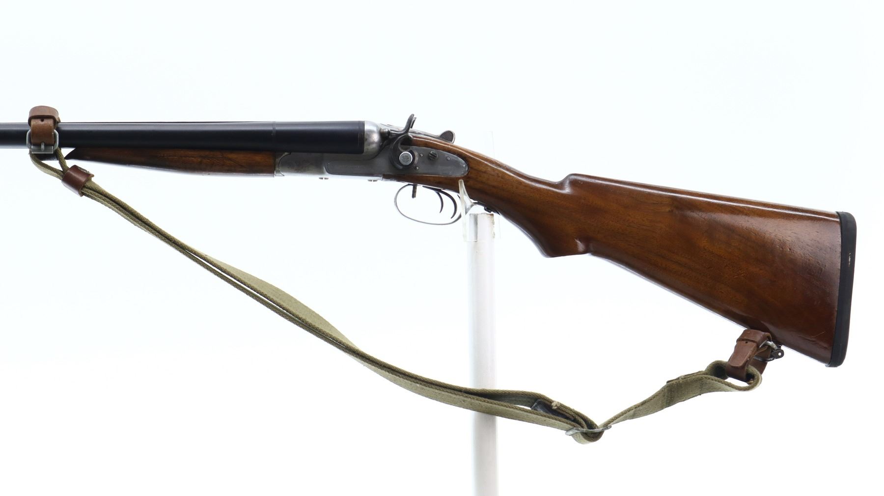 2/10, STEVENS, MODEL: SIDE BY SIDE HAMMERGUN, CALIBER:12 G X 2 3/4", BORES ARE FAIR, PITTED. FIXED FULL CHOKES. MISSING BEAD, BARRELS PAINTED BLACK, RECEIVER POLISHED, SIDE LOCKS WITH CHECKERED SPUR HAMMERS THAT DON’T FUNCTION, HAMMER SCREWS ARE REPLACED, HAMMERS ARE STILL LOOSE, EXTRACTOR. TWO PIECE WOOD STOCKS, CHECKERED FOREARM, REPLACED BUTT STOCK, PISTOL GRIP, BLACK RUBBER RECOIL PAD, SEVERAL ACTION SCREWS REPLACED DO NOT FIT CORRECTLY, REAR SWIVEL WITH CANVAS MILITARY SLING. METAL FINISH SHOWS SCRATCHES, HANDLING MARKS AND WEAR. STOCKS SHOW MARKS, SCRATCHES AND WEAR. , ACTION: HINGED SIDE BY SIDE SHOTGUN, BARREL LENGTH: 30", SERIAL # 3305, CONDITION: 2/10, CLASS: CANADIAN NON RESTRICTED