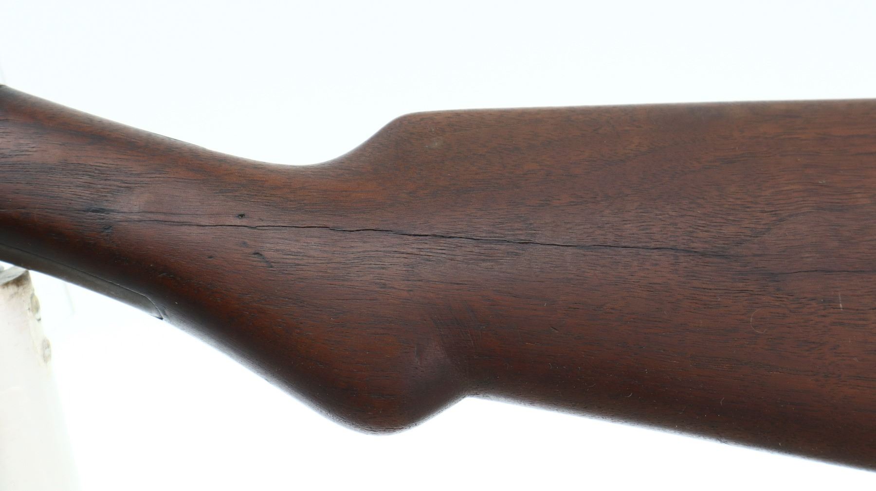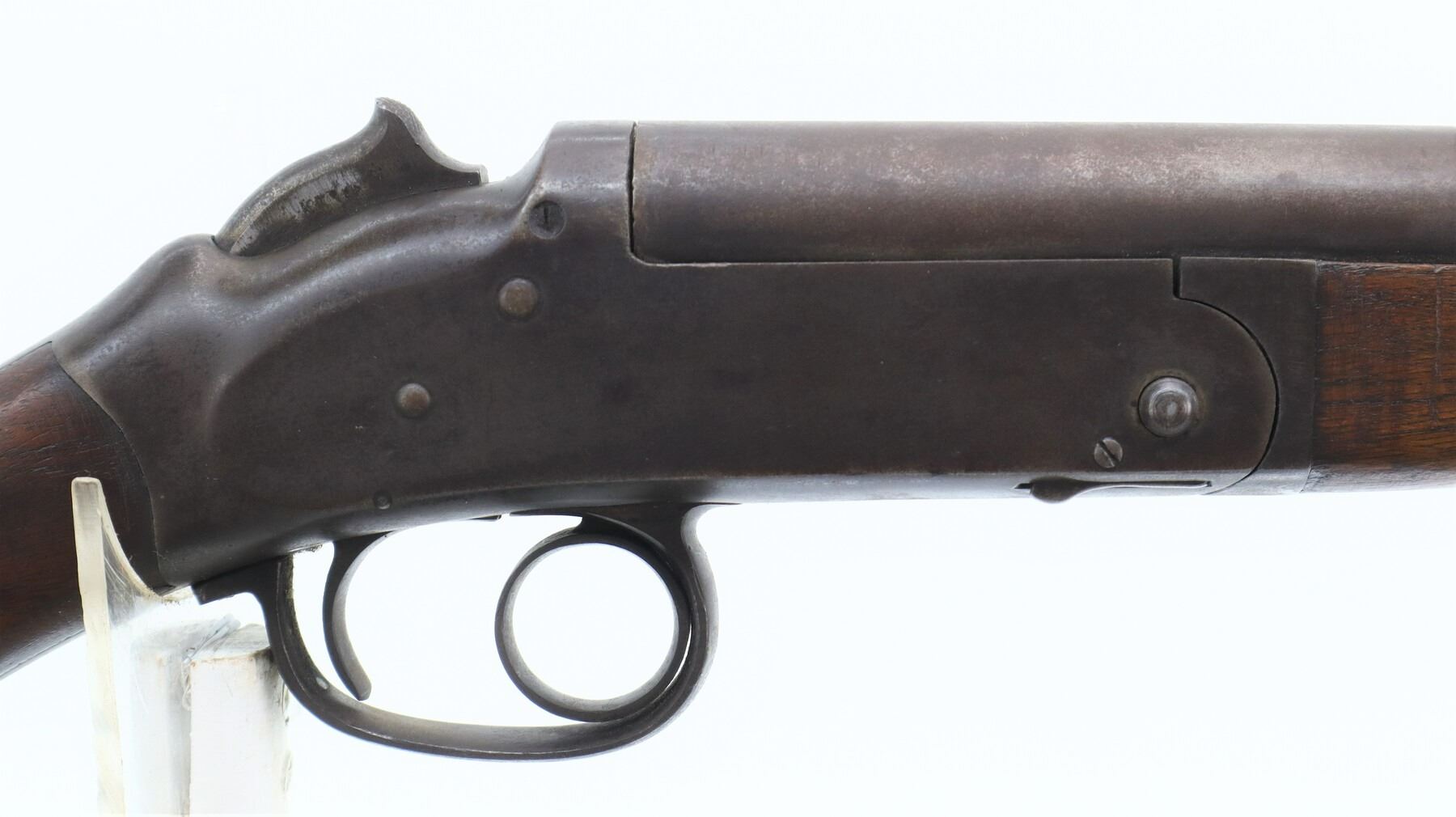 3/10, IVER JOHNSON, MODEL: SINGLE SHOT, CALIBER:12 G X 2 1/2", BORE IS POOR, PITTED. FIXED CYLINDER CHOKE. BRASS BEAD, ROUND BARREL, CHECKERED SPUR HAMMER, EXTRACTOR, RING OPENING LEVER INSIDE TRIGGER GUARD. TWO PIECE SMOOTH WOOD STOCKS, PISTOL GRIP CRACKED THROUGH WRIST, CHECKERED BLACK POLYMER BUTT PLATE. METAL FINISH TURNING BROWN WITH PITTING, LIGHT RUST, HANDLING MARKS AND WEAR. STOCKS SHOW MARKS, SCRATCHES AND WEAR. , ACTION: HINGED SINGLE SHOT SHOTGUN, BARREL LENGTH: 26.25", SERIAL # NA, CONDITION: 3/10, CLASS: CANADIAN NON RESTRICTED