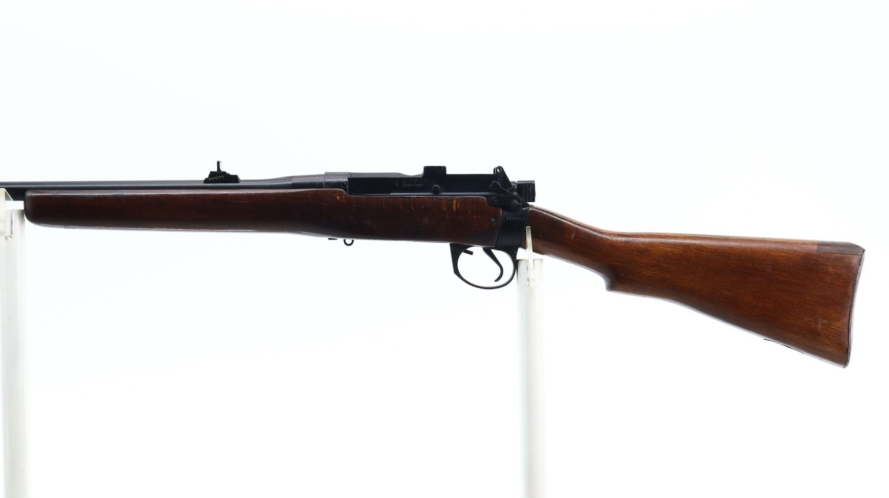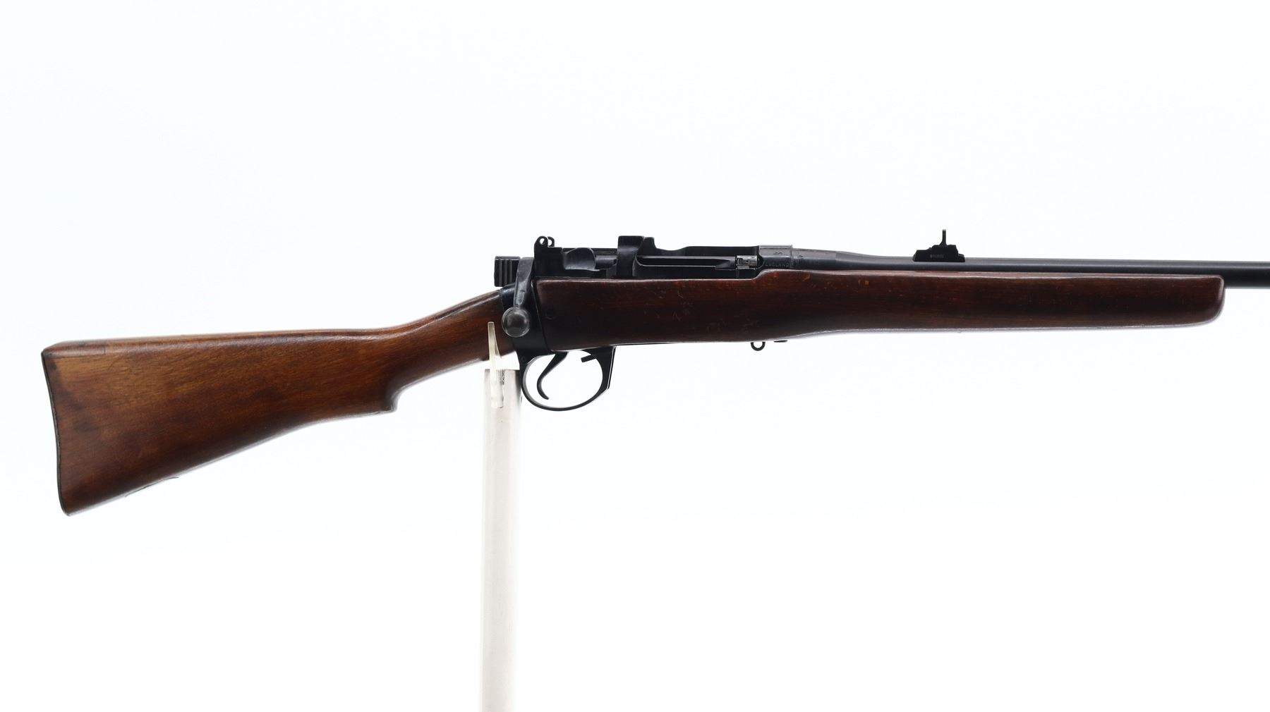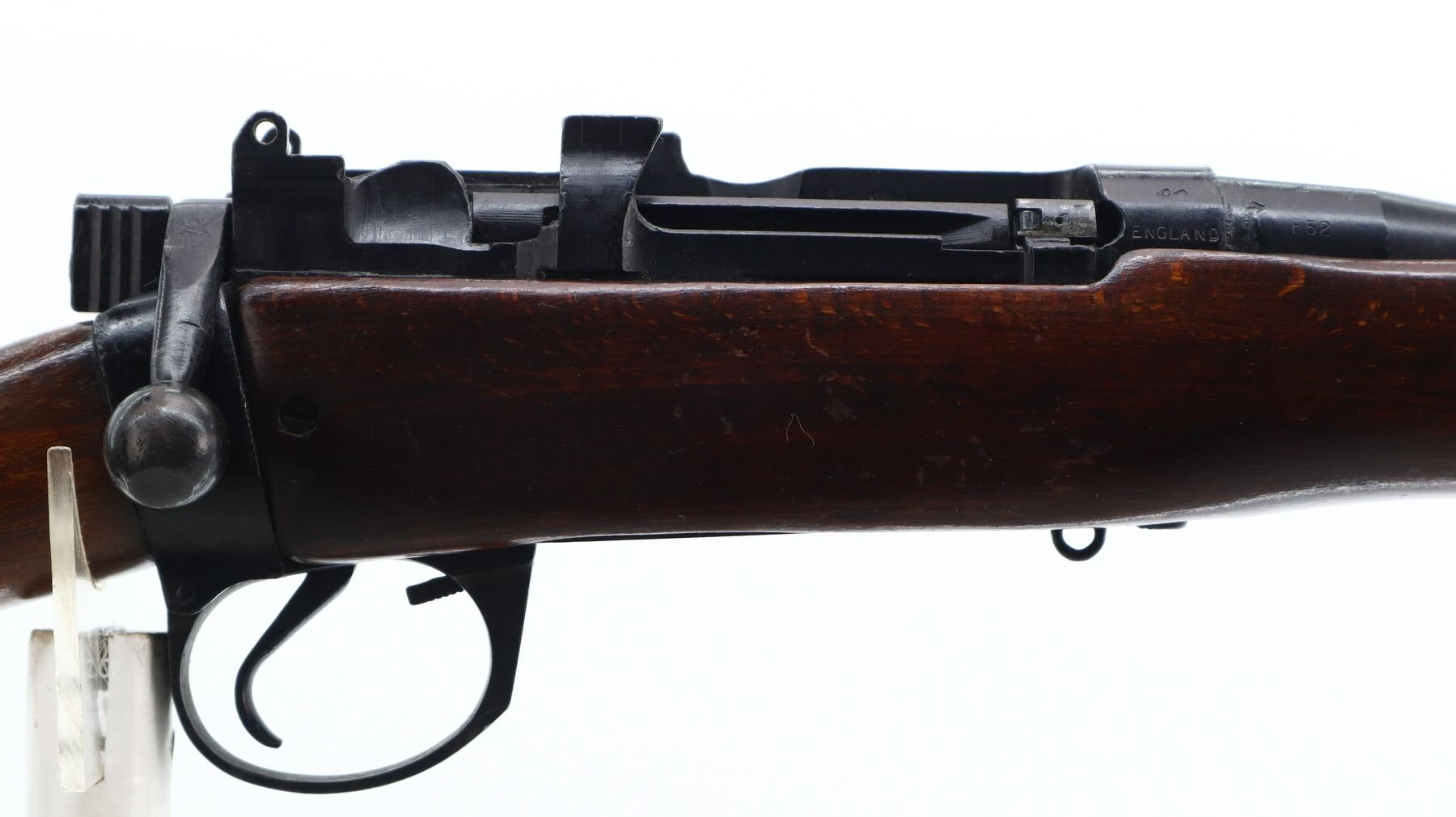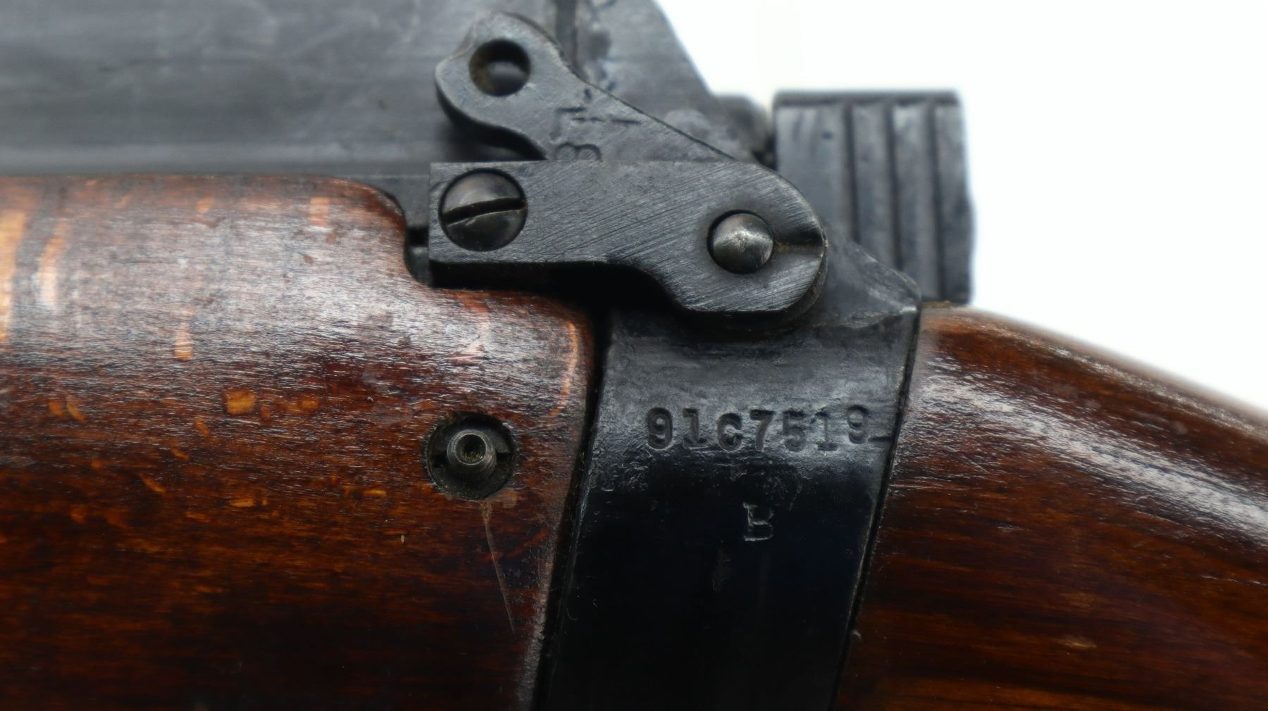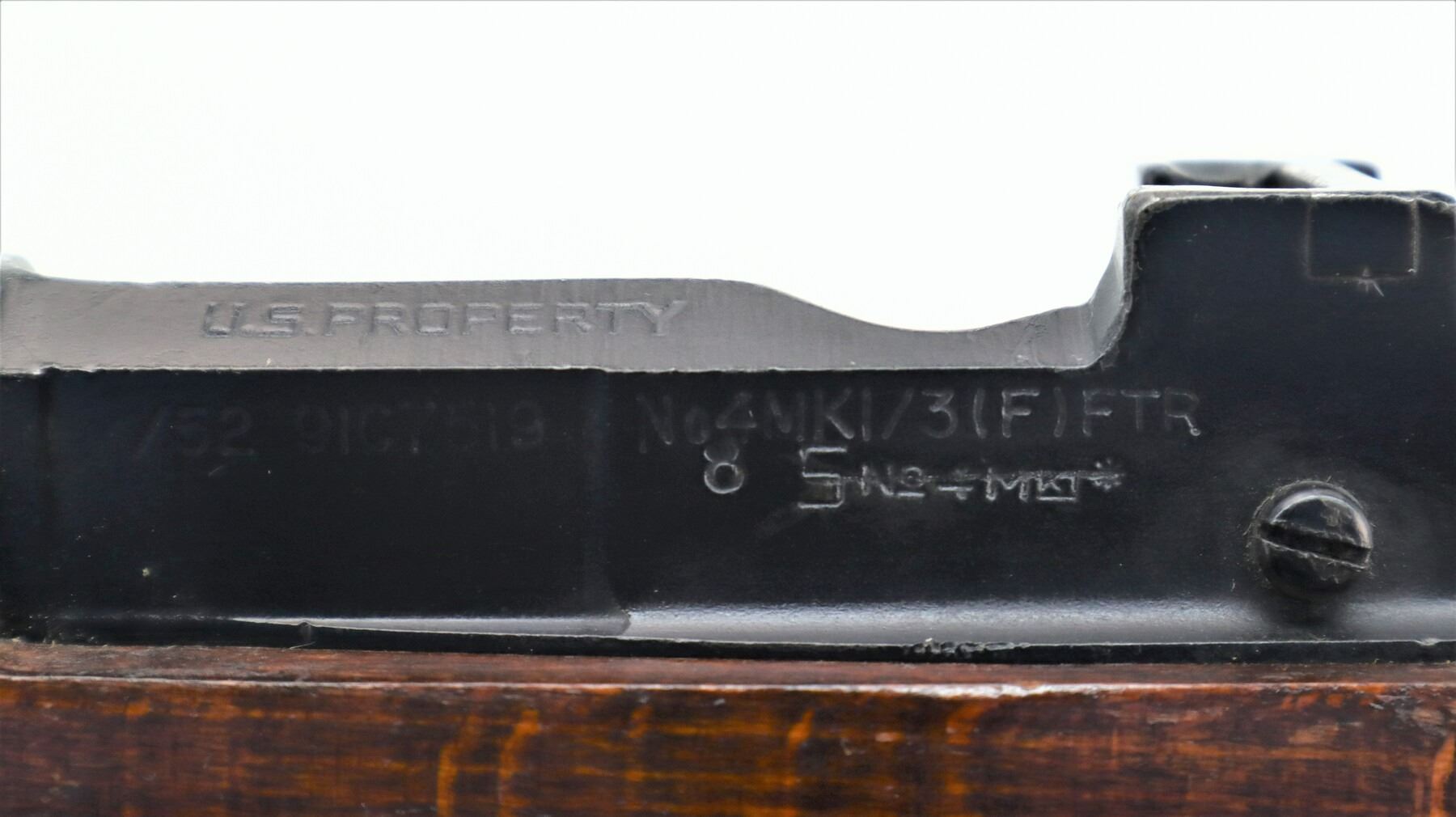 5/10, LEE ENFIELD, MODEL: NO4 MKI* SPORTER, CALIBER:303 BR, DOES NOT COME WITH MAGAZINE, BORE IS VERY GOOD. MANUFACTURED BY SAVAGE, BOLT MATCHES, REBUILT BY FAZAKERLEY 1952 TO A NO4 MKI/III. BLADE FRONT SIGHT WITH RAMP AND EARS, REAR PEEP SIGHT REMOVED, BARREL DRILLED AND TAPPED WITH ADJUSTABLE U NOTCHED WILLIAMS SIGHT INSTALLED, BLACK PAINTED METAL FINISH. TWO PIECE SPORTERIZED SMOOTH WOOD STOCKS, PISTOL GRIP, SMOOTH STEEL BUTT PLATE, STOCK REPAIRED AT HEEL. METAL FINISH SHOWS SOME SCRATCHES, HANDLING MARKS AND WEAR. STOCKS SHOW SOME MARKS, SCRATCHES AND WEAR. , ACTION: BOLT ACTION RIFLE, BARREL LENGTH: 25.25", SERIAL # 91C7519, CONDITION: 5/10, CLASS: CANADIAN NON RESTRICTED