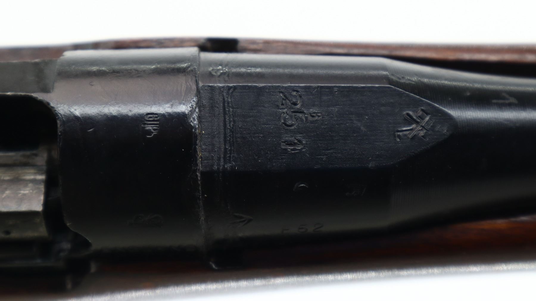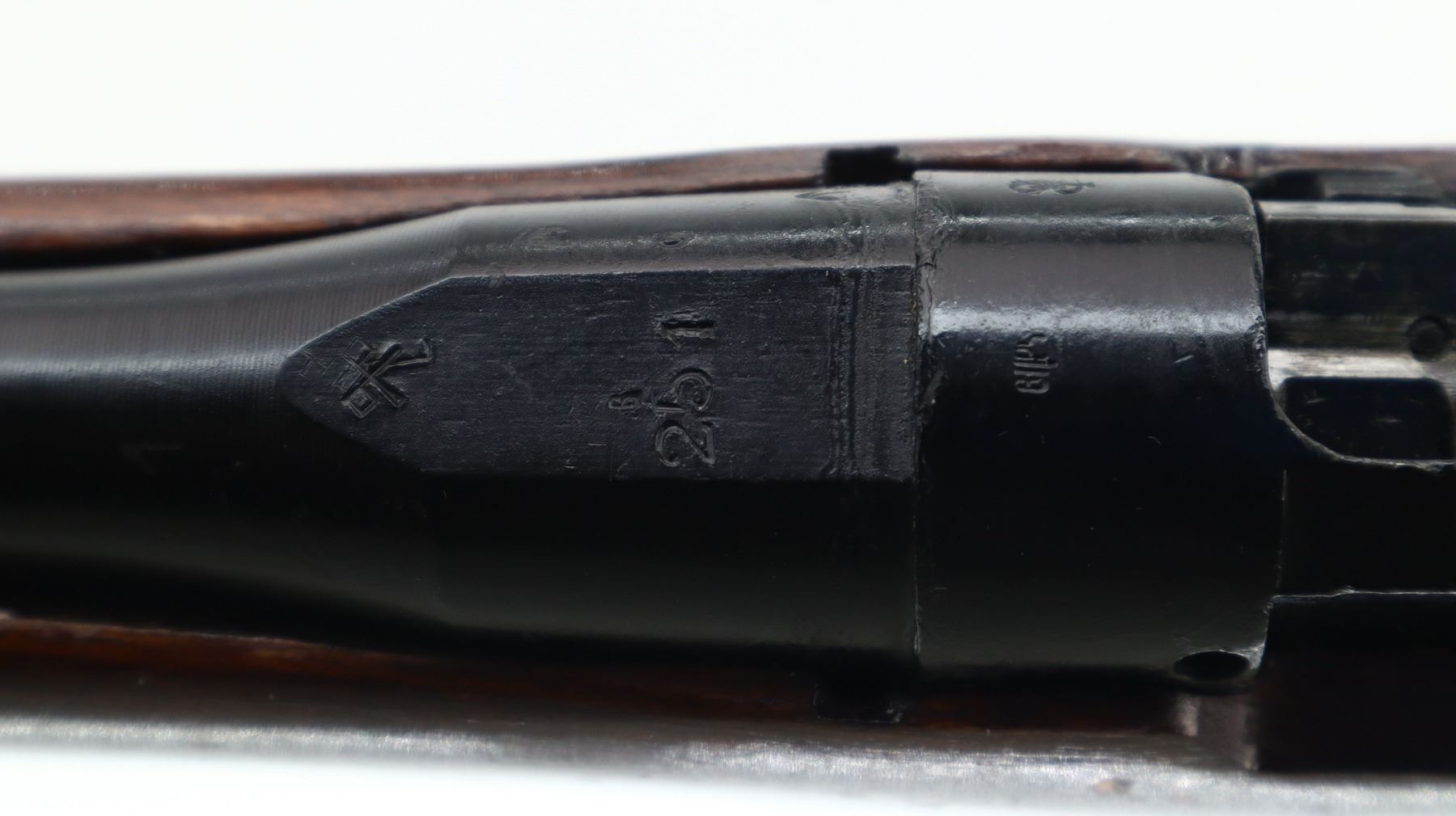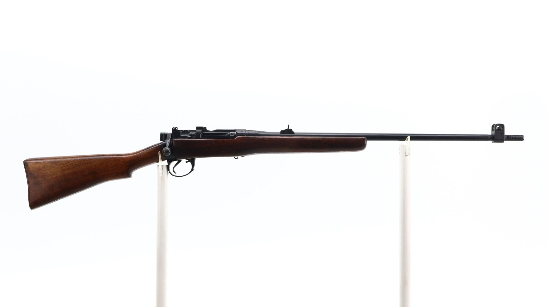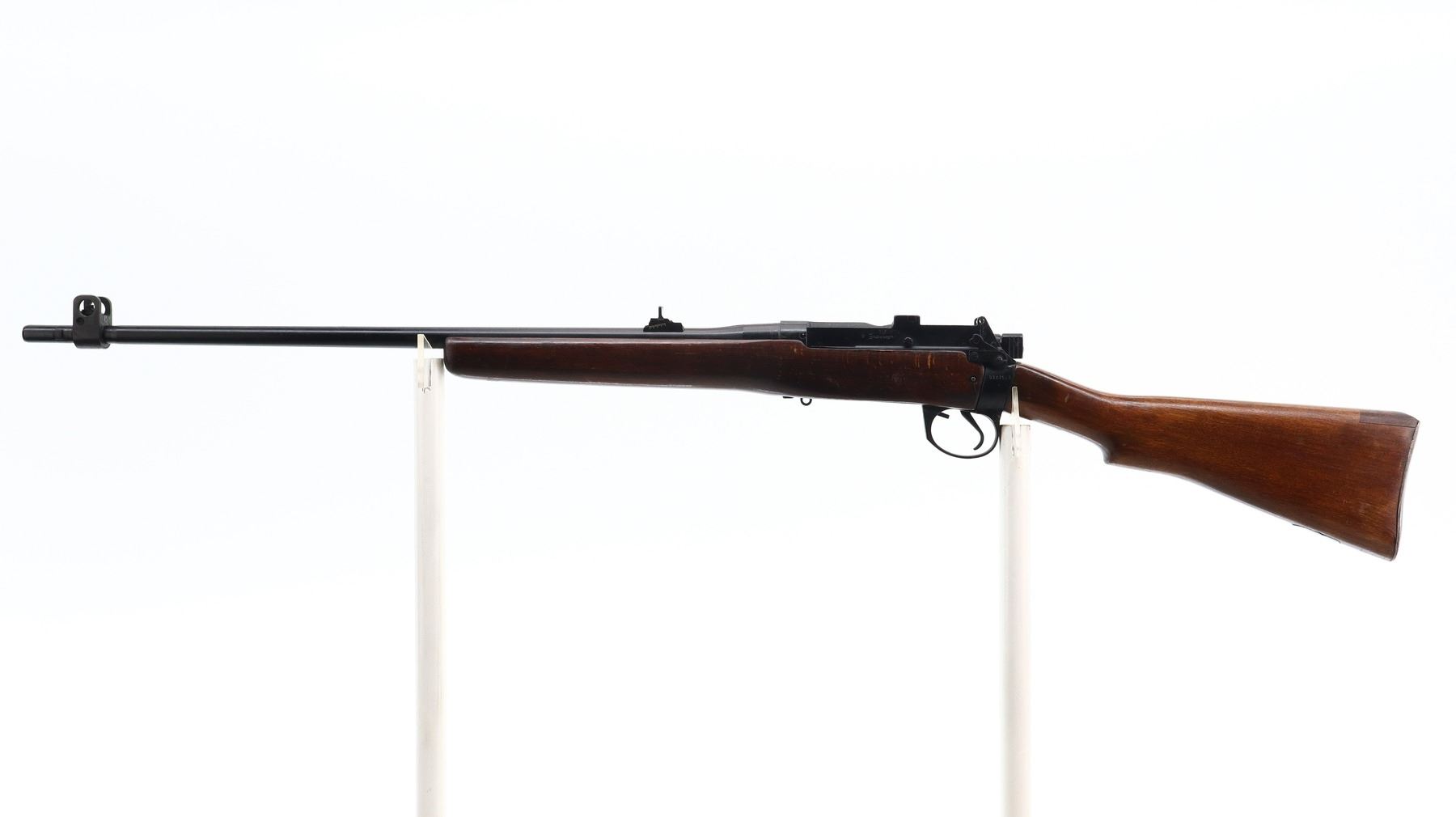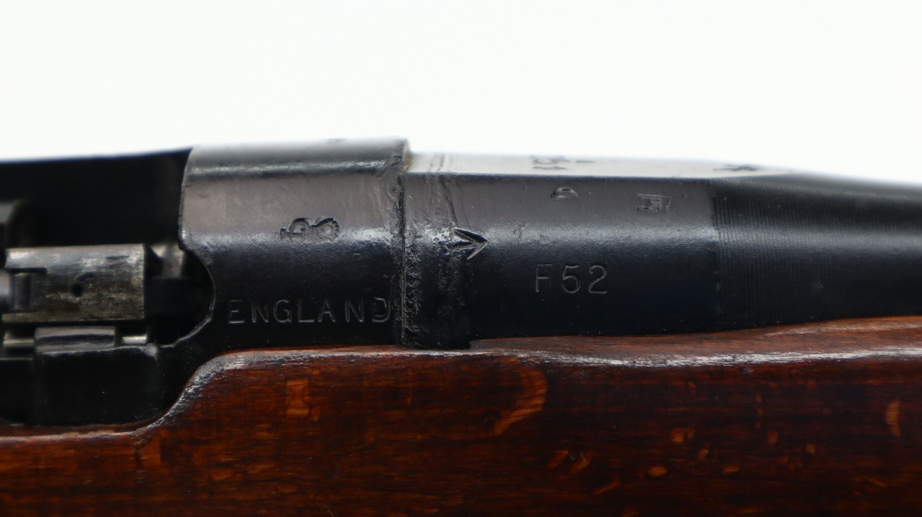 5/10, LEE ENFIELD, MODEL: NO4 MKI* SPORTER, CALIBER:303 BR, DOES NOT COME WITH MAGAZINE, BORE IS VERY GOOD. MANUFACTURED BY SAVAGE, BOLT MATCHES, REBUILT BY FAZAKERLEY 1952 TO A NO4 MKI/III. BLADE FRONT SIGHT WITH RAMP AND EARS, REAR PEEP SIGHT REMOVED, BARREL DRILLED AND TAPPED WITH ADJUSTABLE U NOTCHED WILLIAMS SIGHT INSTALLED, BLACK PAINTED METAL FINISH. TWO PIECE SPORTERIZED SMOOTH WOOD STOCKS, PISTOL GRIP, SMOOTH STEEL BUTT PLATE, STOCK REPAIRED AT HEEL. METAL FINISH SHOWS SOME SCRATCHES, HANDLING MARKS AND WEAR. STOCKS SHOW SOME MARKS, SCRATCHES AND WEAR. , ACTION: BOLT ACTION RIFLE, BARREL LENGTH: 25.25", SERIAL # 91C7519, CONDITION: 5/10, CLASS: CANADIAN NON RESTRICTED