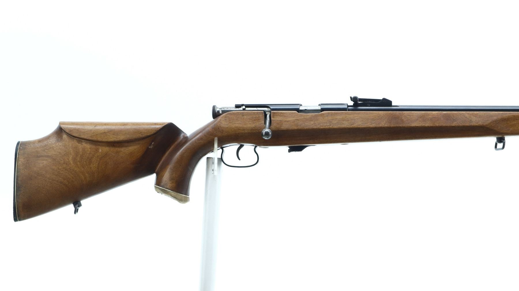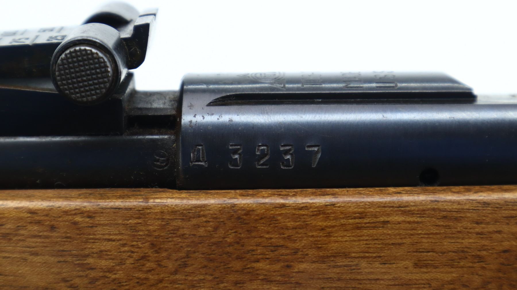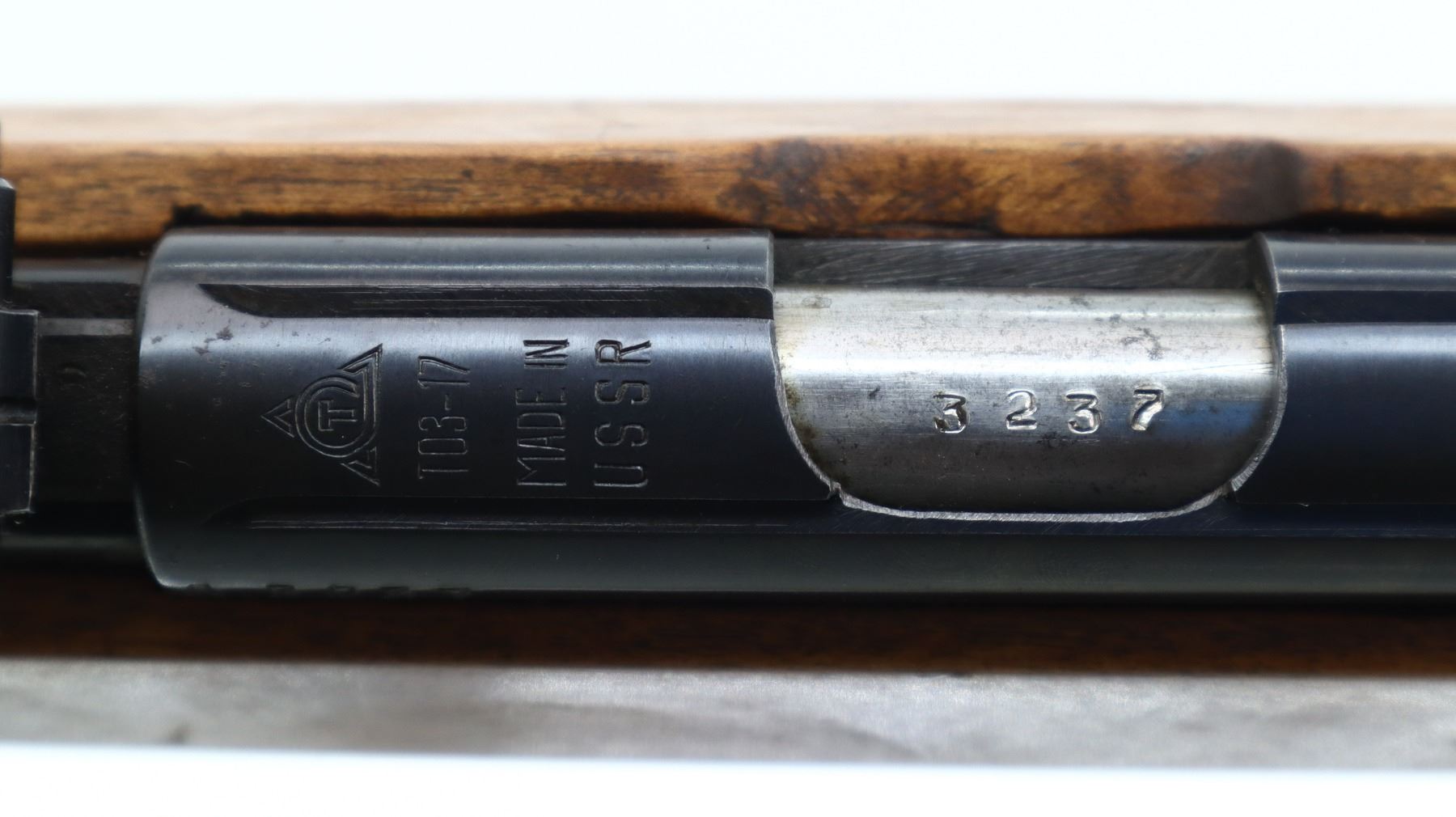 5/10, RUSSIAN, MODEL: T03-17, CALIBER:22 LR, DOES NOT COME WITH MAGAZINE, BORE IS EXCELLENT. BLADE FRONT SIGHT, ADJUSTABLE U NOTCHED REAR SIGHT, RECEIVER GROOVED FOR SCOPE MOUNT, SILVER BOLT. ONE PIECE SMOOTH FULL LENGTH CUSTOM WOOD STOCK, PISTOL GRIP, CHEEK REST, TEXTURED BLACK POLYMER BUTT PLATE, SLING SWIVELS, HORN PISTOL GRIP AND FOREND CAPS. METAL FINISH SHOWS SOME SCRATCHES, HANDLING MARKS AND WEAR. STOCKS SHOW SOME MARKS, SCRATCHES AND WEAR. , ACTION: BOLT ACTION RIFLE, BARREL LENGTH: 21", SERIAL # A3237, CONDITION: 5/10, CLASS: CANADIAN NON RESTRICTED