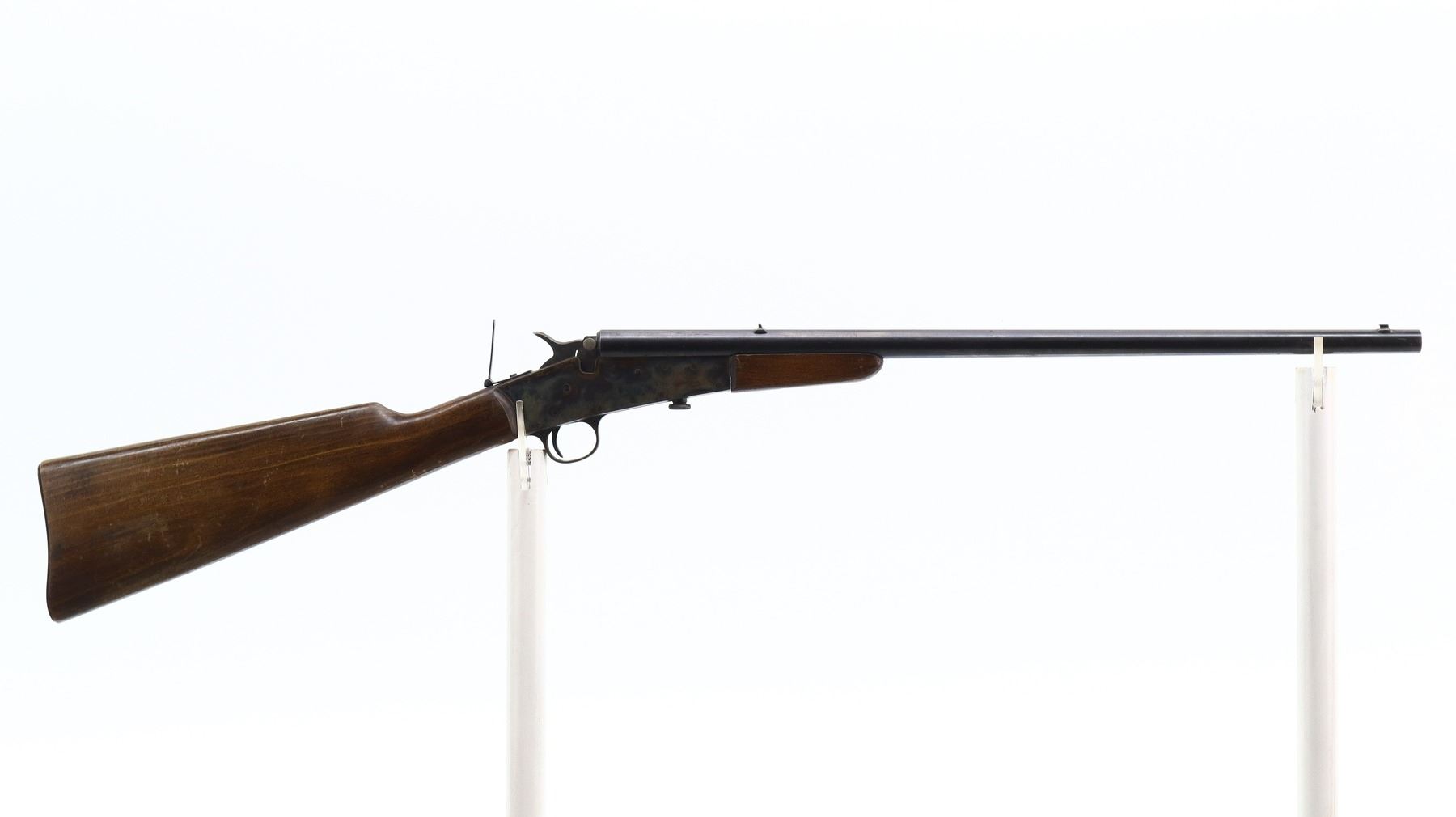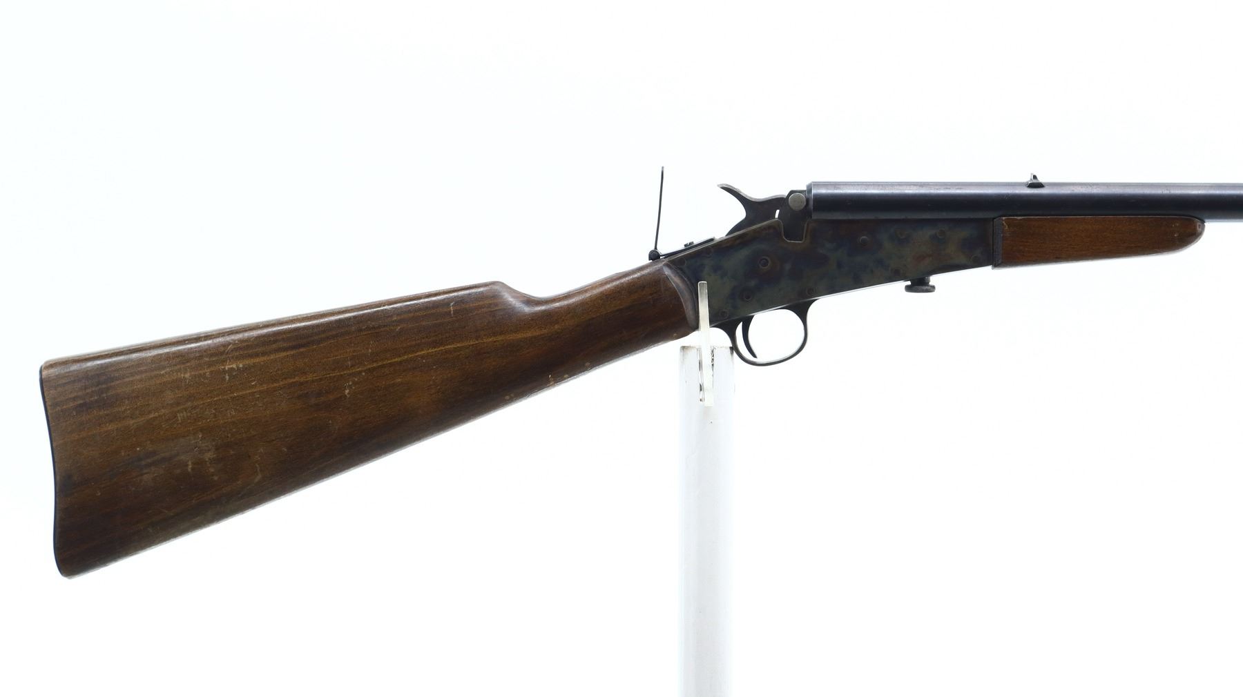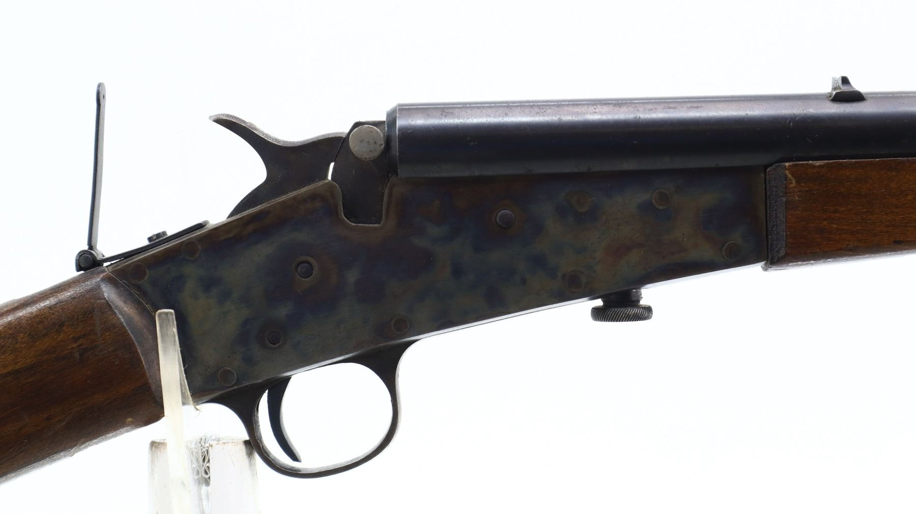 4/10, REMINGTON, MODEL: 6, CALIBER:22 LONG, BORE IS GOOD, SLIGHT PITTING. BLADE FRONT SIGHT, U NOTCHED REAR SIGHT, CHECKERED SPUR HAMMER, BOLT LEVER REPLACED WITH CUSTOM PIN, EXTRACTOR, COLOUR CASE HARDENED RECEIVER WITH FOLDING TANG PEEP SIGHT. TWO PIECE SMOOTH WOOD STOCKS, STRAIGHT GRIP CRACKED BEHIND RECEIVER, SMOOTH STEEL BUTT PLATE. METAL FINISH SHOWS SOME SCRATCHES, HANDLING MARKS AND WEAR. STOCKS SHOW SOME MARKS, SCRATCHES AND WEAR. , ACTION: SINGLE SHOT DROP BLOCK RIFLE, BARREL LENGTH: 20", SERIAL # S72053, CONDITION: 4/10, CLASS: CANADIAN NON RESTRICTED