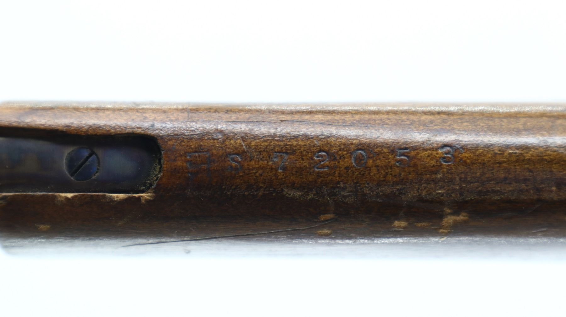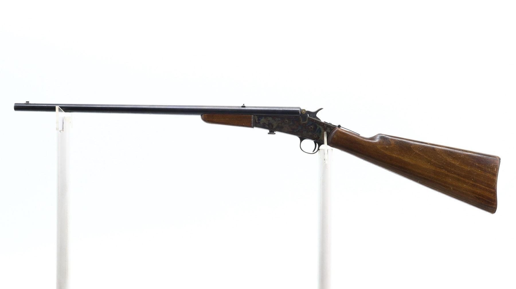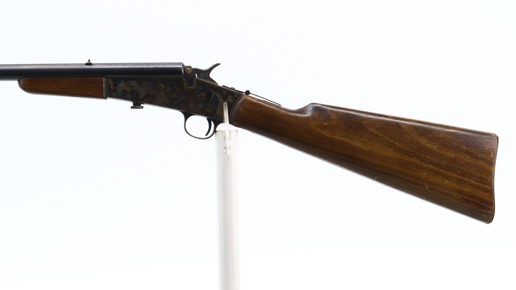 4/10, REMINGTON, MODEL: 6, CALIBER:22 LONG, BORE IS GOOD, SLIGHT PITTING. BLADE FRONT SIGHT, U NOTCHED REAR SIGHT, CHECKERED SPUR HAMMER, BOLT LEVER REPLACED WITH CUSTOM PIN, EXTRACTOR, COLOUR CASE HARDENED RECEIVER WITH FOLDING TANG PEEP SIGHT. TWO PIECE SMOOTH WOOD STOCKS, STRAIGHT GRIP CRACKED BEHIND RECEIVER, SMOOTH STEEL BUTT PLATE. METAL FINISH SHOWS SOME SCRATCHES, HANDLING MARKS AND WEAR. STOCKS SHOW SOME MARKS, SCRATCHES AND WEAR. , ACTION: SINGLE SHOT DROP BLOCK RIFLE, BARREL LENGTH: 20", SERIAL # S72053, CONDITION: 4/10, CLASS: CANADIAN NON RESTRICTED