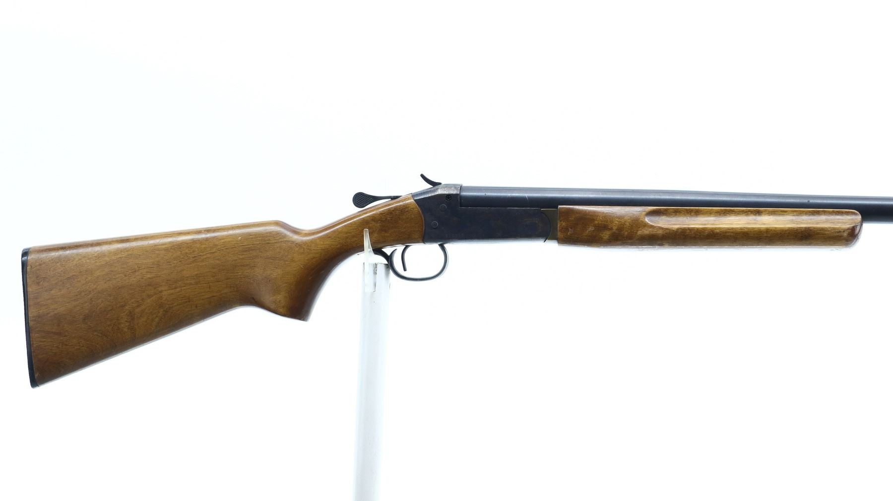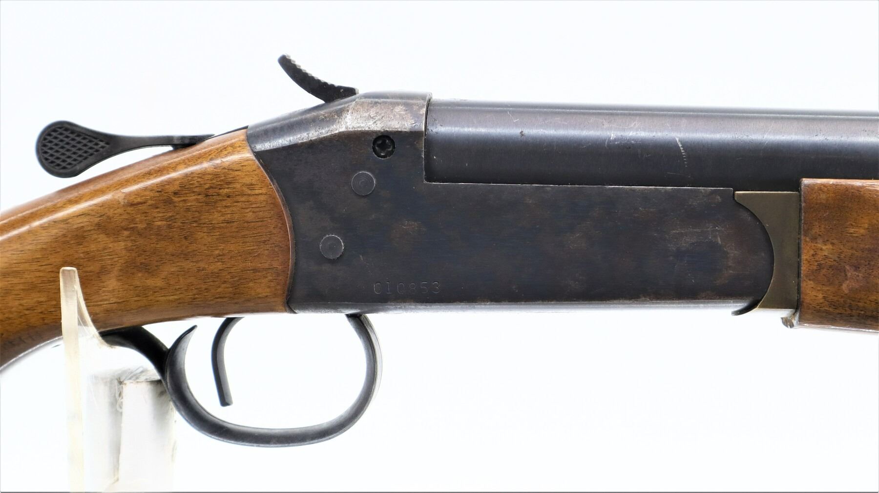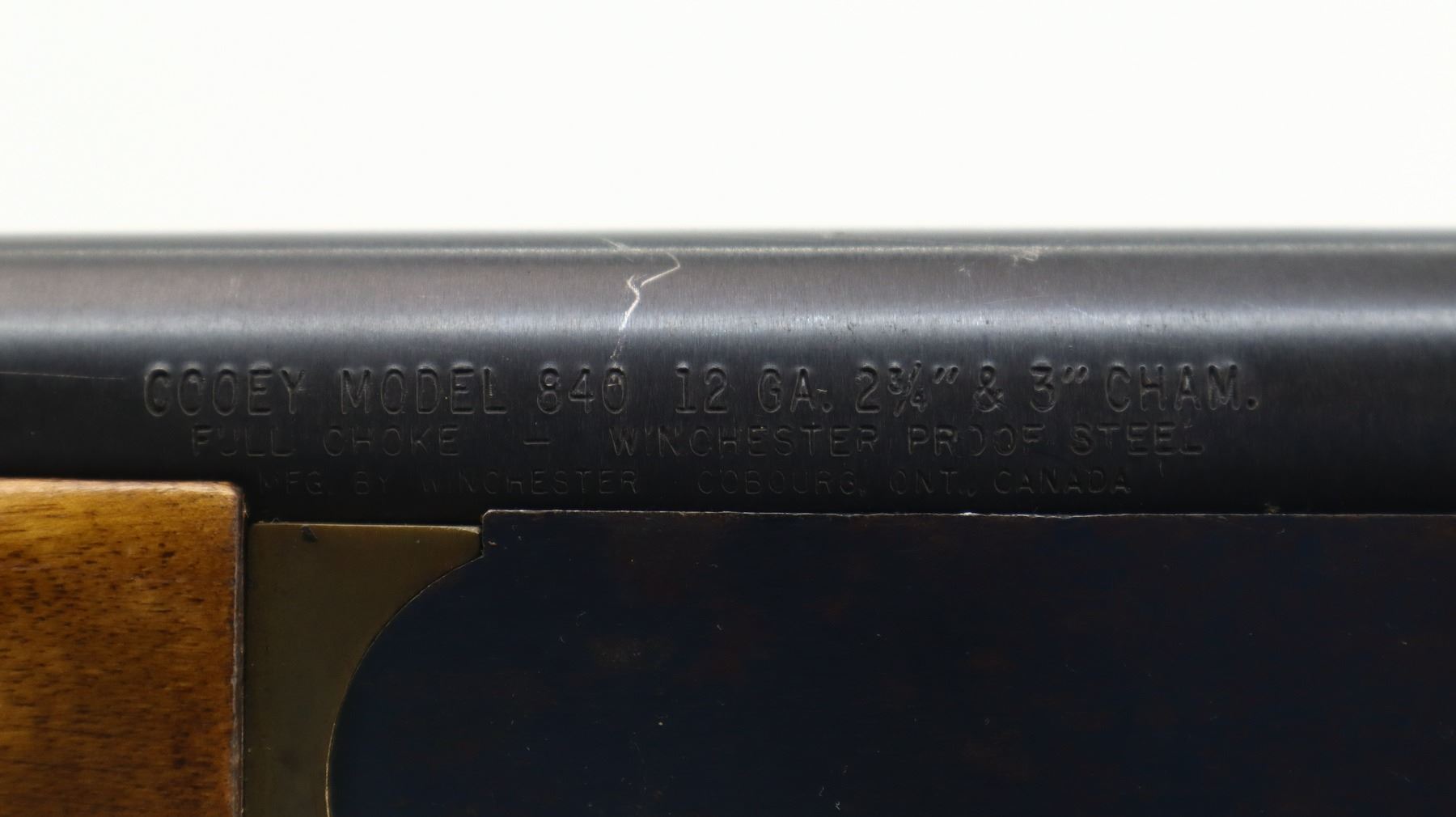 4/10, COOEY/WINCHESTER, MODEL: 840, CALIBER:12 G X 3", BORE IS GOOD. FIXED FULL CHOKE. BRASS BEAD, ROUND BARREL. BLUED FINISH, CHECKERED SPUR HAMMER, EJECTOR. TWO PIECE SMOOTH WOOD STOCKS, FINGER GROOVED FOREND, PISTOL GRIP, CRACKED BEHIND RECEIVER, CHECKERED BLACK POLYMER BUTT PLATE. METAL FINISH SHOWS LIGHT RUST SPECKLES, SCRATCHES, HANDLING MARKS AND WEAR. STOCKS SHOW MARKS, SCRATCHES AND WEAR. , ACTION: HINGED SINGLE SHOT SHOTGUN, BARREL LENGTH: 30", SERIAL # 010853, CONDITION: 4/10, CLASS: CANADIAN NON RESTRICTED