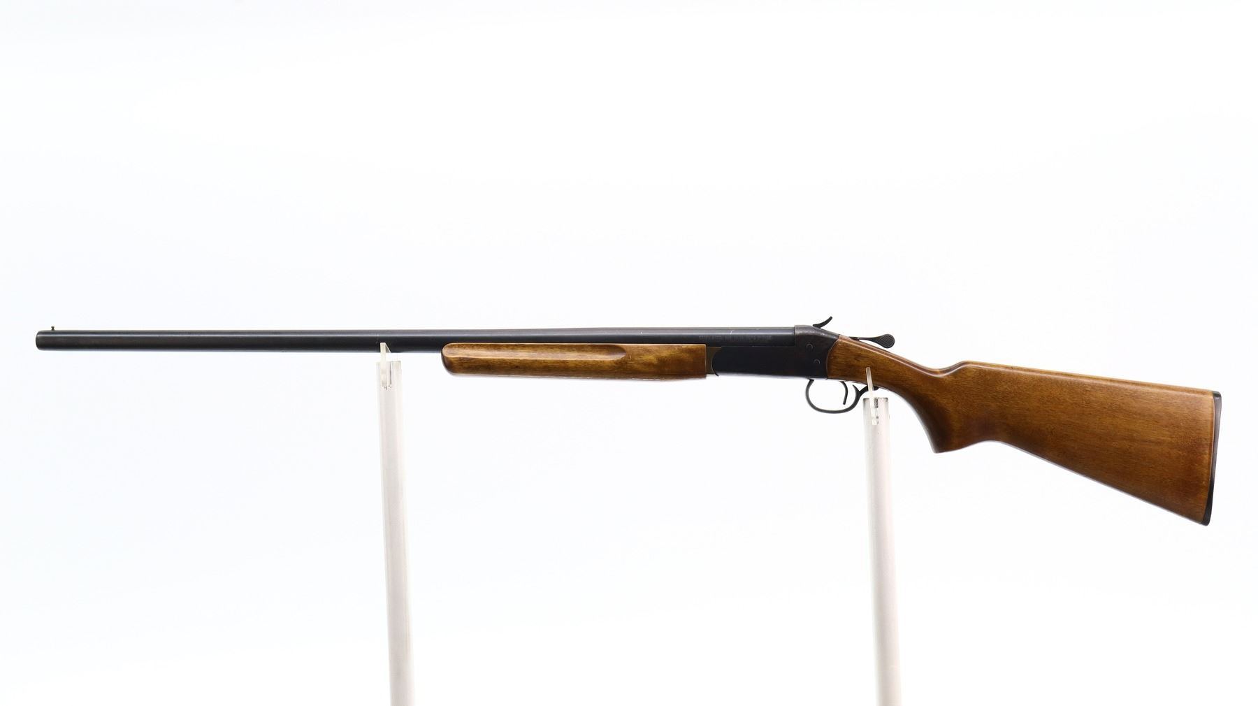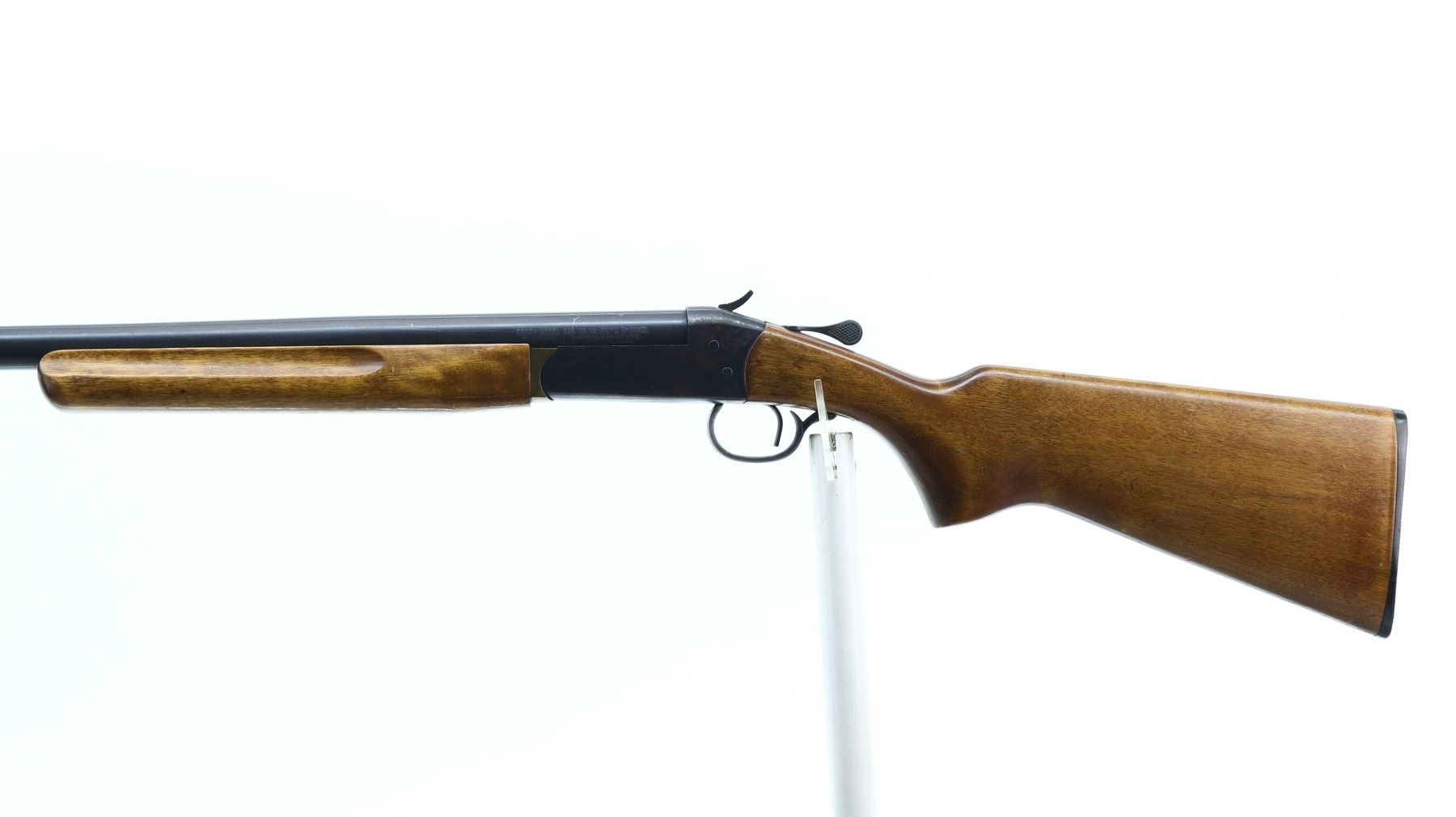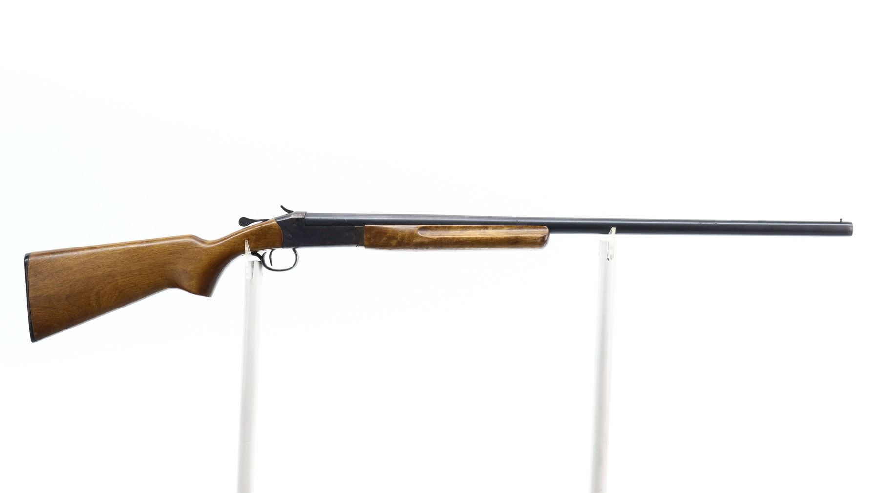 4/10, COOEY/WINCHESTER, MODEL: 840, CALIBER:12 G X 3", BORE IS GOOD. FIXED FULL CHOKE. BRASS BEAD, ROUND BARREL. BLUED FINISH, CHECKERED SPUR HAMMER, EJECTOR. TWO PIECE SMOOTH WOOD STOCKS, FINGER GROOVED FOREND, PISTOL GRIP, CRACKED BEHIND RECEIVER, CHECKERED BLACK POLYMER BUTT PLATE. METAL FINISH SHOWS LIGHT RUST SPECKLES, SCRATCHES, HANDLING MARKS AND WEAR. STOCKS SHOW MARKS, SCRATCHES AND WEAR. , ACTION: HINGED SINGLE SHOT SHOTGUN, BARREL LENGTH: 30", SERIAL # 010853, CONDITION: 4/10, CLASS: CANADIAN NON RESTRICTED