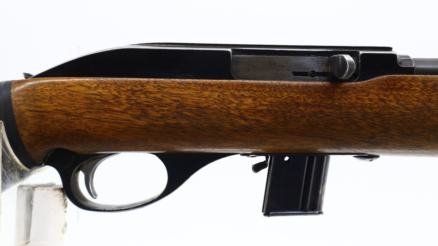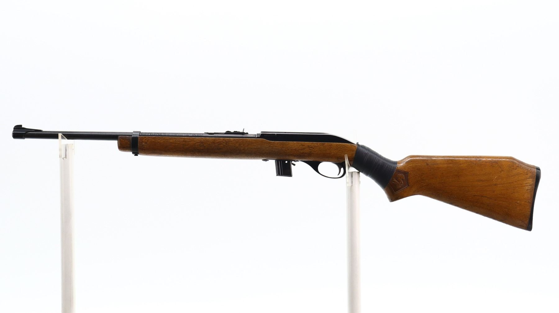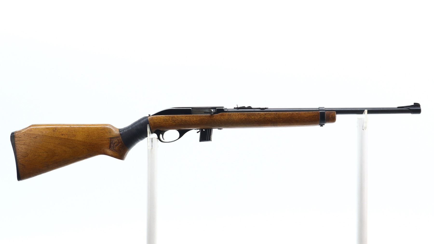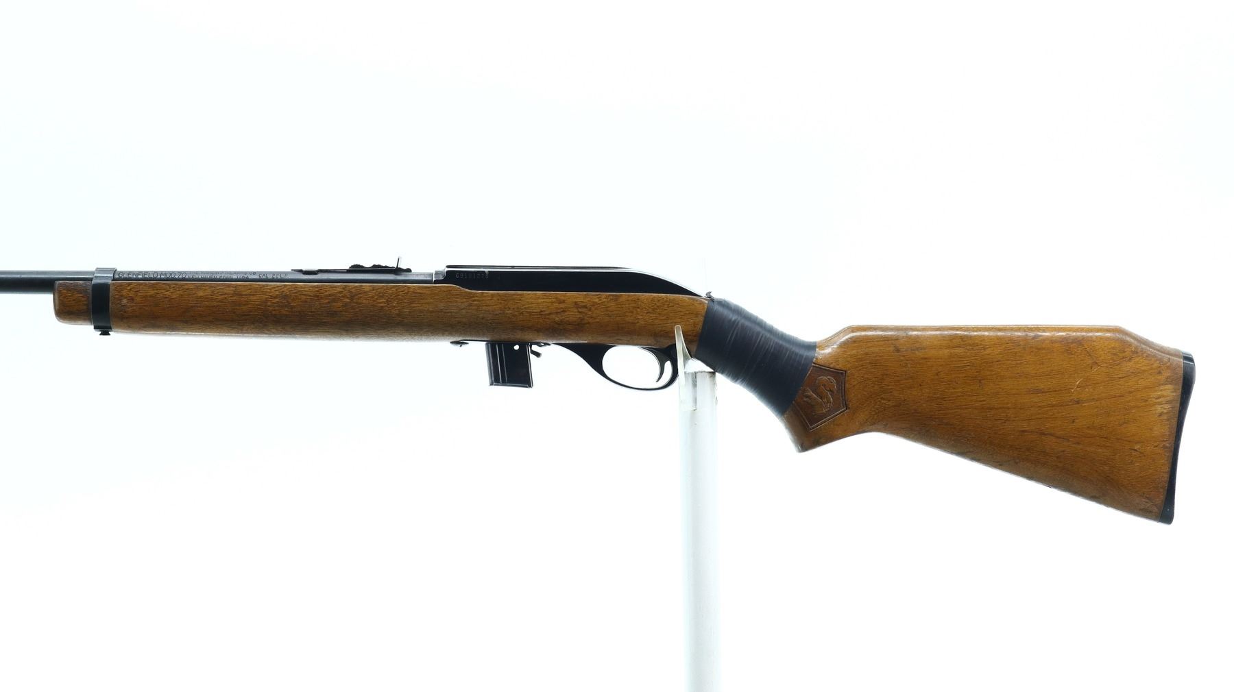 3/10, GLENFIELD, MODEL: 70, CALIBER:22 LR, COMES WITH MAGAZINE, BORE IS GOOD. BLADE FRONT SIGHT WITH RAMP, ADJUSTABLE U NOTCHED REAR SIGHT, BLUED BARREL, BLACK ALLOY RECEIVER GROOVED FOR SCOPE MOUNT. ONE PIECE WOOD STOCK, PISTOL GRIP CRACKED AND REPAIRED WITH BLACK TAPE, CHECKERED BLACK POLYMER BUTT PLATE, SWIVELS REMOVED. METAL FINISH SHOWS LIGHT RUST SPECKLES, SCRATCHES, HANDLING MARKS AND WEAR. STOCK SHOWS MARKS, SCRATCHES AND WEAR. , ACTION: SEMI AUTOMATIC RIFLE, BARREL LENGTH: 18", SERIAL # 69181275, CONDITION: 3/10, CLASS: CANADIAN NON RESTRICTED