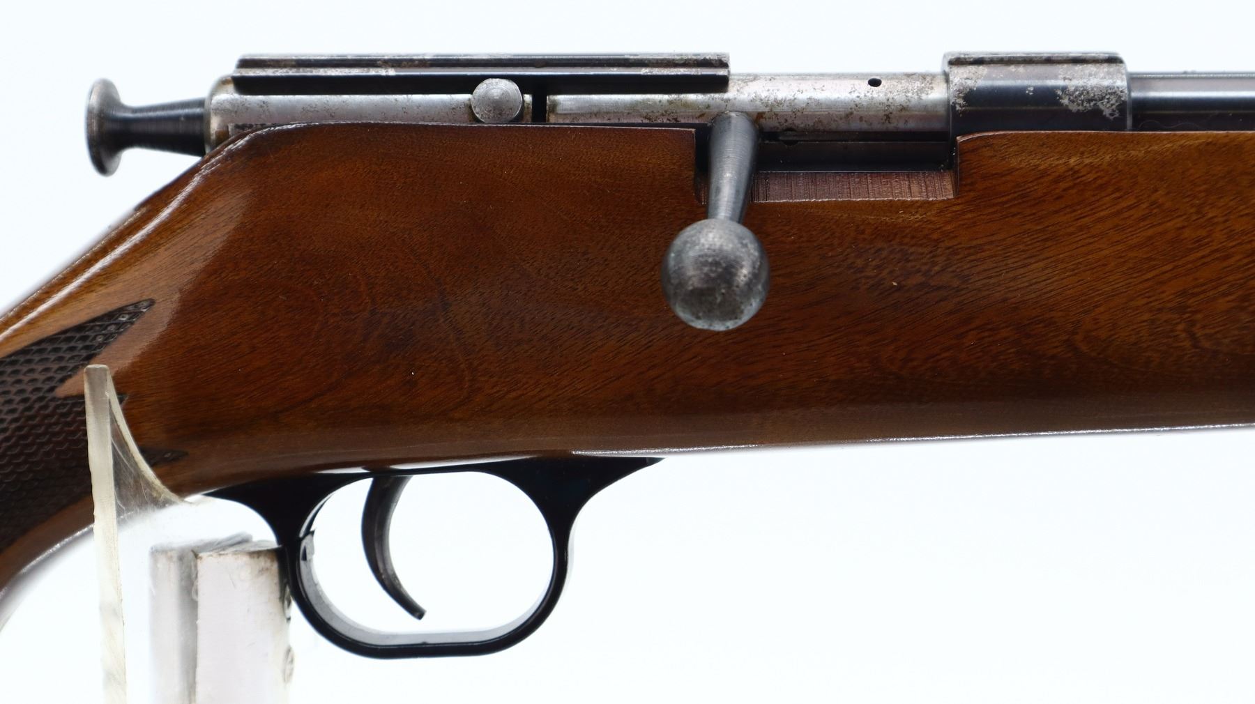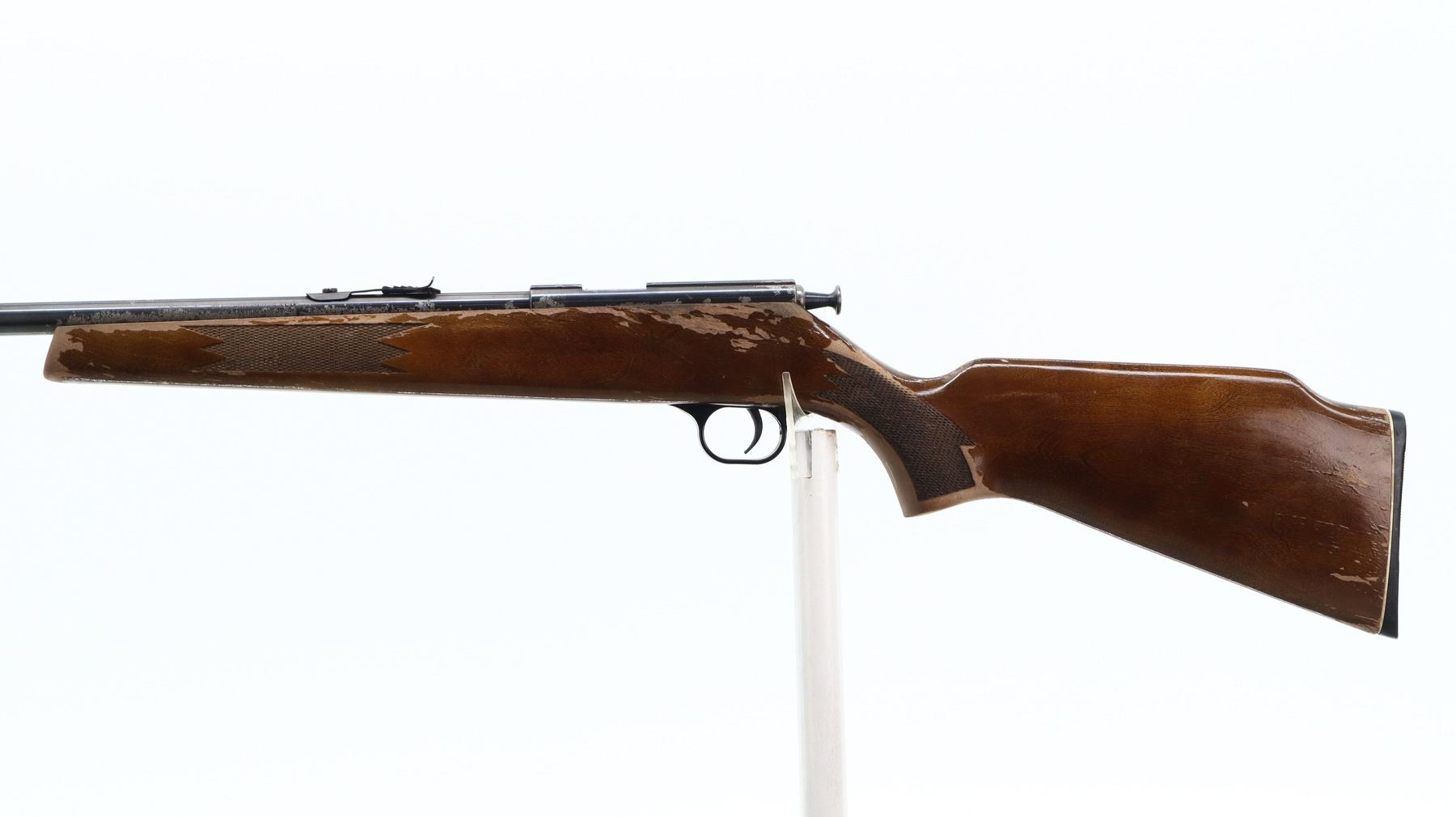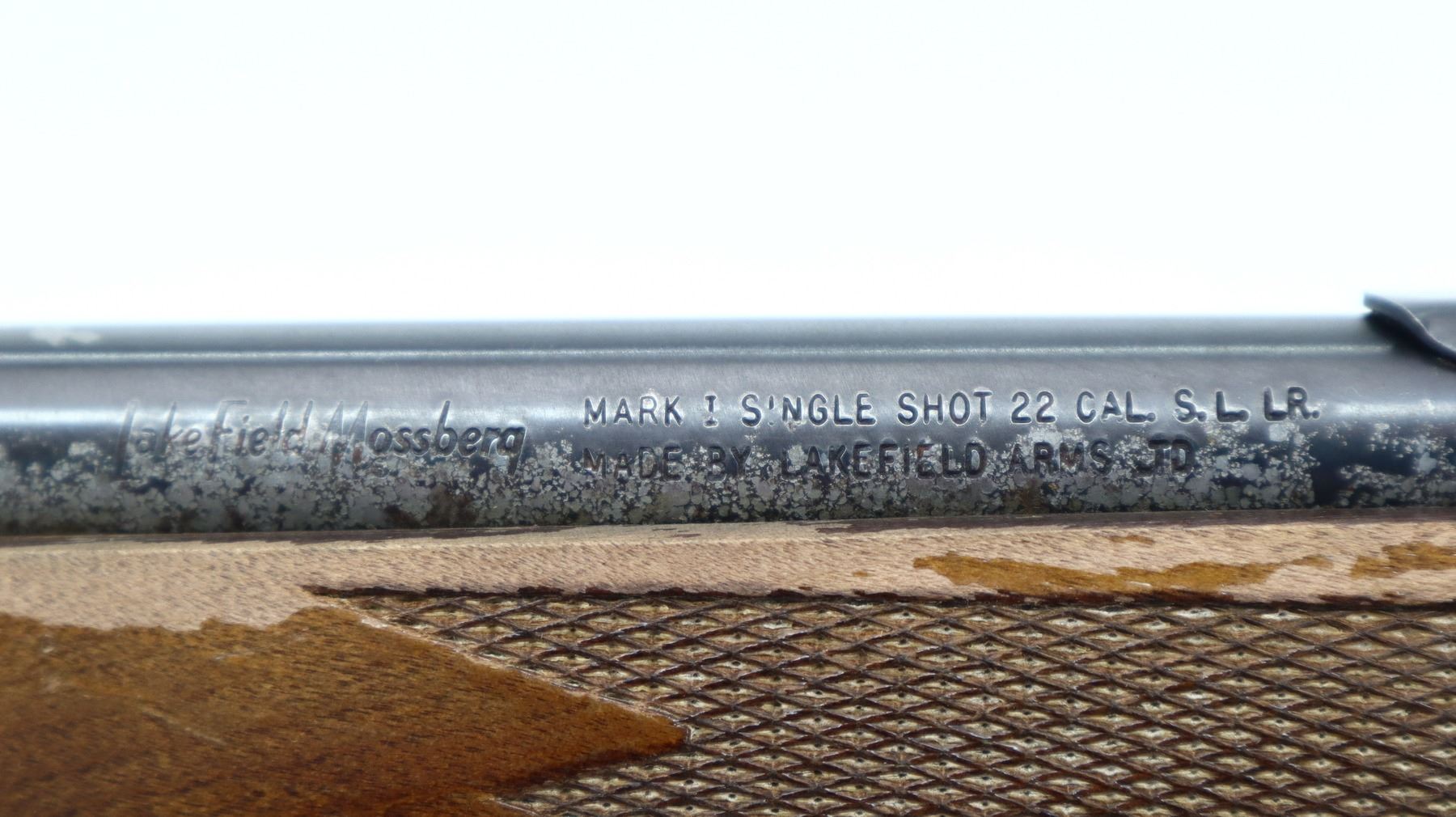 2+/10, MOSSBERG, MODEL: MKI SINGLE SHOT, CALIBER:22 LR, BORE IS GOOD. BLADE FRONT SIGHT, ADJUSTABLE U NOTCHED REAR SIGHT, RECEIVER GROOVED FOR SCOPE MOUNT. ONE PIECE WOOD STOCK, CHECKERED FOREARM AND PISTOL GRIP, GROOVED BLACK POLYMER BUTT PLATE. METAL FINISH SHOWS PITTED SPOTS, RUST SPECKLES, HANDLING MARKS AND WEAR. STOCK SHOWS MARKS, SCRATCHES AND WEAR. , ACTION: BOLT ACTION RIFLE, BARREL LENGTH: 22.75", SERIAL # 14372, CONDITION: 2+/10, CLASS: CANADIAN NON RESTRICTED