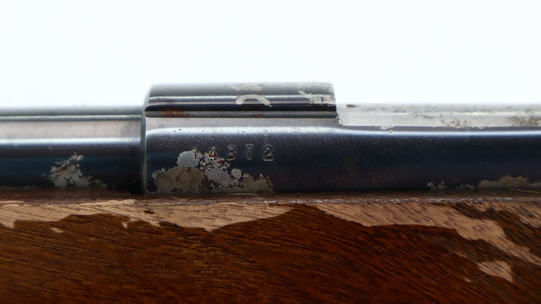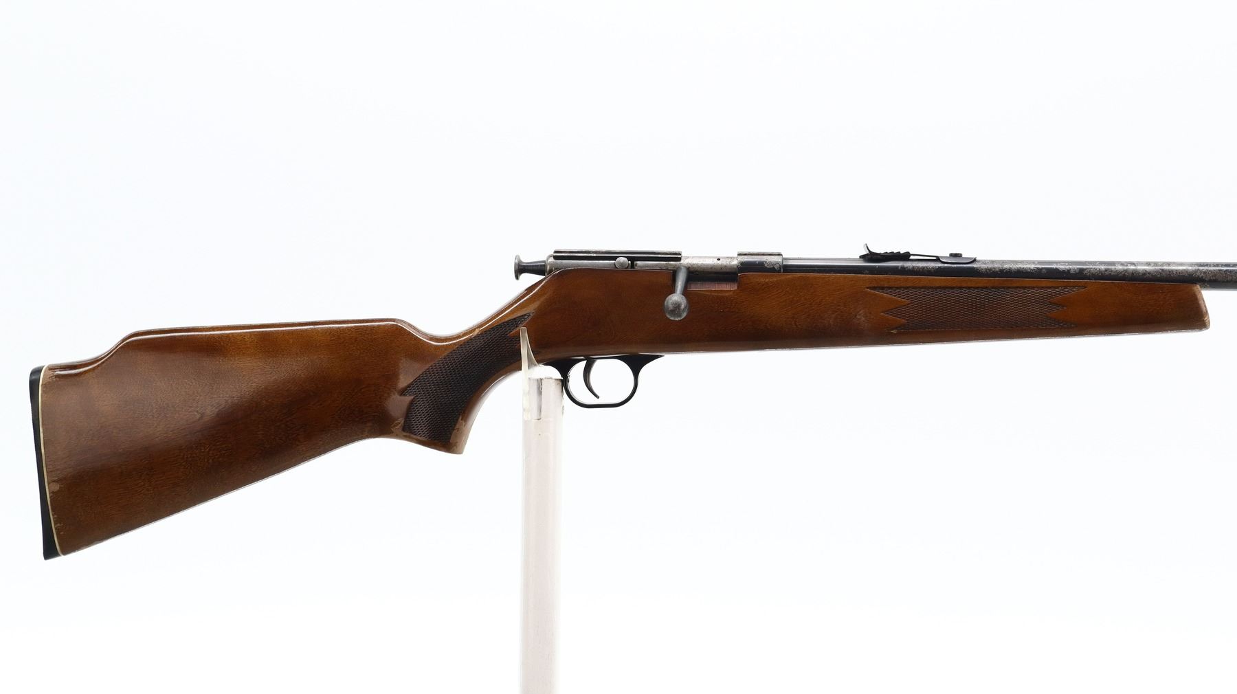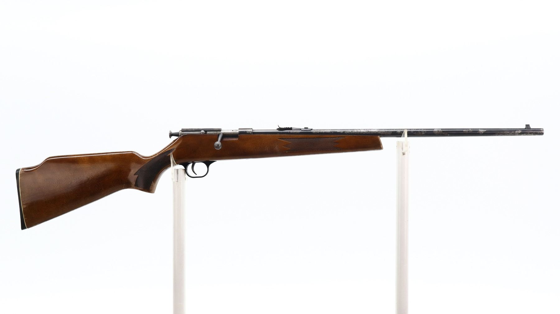 2+/10, MOSSBERG, MODEL: MKI SINGLE SHOT, CALIBER:22 LR, BORE IS GOOD. BLADE FRONT SIGHT, ADJUSTABLE U NOTCHED REAR SIGHT, RECEIVER GROOVED FOR SCOPE MOUNT. ONE PIECE WOOD STOCK, CHECKERED FOREARM AND PISTOL GRIP, GROOVED BLACK POLYMER BUTT PLATE. METAL FINISH SHOWS PITTED SPOTS, RUST SPECKLES, HANDLING MARKS AND WEAR. STOCK SHOWS MARKS, SCRATCHES AND WEAR. , ACTION: BOLT ACTION RIFLE, BARREL LENGTH: 22.75", SERIAL # 14372, CONDITION: 2+/10, CLASS: CANADIAN NON RESTRICTED