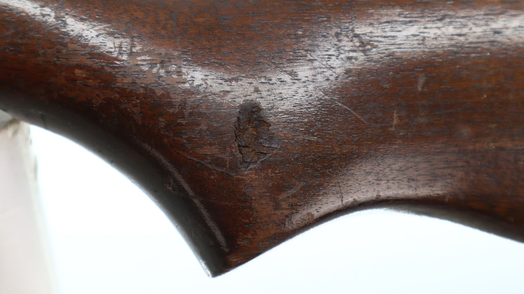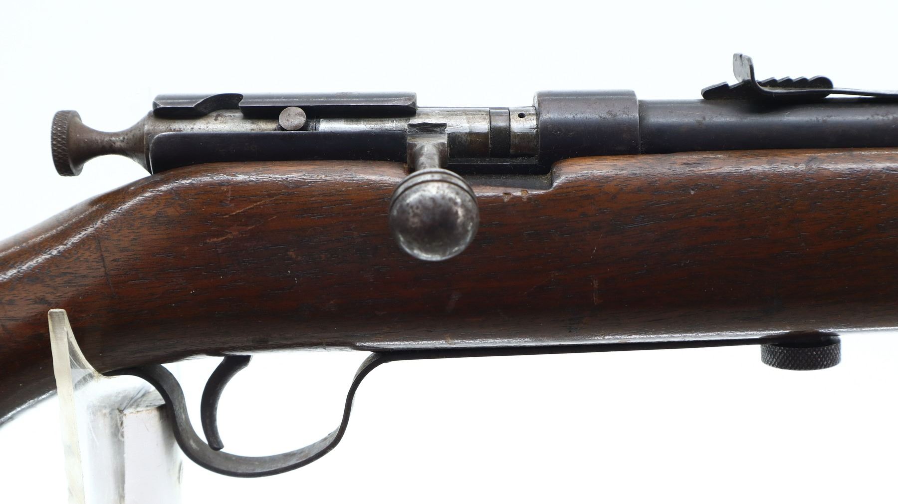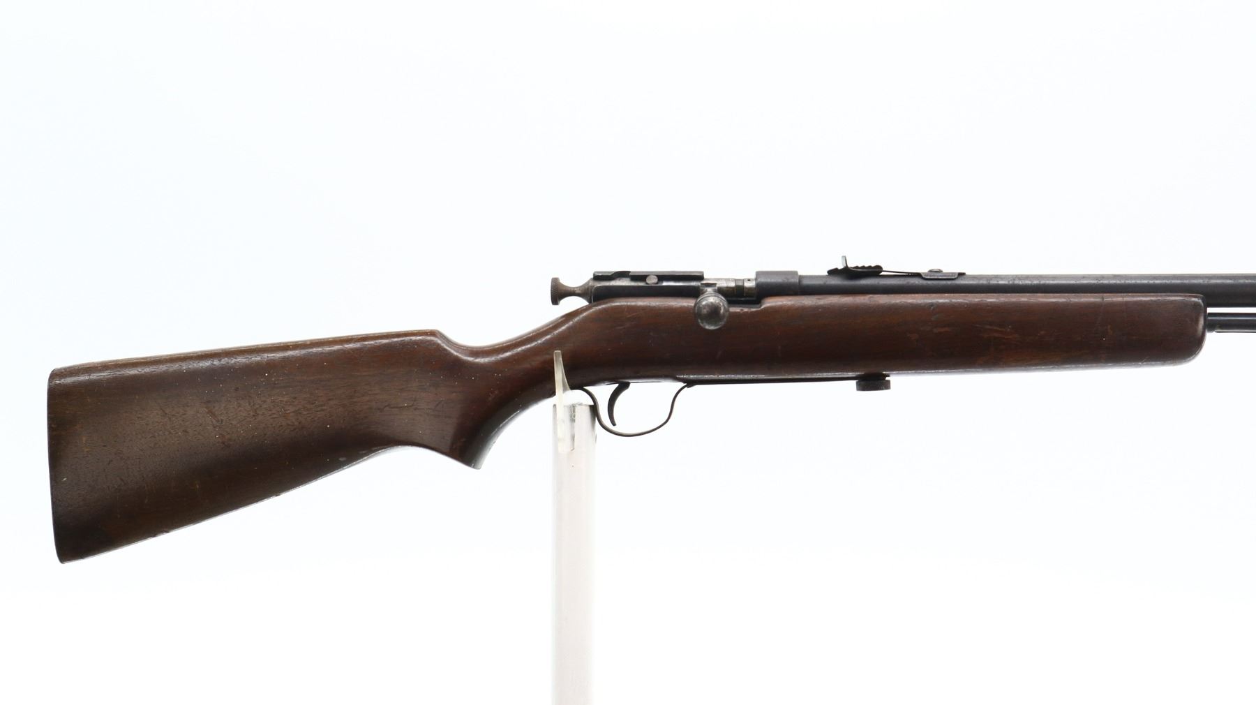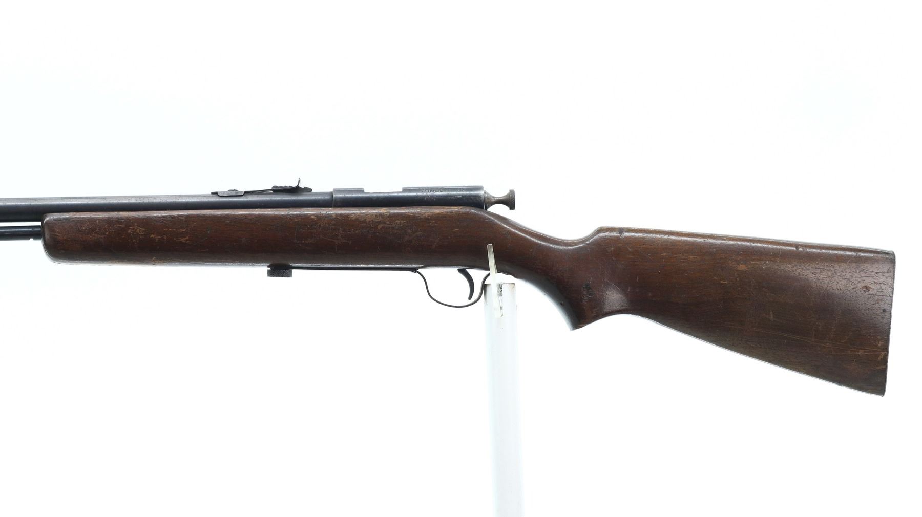 4/10, COOEY, MODEL: 60, CALIBER:22 LR, BORE IS GOOD. BLADE FRONT SIGHT, ADJUSTABLE U NOTCHED REAR SIGHT. ONE PIECE SMOOTH WOOD STOCK, PISTOL GRIP, SMOOTH STEEL BUTT PLATE, 3/4 LENGTH MAG TUBE. METAL FINISH SHOWS LIGHT PITTING, RUST SPECKLES, HANDLING MARKS AND WEAR. STOCK SHOWS MARKS, SCRATCHES AND WEAR. , ACTION: BOLT ACTION RIFLE, BARREL LENGTH: 24", SERIAL # NA, CONDITION: 4/10, CLASS: CANADIAN NON RESTRICTED
