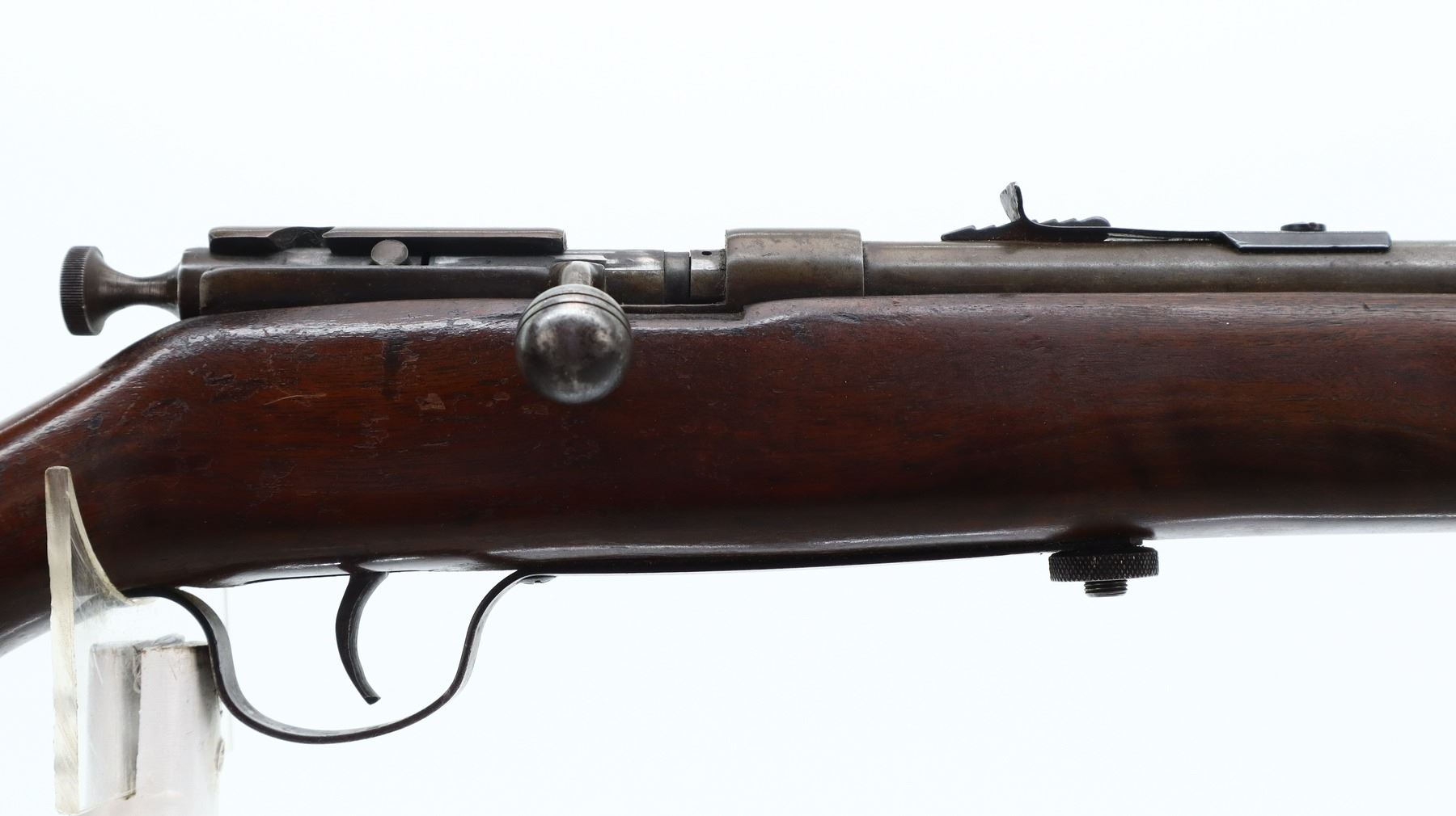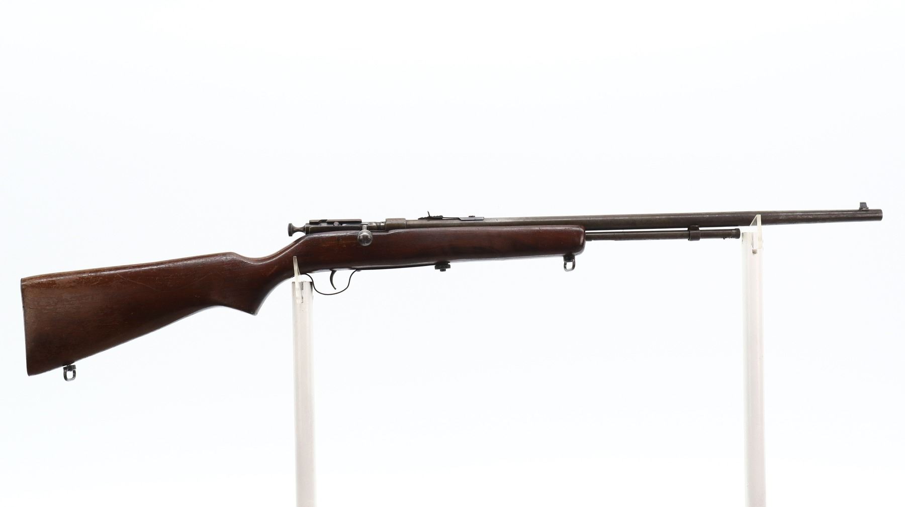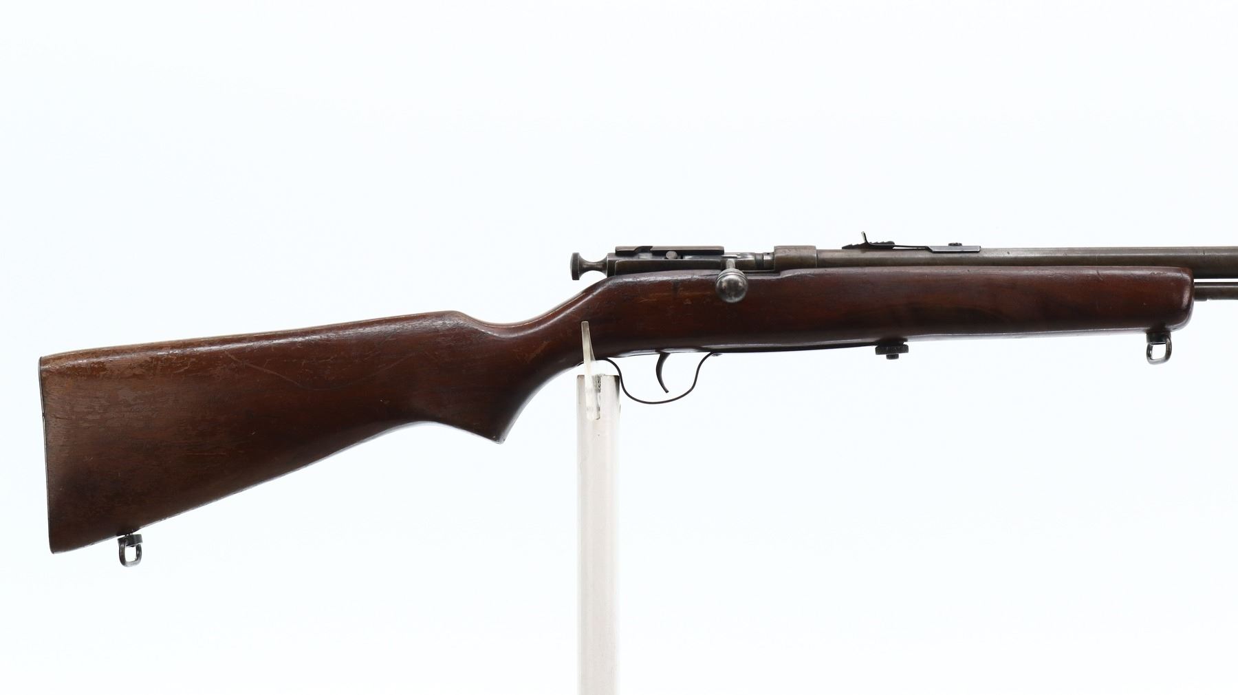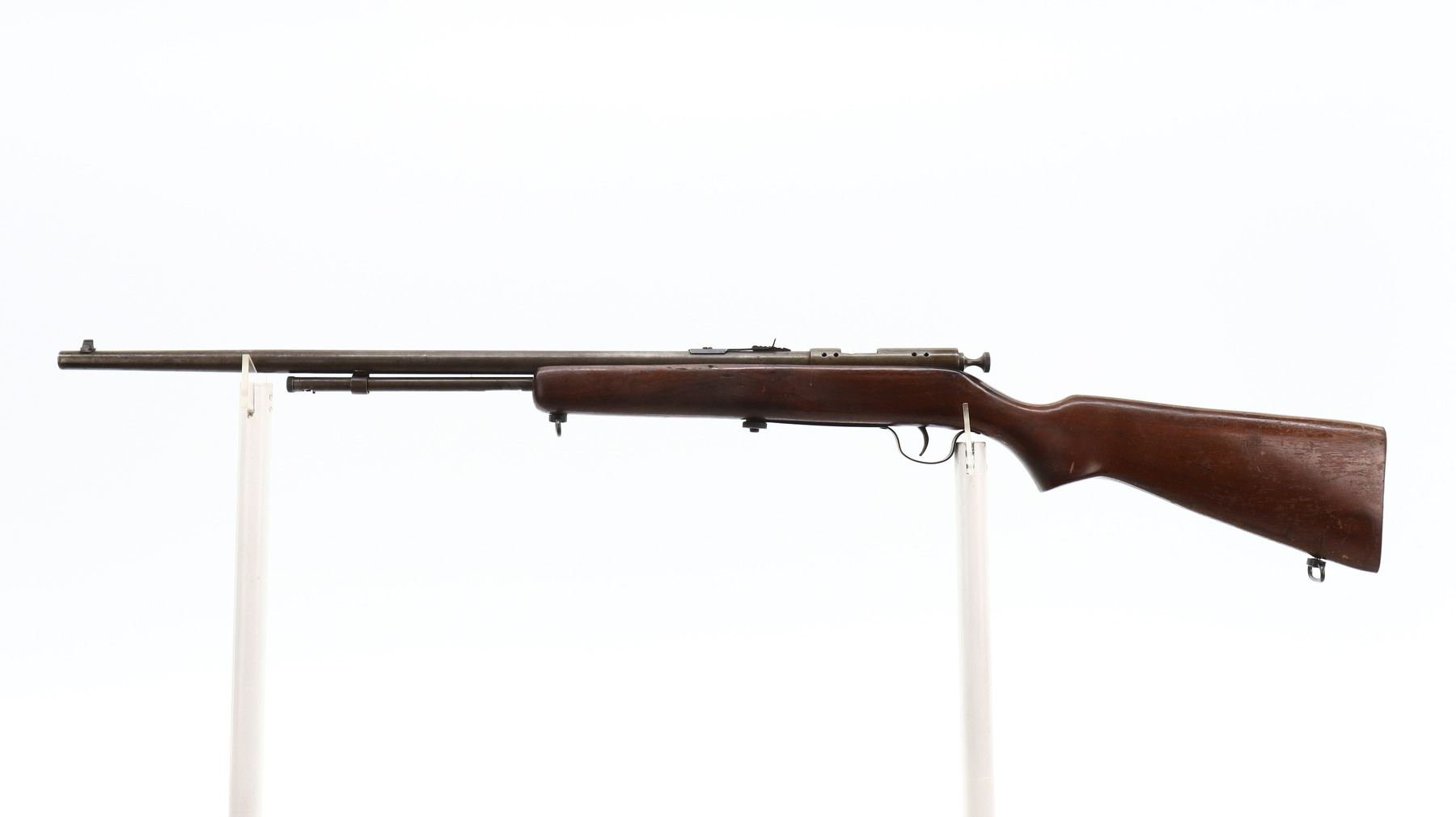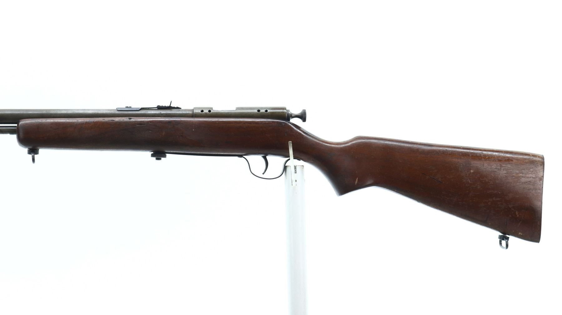3/10, COOEY, MODEL: 60, CALIBER:22 LR, BORE IS GOOD. BLADE FRONT SIGHT, ADJUSTABLE U NOTCHED REAR SIGHT, RECEIVER DRILLED AND TAPPED FOR SCOPE MOUNT. ONE PIECE SMOOTH WOOD STOCK, PISTOL GRIP, SMOOTH STEEL BUTT PLATE, SLING SWIVELS, 3/4 LENGTH MAG TUBE. METAL FINISH SILVER GREY WITH LIGHT RUST SPECKLES, SCRATCHES, HANDLING MARKS AND WEAR. STOCK SHOWS MARKS, SCRATCHES AND WEAR. , ACTION: BOLT ACTION RIFLE, BARREL LENGTH: 27", SERIAL # NA, CONDITION: 3/10, CLASS: CANADIAN NON RESTRICTED