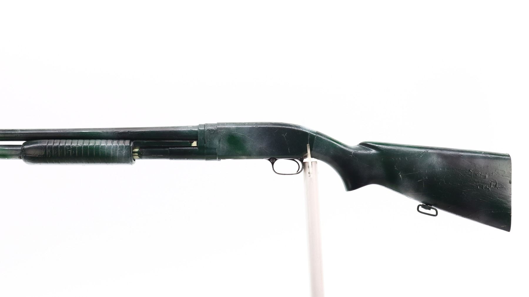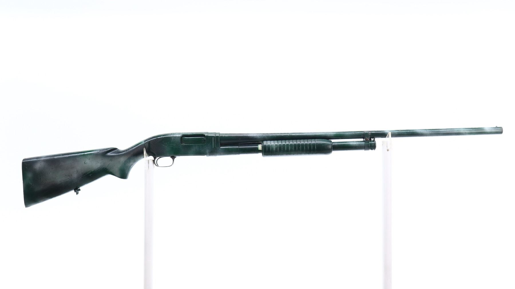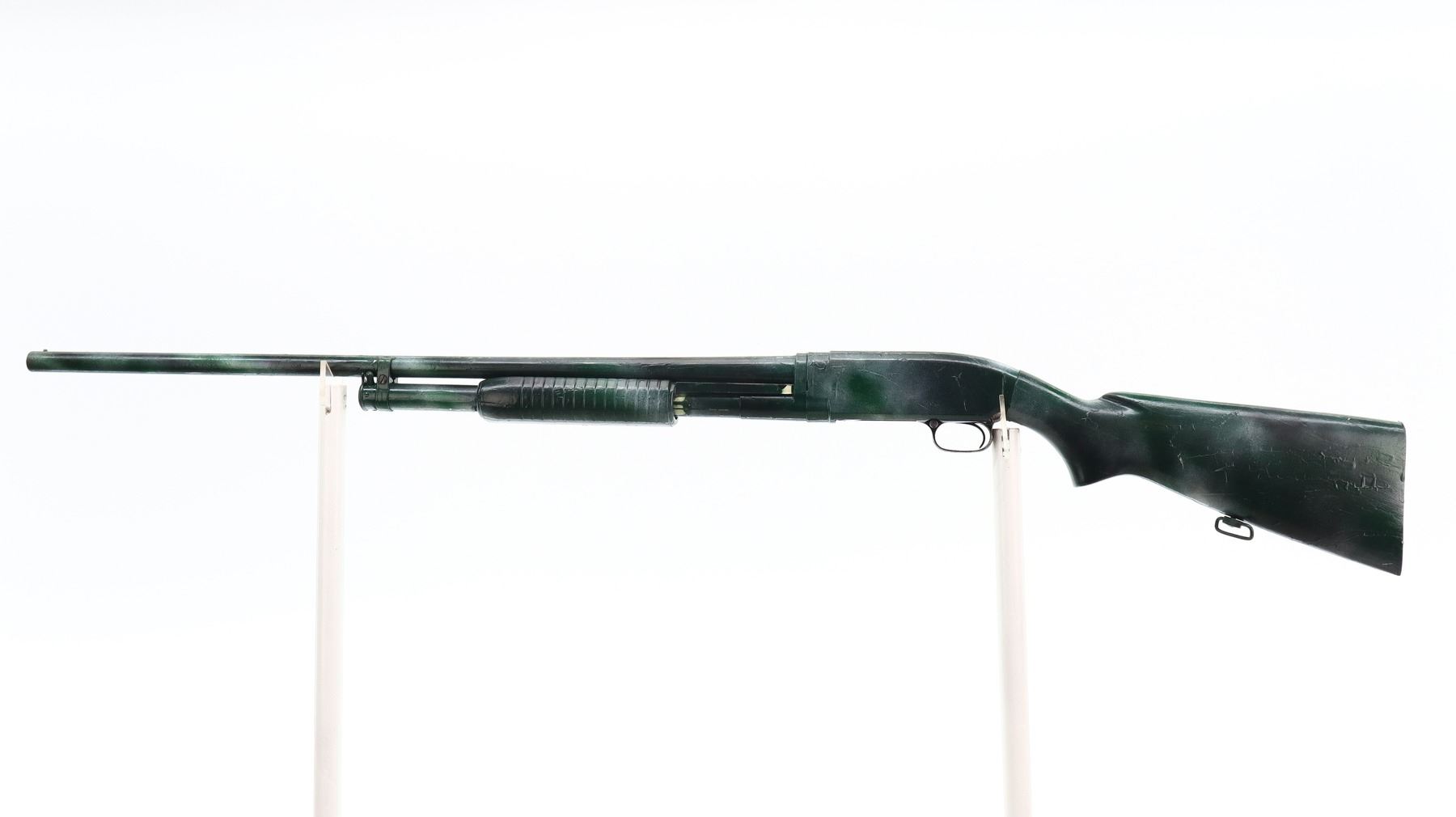 2/10, WINCHESTER, MODEL: 12, CALIBER:12 G X 2 3/4", BORE IS VERY GOOD. MANUFACTURED 1950. FIXED FULL CHOKE. SILVER BEAD, ROUND BARREL, COMPLETE SHOTGUN HAS BEEN PAINTED GREEN CAMO WITH A THICK LAYER OF PAINT. TWO PIECE WOOD STOCKS, GROOVED FOREND, PISTOL GRIP, MISSING BUTT PLATE, HAS REAR SWIVEL ONLY. METAL FINISH SHOWS SCRATCHES, HANDLING MARKS AND WEAR. STOCKS SHOWS MARKS, SCRATCHES AND WEAR. , ACTION: PUMP ACTION SHOTGUN, BARREL LENGTH: 30", SERIAL # 1290114, CONDITION: 2/10, CLASS: CANADIAN NON RESTRICTED