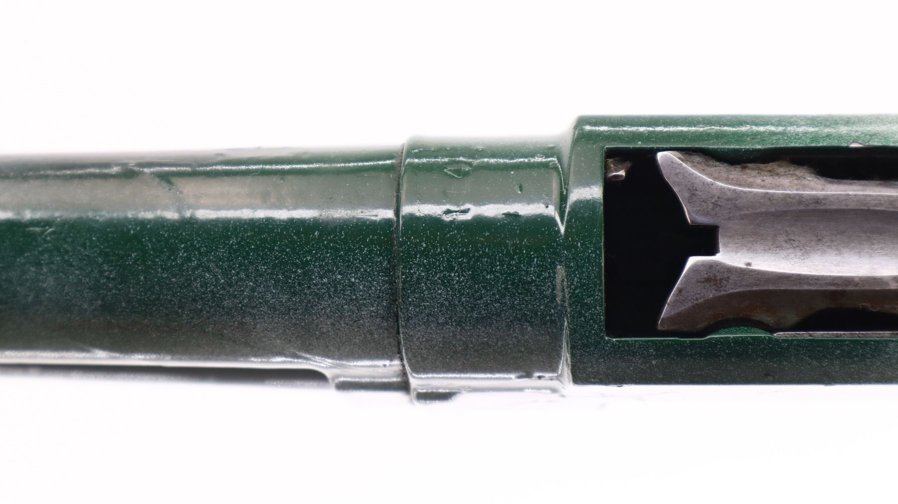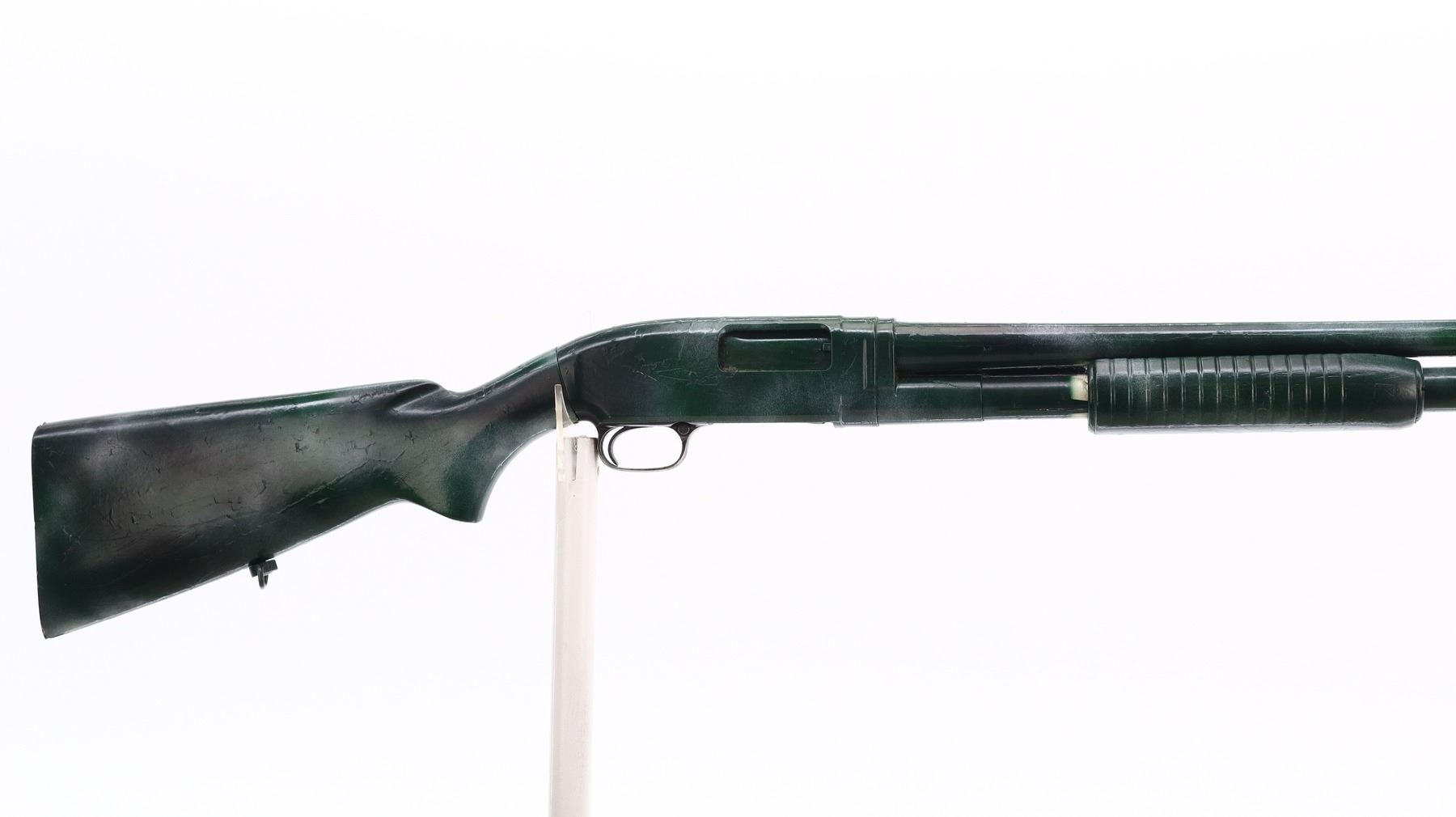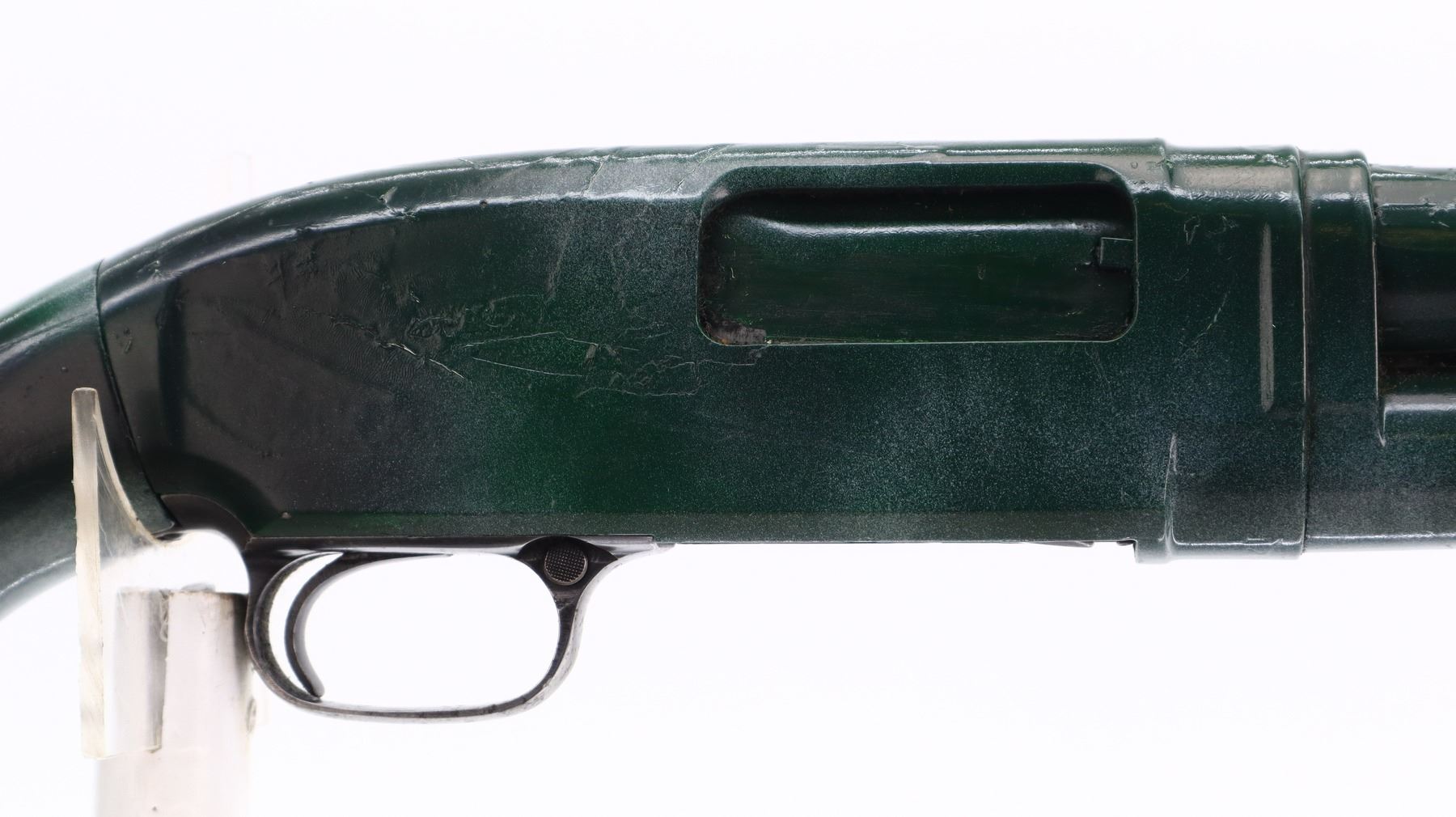 2/10, WINCHESTER, MODEL: 12, CALIBER:12 G X 2 3/4", BORE IS VERY GOOD. MANUFACTURED 1950. FIXED FULL CHOKE. SILVER BEAD, ROUND BARREL, COMPLETE SHOTGUN HAS BEEN PAINTED GREEN CAMO WITH A THICK LAYER OF PAINT. TWO PIECE WOOD STOCKS, GROOVED FOREND, PISTOL GRIP, MISSING BUTT PLATE, HAS REAR SWIVEL ONLY. METAL FINISH SHOWS SCRATCHES, HANDLING MARKS AND WEAR. STOCKS SHOWS MARKS, SCRATCHES AND WEAR. , ACTION: PUMP ACTION SHOTGUN, BARREL LENGTH: 30", SERIAL # 1290114, CONDITION: 2/10, CLASS: CANADIAN NON RESTRICTED
