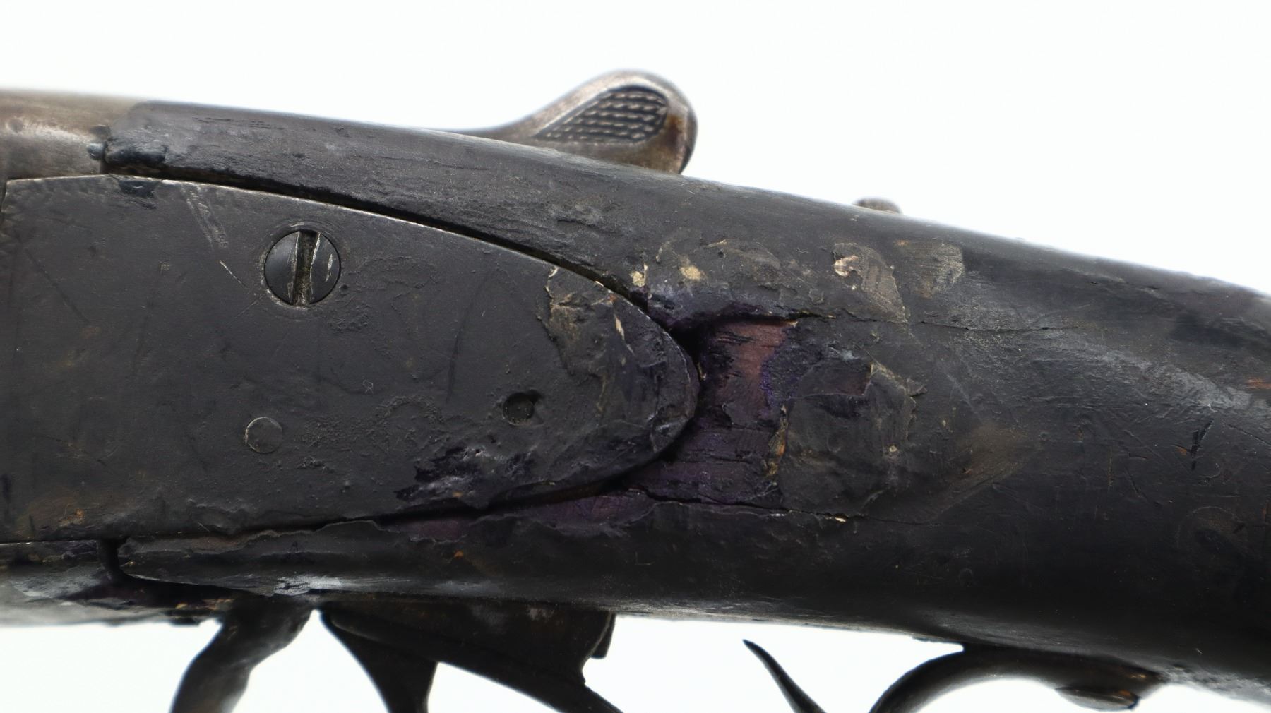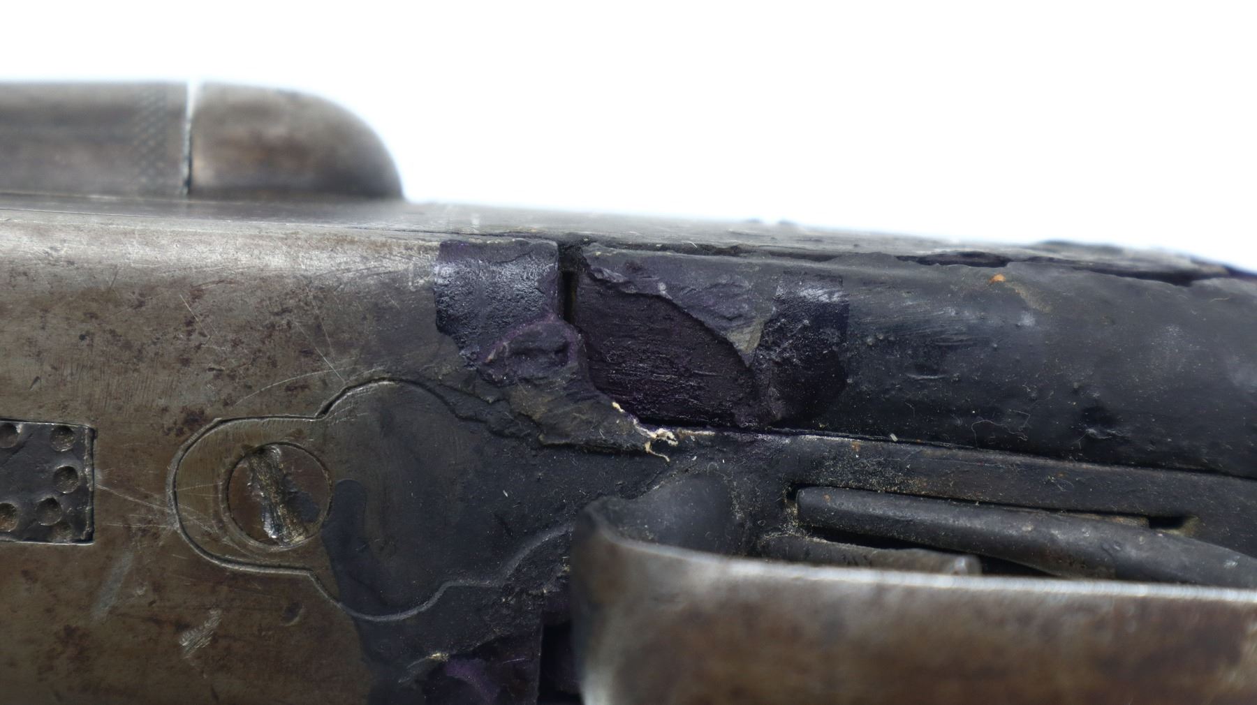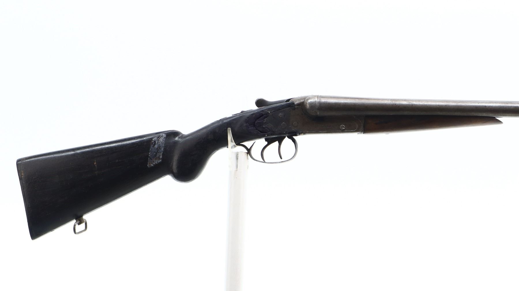 PARTS GUN, J.MANTON & CO, MODEL: SIDE BY SIDE HAMMERLESS , CALIBER:12 G X 2 3/4", BORES ARE POOR AND PITTED. FIXED IC AND MOD CHOKES. BRASS BEAD. DAMASCUS BARRELS. LOOSE ON FACE. SIDE LOCKS. AUTOMATIC SAFETY. ACTION DOES NOT FUNCTION. EXTRACTOR. DOUBLE TRIGGERS. TWO PIECE WOOD STOCKS. REPAIRED FOREND. PISTOL GRIP. STOCK IS DAMAGED BEHIND RECEIVER AND LOCKS. GROOVED BLACK POLYMER BUTT PLATE. SLING SWIVELS. BARREL AND LOCKING LUGS SHOW STAKE MARKS. METAL FINISH TURNING BROWN WITH LIGHT RUST SPECKLES, SCRATCHES, HANDLING MARKS AND WEAR. STOCKS SHOW MARKS, SCRATCHES AND WEAR. , ACTION: HINGE SIDE BY SIDE SHOTGUN , BARREL LENGTH: 30", SERIAL # 418, CONDITION: PARTS GUN, THIS ITEM IS SOLD FOR PARTS USE ONLY. SOME PARTS AND COMPONENTS MAY NOT BE PRESENT AND OR FUNCTIONAL. UNDER NO CIRCUMSTANCES ATTEMPT TO USE THIS ITEM AS A FUNCTIONAL FIREARM., CLASS: CANADIAN NON RESTRICTED