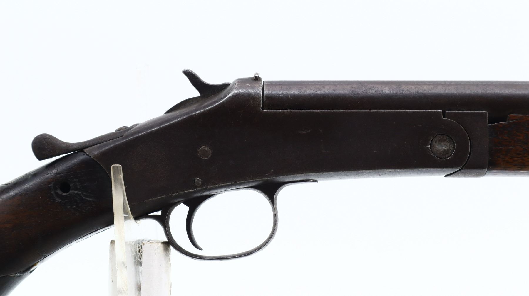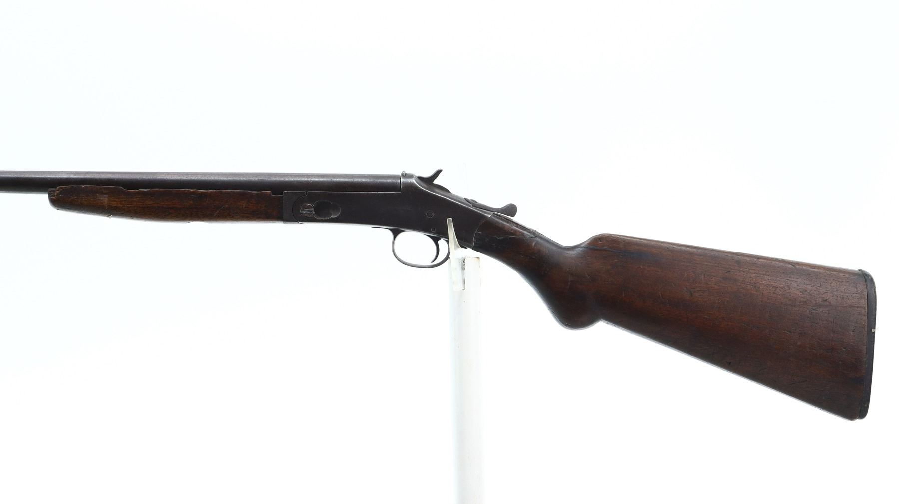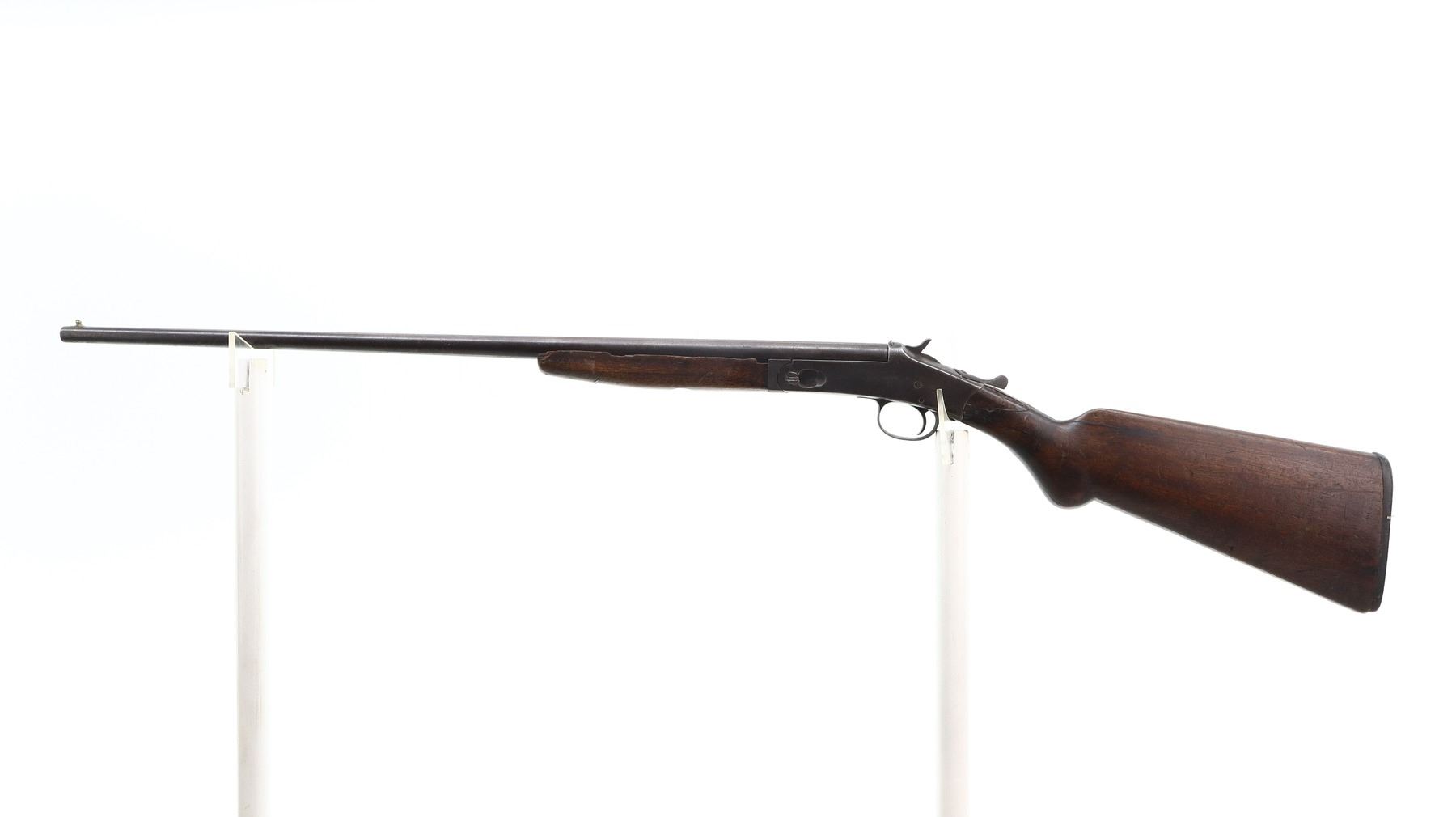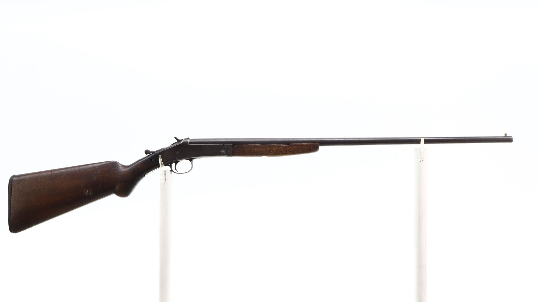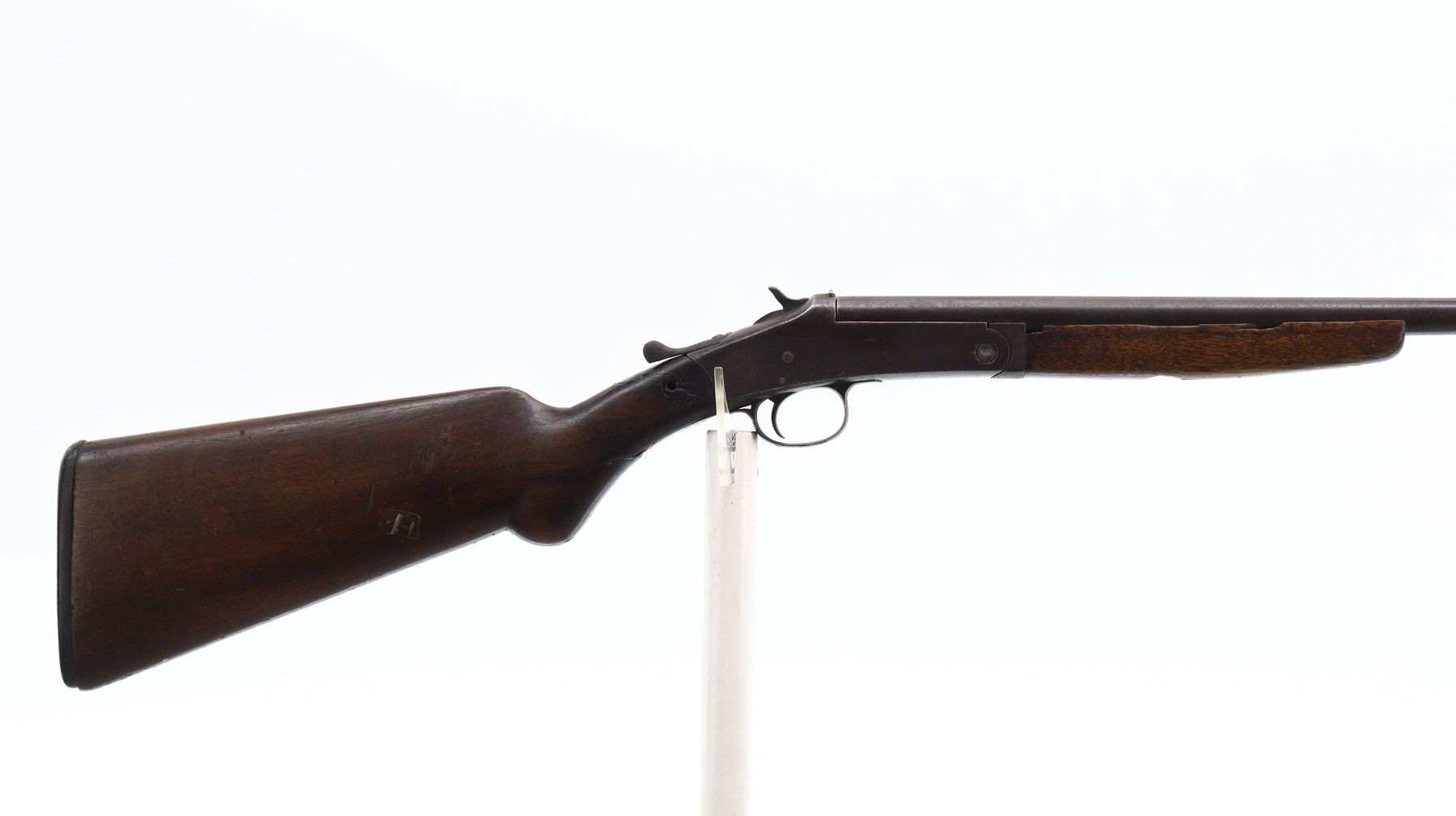 PARTS GUN, HARRINGTON & RICHARDSON, MODEL: SINGLE SHOT, CALIBER:44 SHOT , BORE IS POOR AND PITTED. BEAD IS MISSING. HOLE REMAINS. SMALL BRASS SIGHT SOLDIERED ON MUZZLE. U NOTCHED REAR SIGHT. CHECKERED SPUR HAMMER. EXTRACTOR. HINGE PIN HAS BEEN MODIFIED. TWO PIECE SMOOTH WOOD STOCKS. FOREARM SCREW REPLACED. PISTOL GRIP. CRACKED AND BROKEN AT WRIST. CHECKERED BLACK POLYMER BUTT PLATE. METAL FINISH TURNING BROWN WITH PITTING, RUST, HANDLING MARKS AND WEAR. STOCK SHOWS MARKS, SCRATCHES AND WEAR. , ACTION: HINGE SINGLE SHOT SHOTGUN , BARREL LENGTH: 25.5", SERIAL # 24789, CONDITION: PARTS GUN, THIS ITEM IS SOLD FOR PARTS USE ONLY. SOME PARTS AND COMPONENTS MAY NOT BE PRESENT AND OR FUNCTIONAL. UNDER NO CIRCUMSTANCES ATTEMPT TO USE THIS ITEM AS A FUNCTIONAL FIREARM., CLASS: CANADIAN NON RESTRICTED