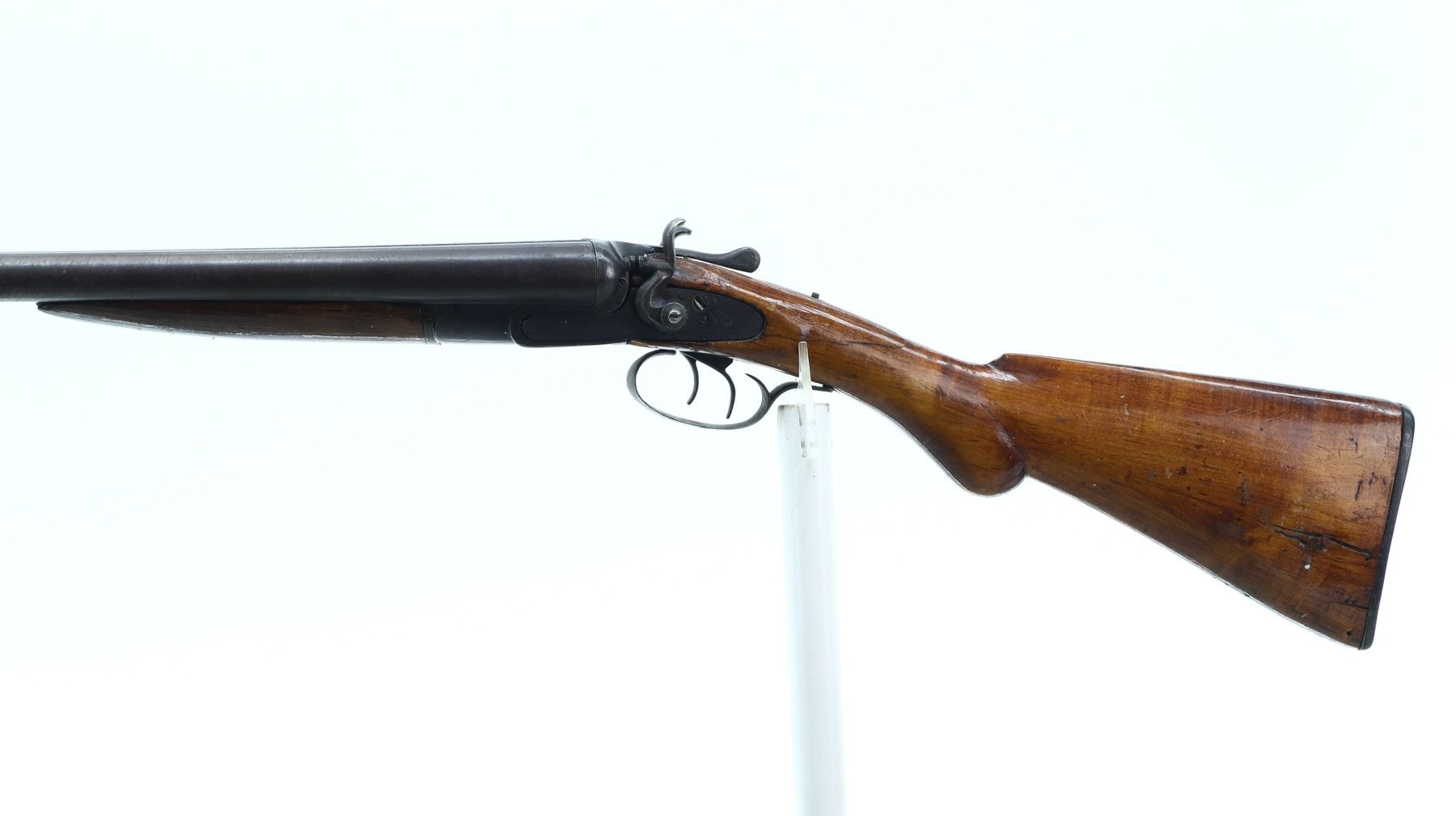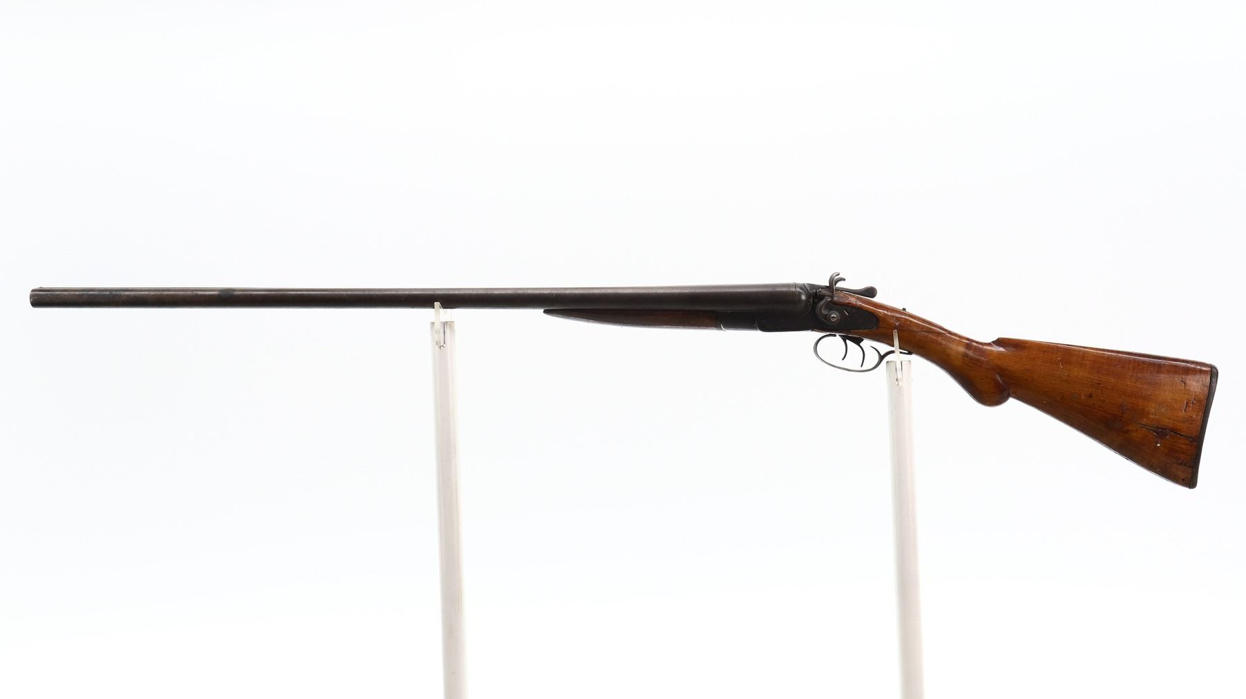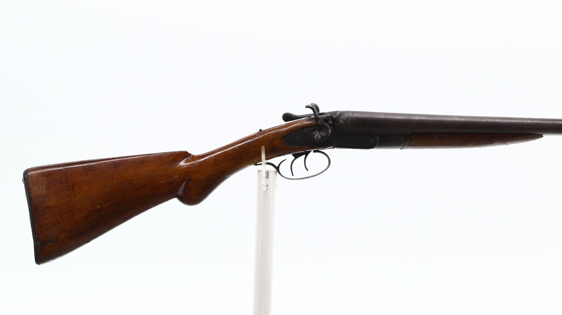 PARTS GUN, THOMAS HAYNES, MODEL: SIDE BY SIDE HAMMERGUN , CALIBER:12 G X 2 5/8", BORES ARE POOR AND PITTED. FIXED IM CHOKES. BRASS BEAD. DAMASCUS BARRELS WITH SMOOTH RIB, LOOSE ON FACE. SIDE LOCKS WITH HAMMERS, DON'T FUNCTION. HAMMERS ARE LOOSE, SCREWS REPLACED. DOUBLE TRIGGERS. EXTRACTOR. TRIGGER GUARD IS BROKEN. TWO PIECE REPLACED WOOD STOCKS. FOREARM MISSING TIP. PISTOL GRIP, CHIPPED, CRACKED AND LOOSE. CHECKERED BLACK POLYMER BUTT PLATE. STOCK SHOWS AGE CRACKS. METAL FINISH TURNING BROWN WITH PITTING, LIGHT RUST, SCRATCHES, HANDLING MARKS AND WEAR. STOCKS SHOW MARKS, SCRATCHES AND WEAR. , ACTION: HINGE SIDE BY SIDE SHOTGUN , BARREL LENGTH: 30", SERIAL # 16, CONDITION: PARTS GUN, THIS ITEM IS SOLD FOR PARTS USE ONLY. SOME PARTS AND COMPONENTS MAY NOT BE PRESENT AND OR FUNCTIONAL. UNDER NO CIRCUMSTANCES ATTEMPT TO USE THIS ITEM AS A FUNCTIONAL FIREARM., CLASS: CANADIAN NON RESTRICTED