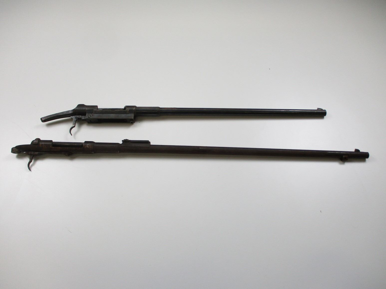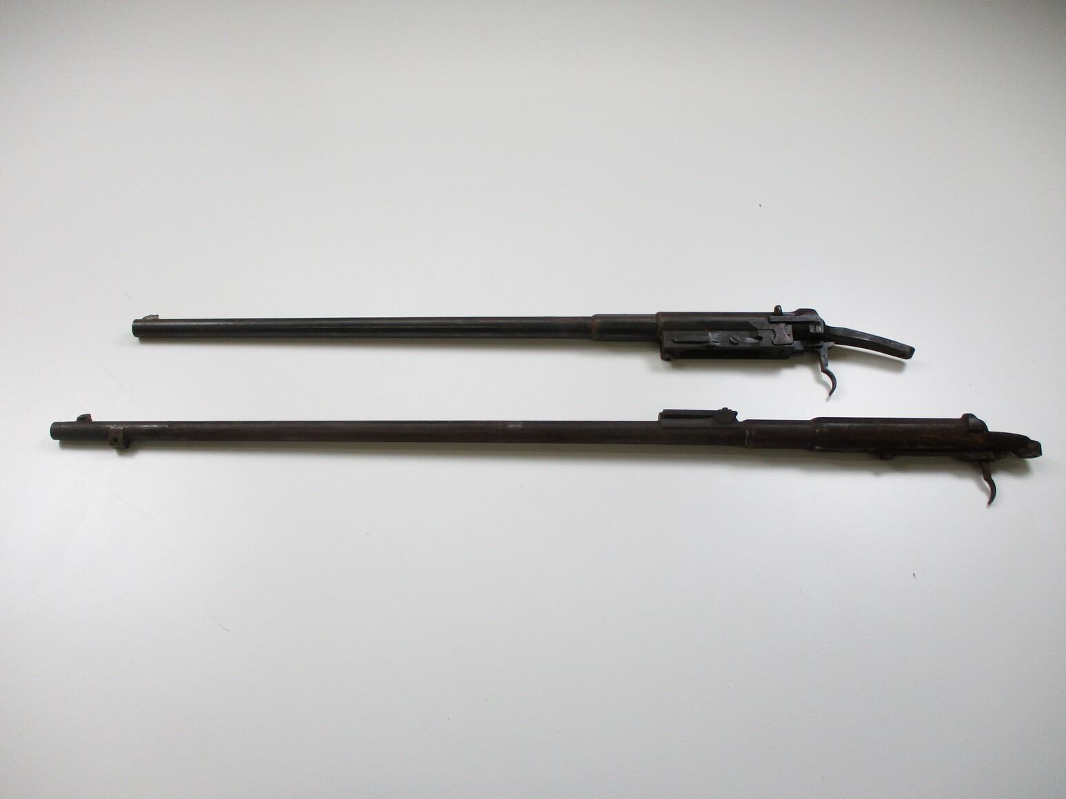 71/84 MAUSER ACTIONS & BARRELS , LOT OF 2. ACTIONS MAY HAVE SOME SMALL PARTS, INCLUDES TRIGGER MECHS, WITH VARIOUS FAINT MARKINGS & APPROX. 29.25" & 22.5" BARRELS, POOR BORES, PARTS MAY REQUIRE FITTING. PAL REQUIRED FOR THIS LOT.